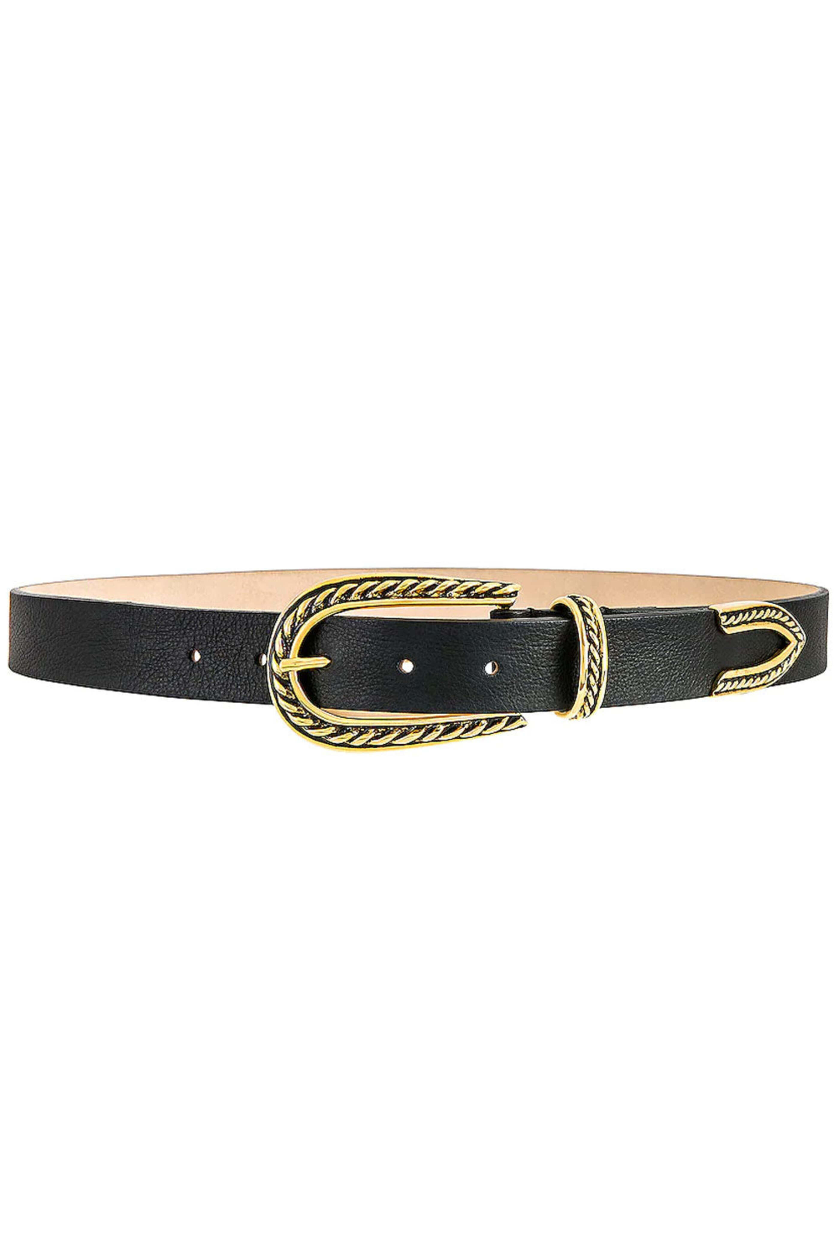 B-Low the Belt Sophia Belt in Black and Gold. Adjustable. Tapered tip with metal detail. Single loop keeper. Antique gold buckle hardware. Leather.