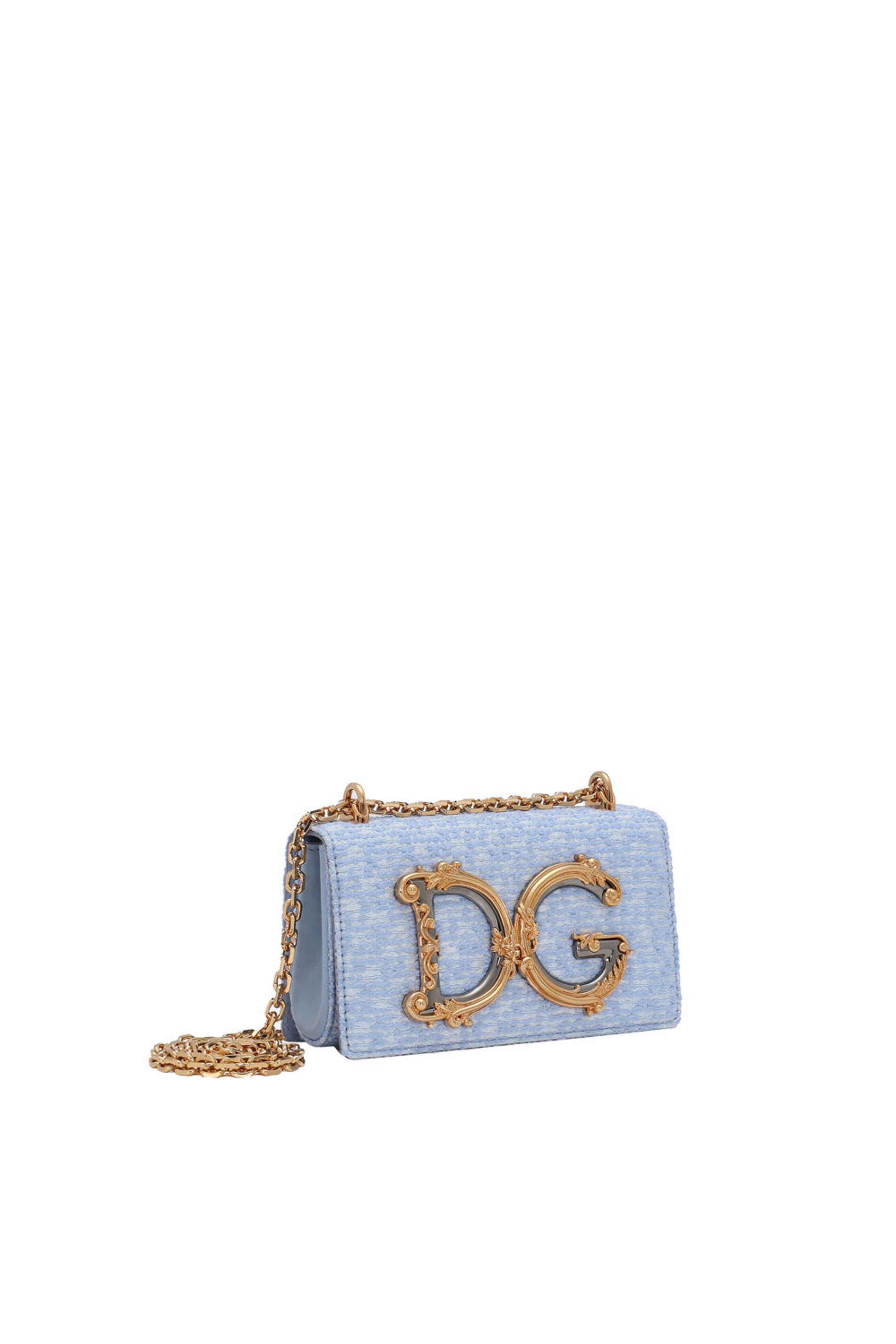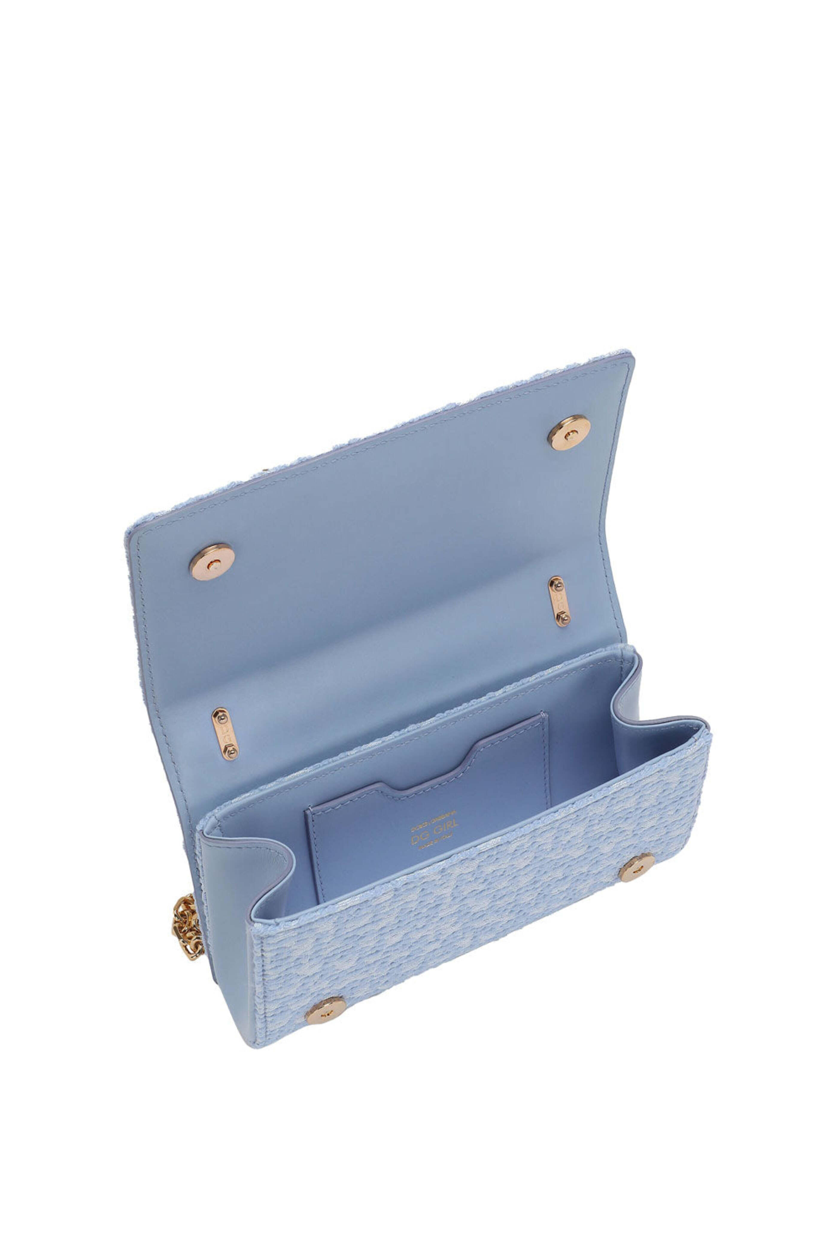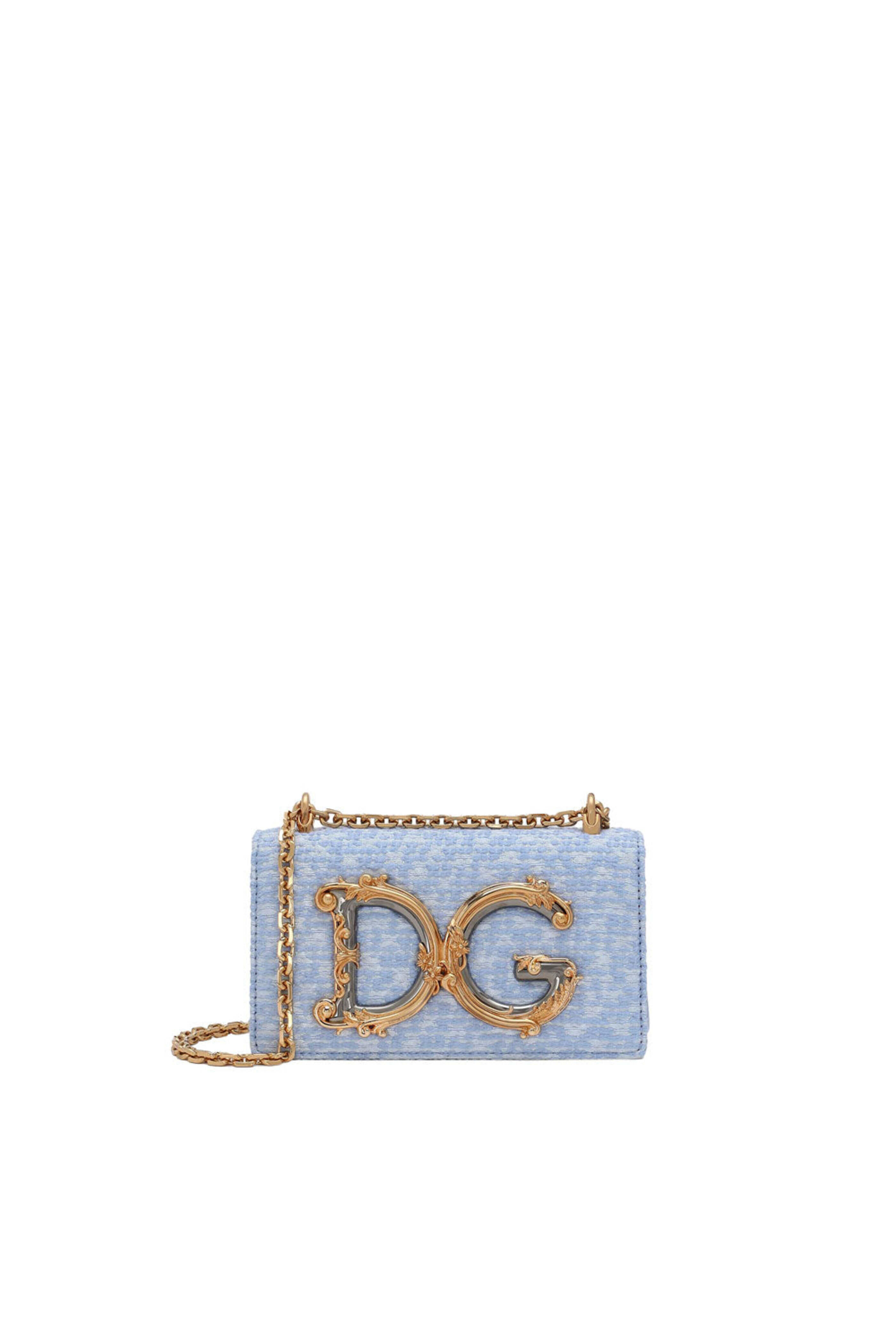 Dolce & Gabbana Mini Bouclé Shoulder Bag. Flap top with double snap closures . Adjustable shoulder chain. Interior slip pocket. DG logo in enameled ABS and metalized vintage gold. Gold hardware. Bouclé fabric outer. 7" W x 3.9 H x 1.3" D. 19.7" strap drop. Made in Italy.
