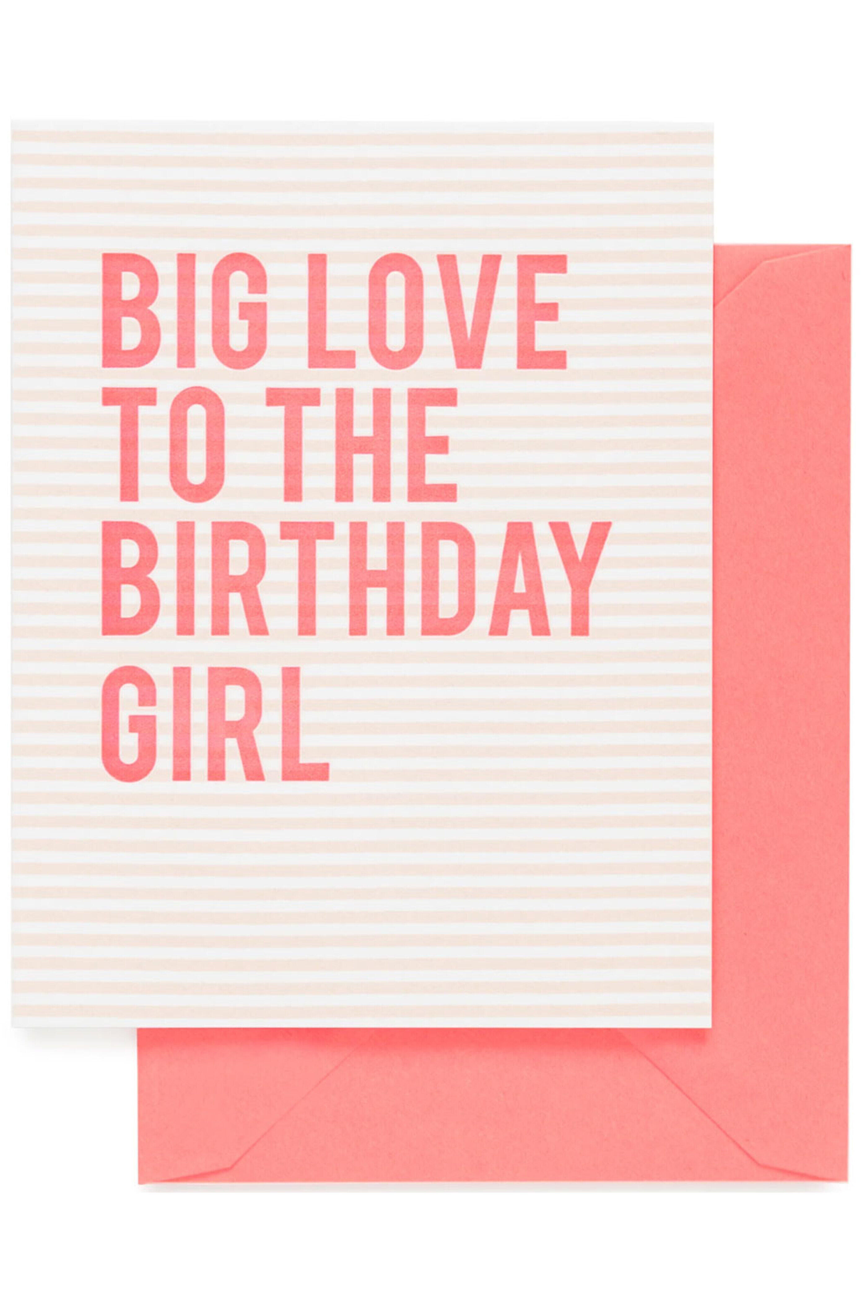 Sugar Paper Big Love For The Birthday Girl Card. Pale pink stripe paper. Neon coral ink. Letterpress printed. Neon coral envelope. 4.25 x 5.5. Hand printed in Los Angeles.