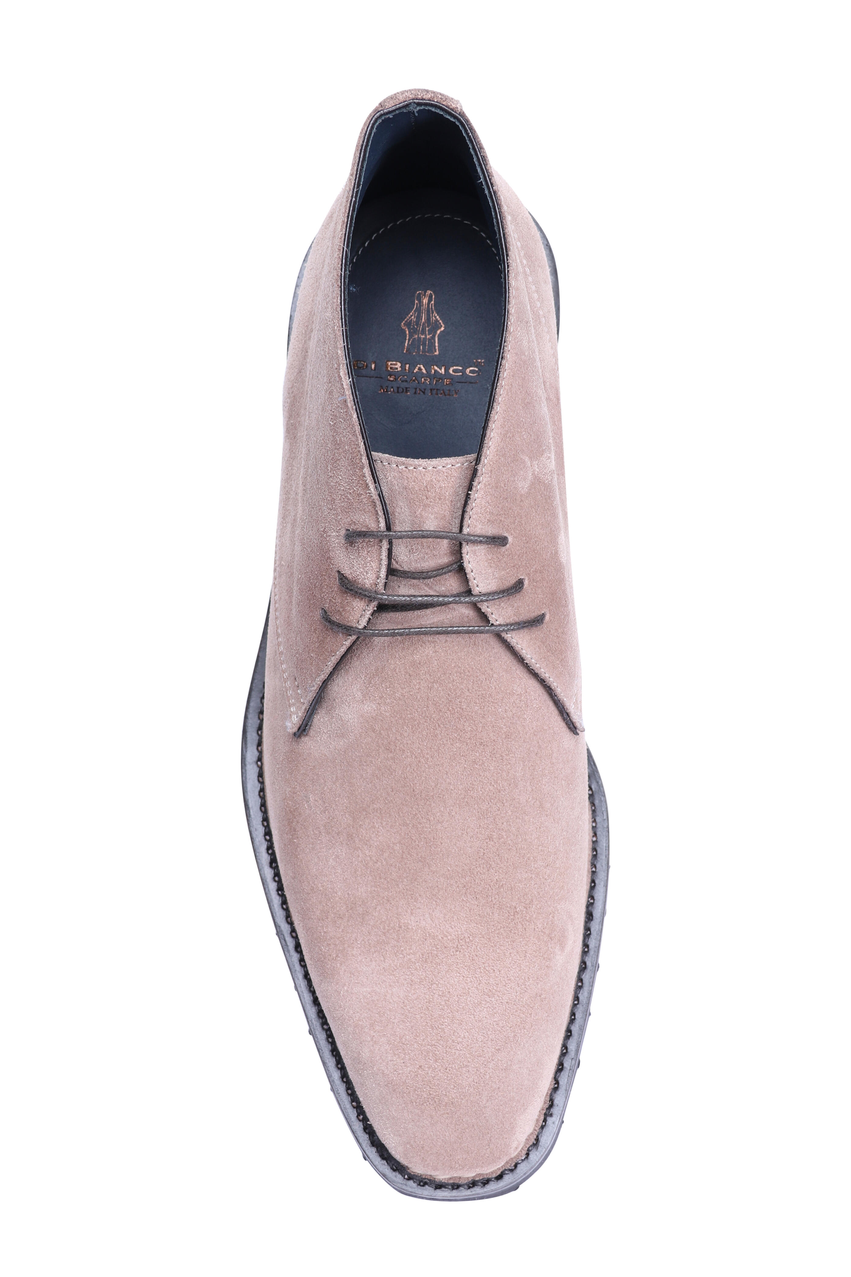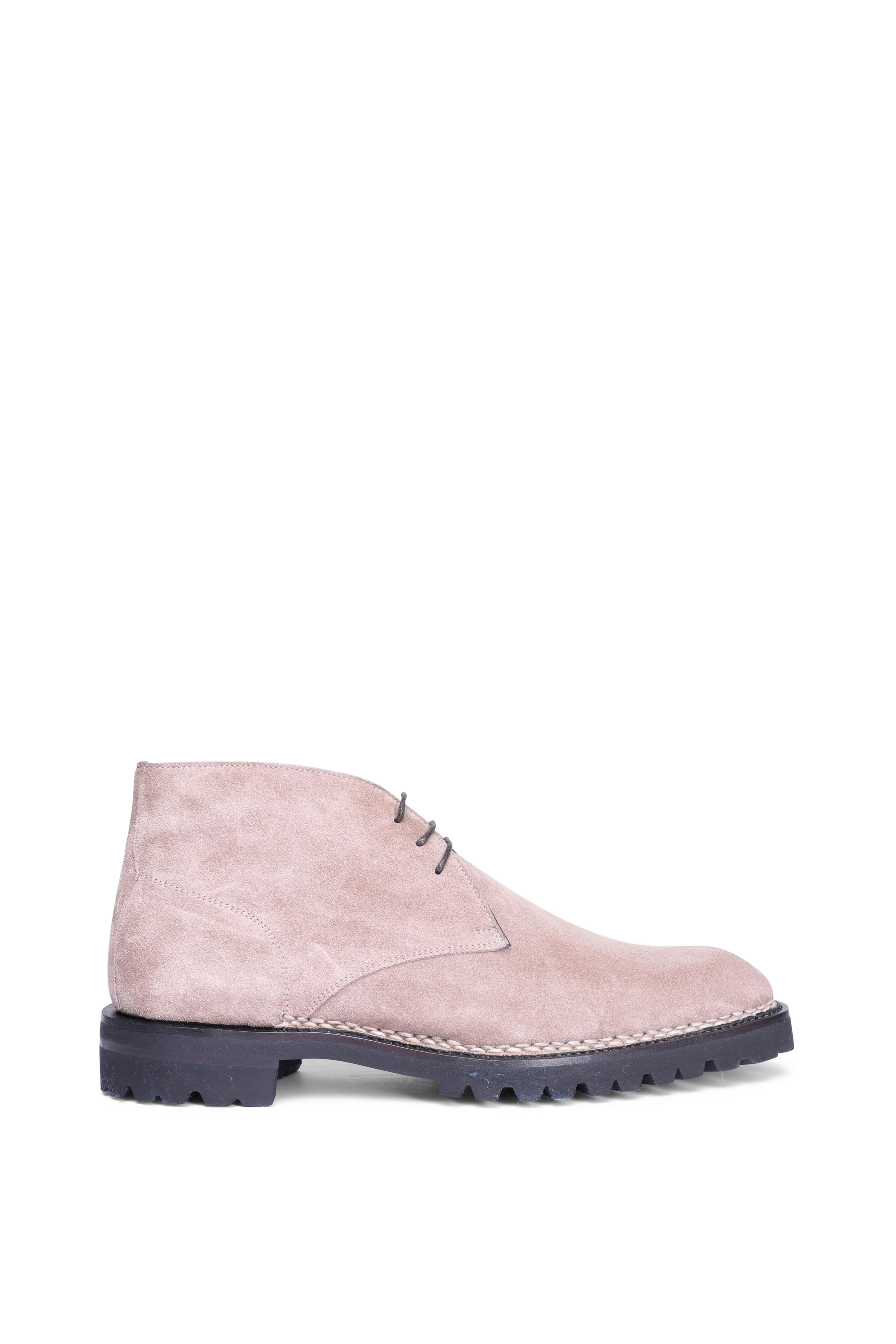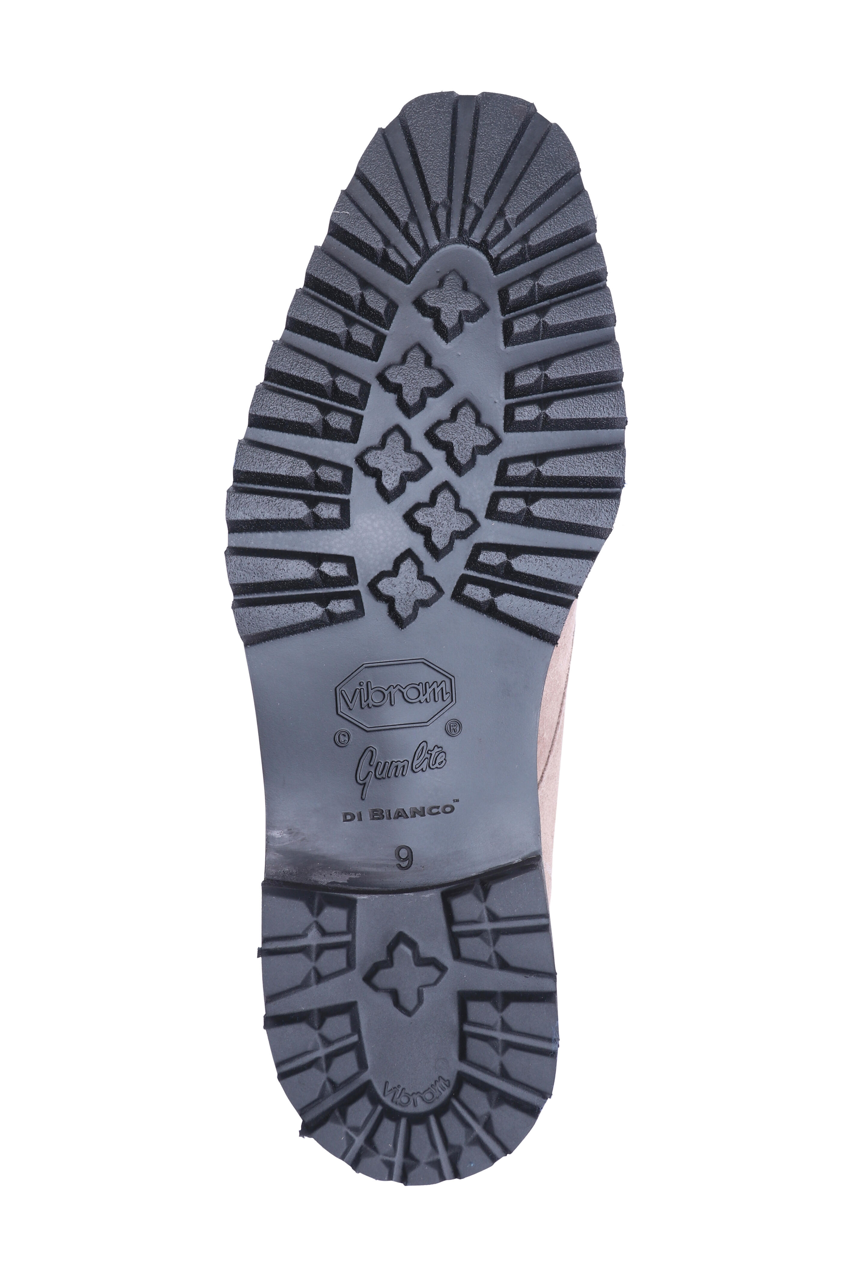 Suede upper. Leather lining. Rubber lug sole. Almond toe. Lace-up vamp. Waxed laces. Tonal stitching. Slip-on style. Made in Italy. All sizes listed are in US measurements.