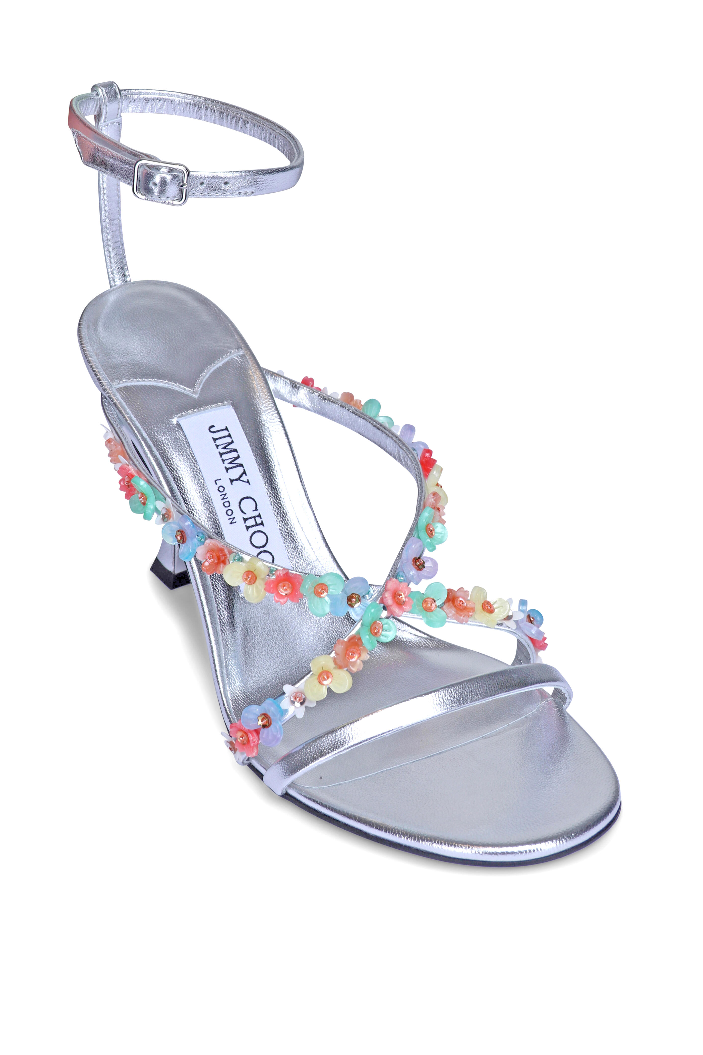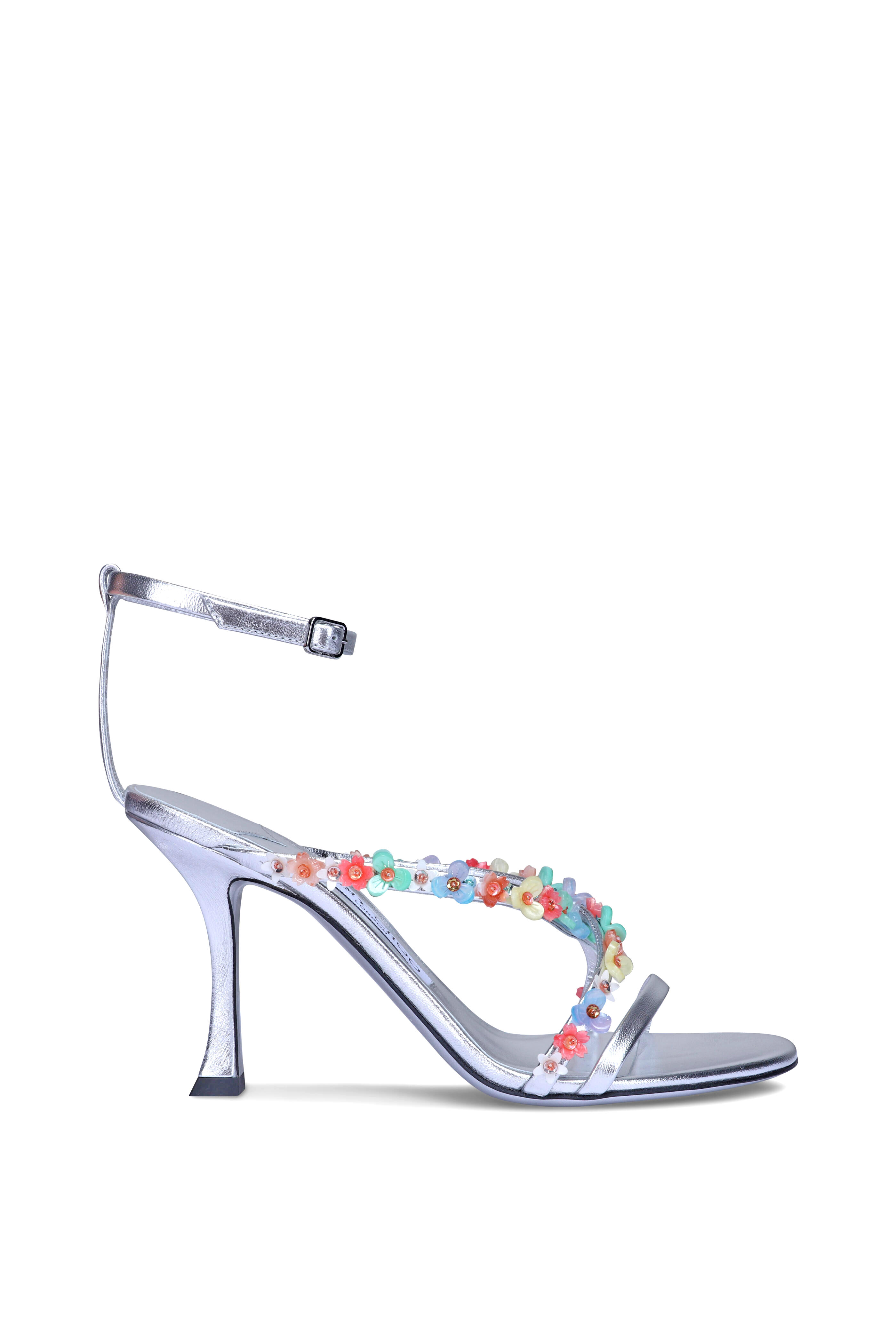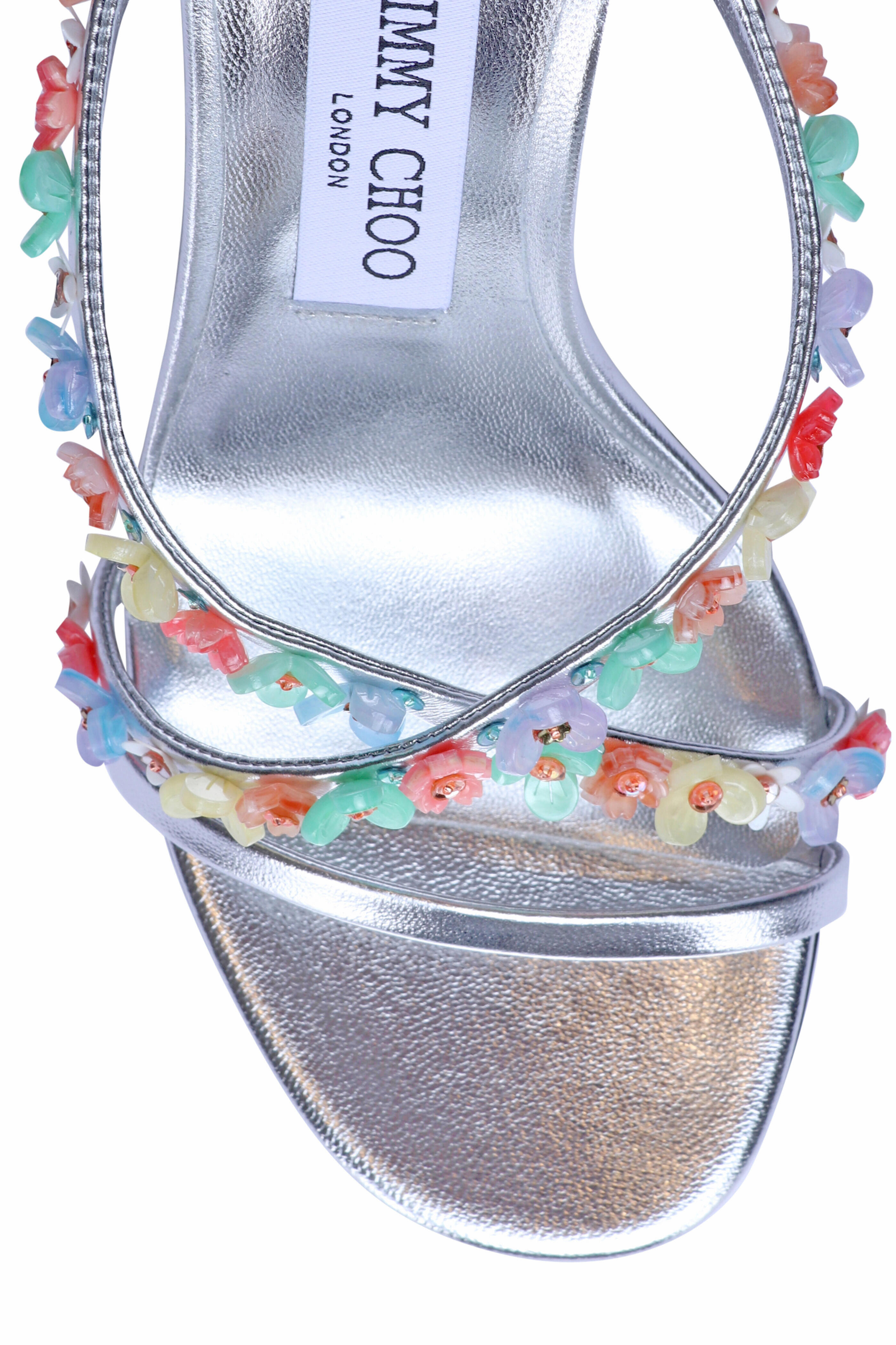 Metallic leather upper. Leather lining and sole. Open toe. Adjustable ankle buckle closure. Featuring individually hand-sewn resin blooms and multicolored beads. Criss-cross strappy vamp. Made in Italy. Heel measurement: 90mm.