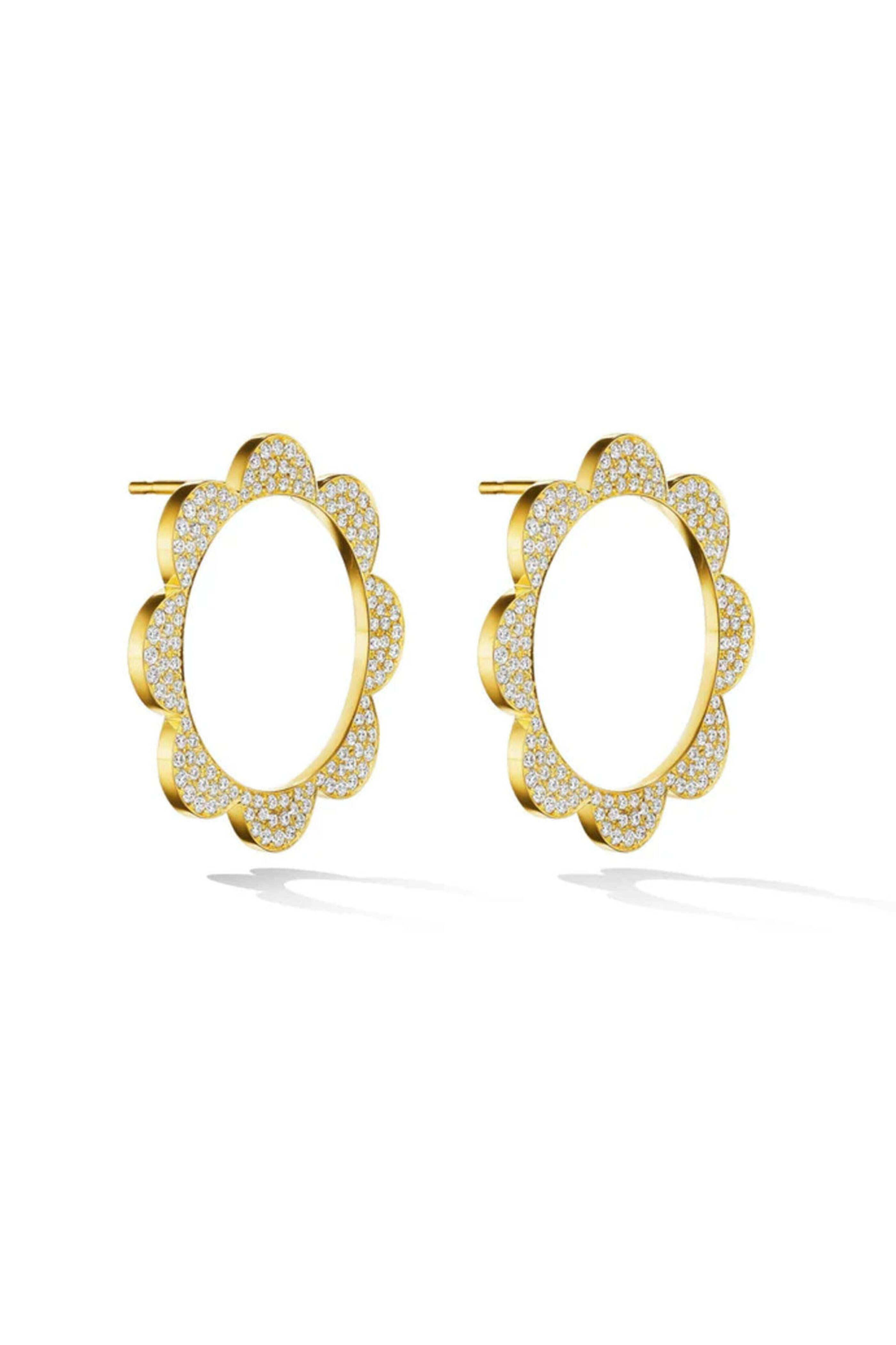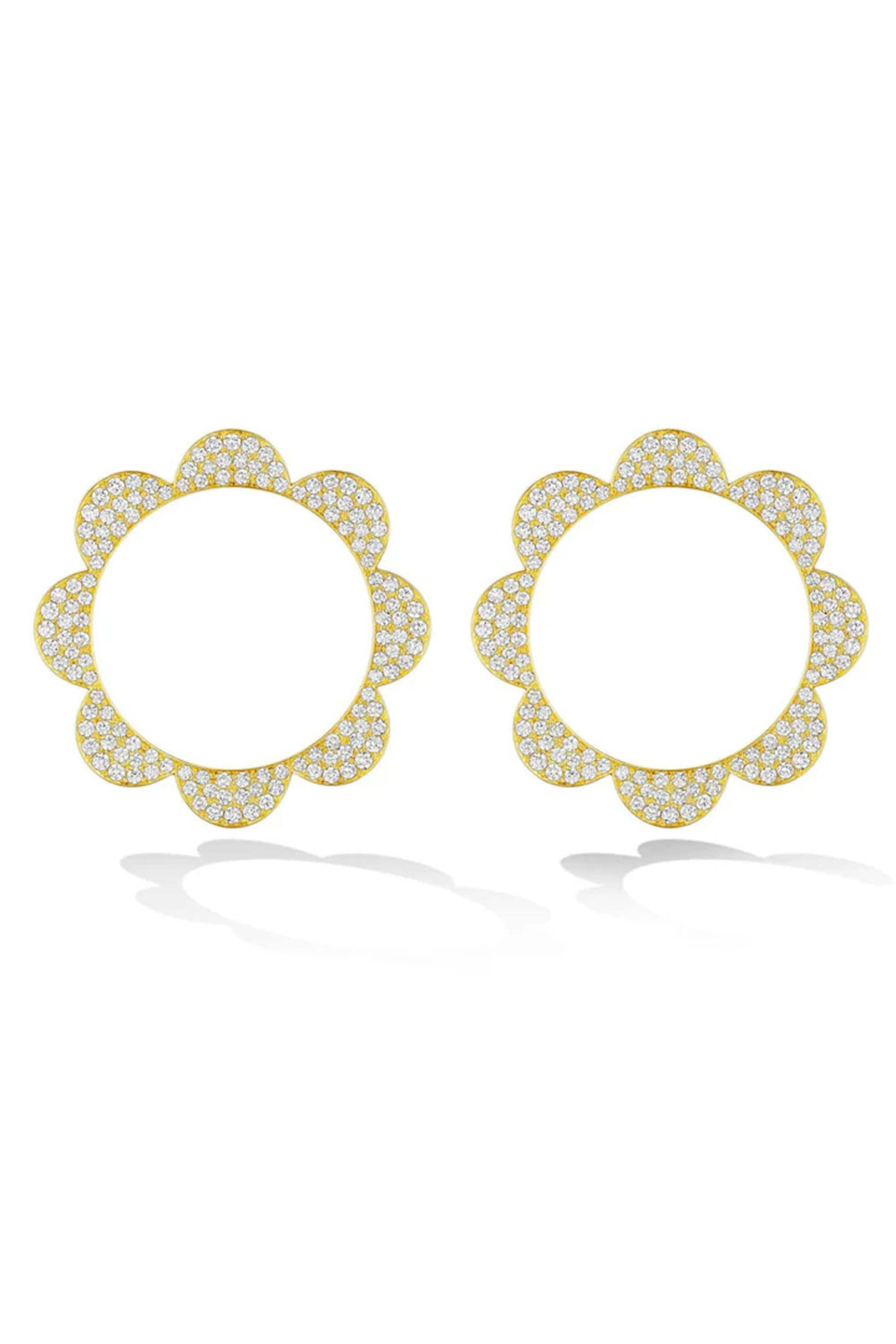 Cadar White Diamond Bloom Triplet Stud Earrings. 18k gold. Pavé diamond 1.20 total carat weight. Flower design. Stud design. Push back post.