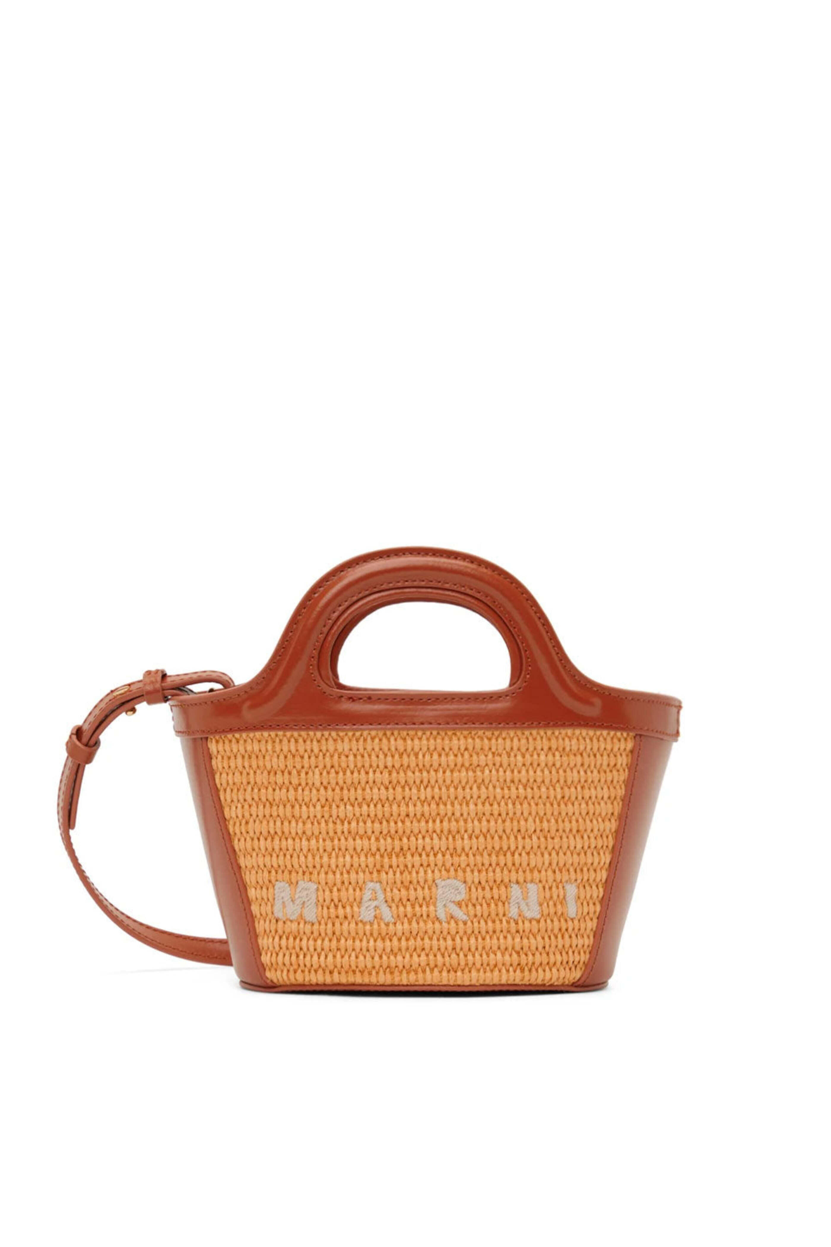 Marni Tropicalia Mini Tote in Natural. Pull-through post-stud tab at open throat. Integrated carry handles. Adjustable and detachable crossbody strap. Card slot interior. Raffia outer. Buffed calfskin trim. Cotton twill lining. 8W x 4.75H x 4D. Made in Italy.