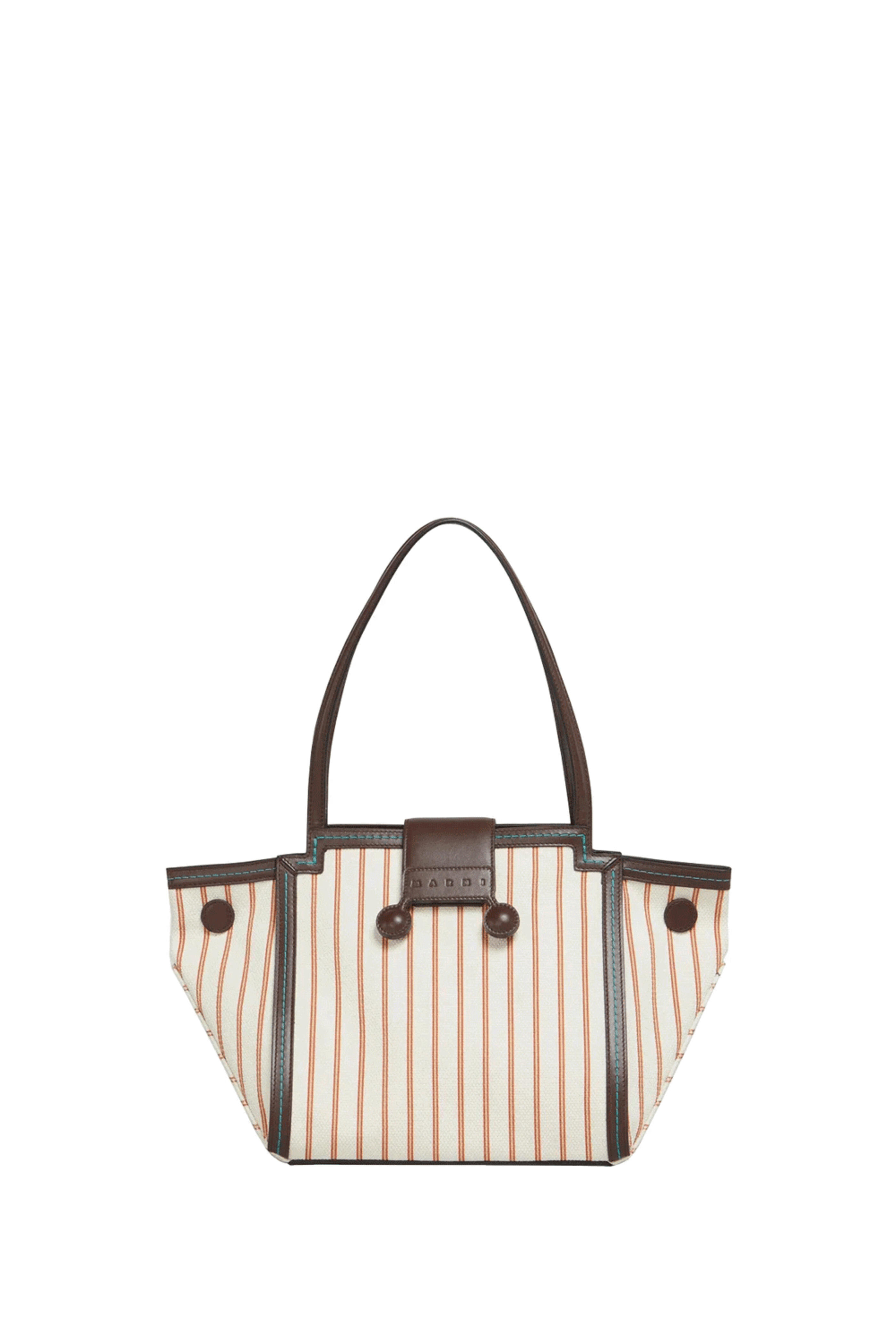 Marni Mini Riviera Striped Shoulder Bag in Red and White. Front flap with magnetic closure. Dual top handles. Two metal stud details. Magnetic side buttons. Trapeze-shape design. Striped canvas upper. Calfskin leather trim. Unlined. Made in Italy.