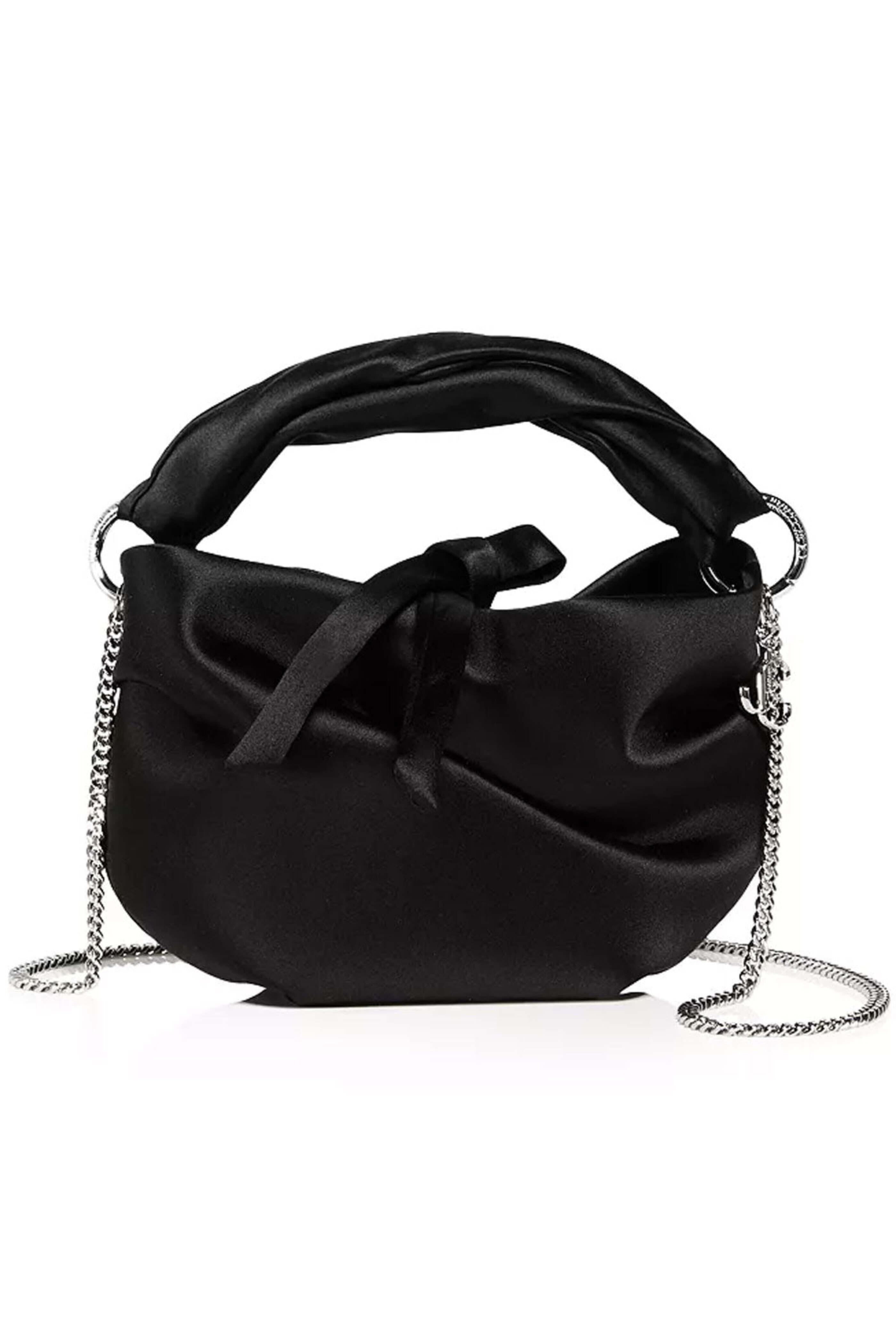 Jimmy Choo Bonny Small Satin Crossbody in Black. Loop closure. Top handle with twist detail. Removable chain strap. Interior slip pocket. Silver tone hardware. Viscose/silk outer. Lined. 7.9 W X 5.1 H X 3.1 D. 3.5 handle drop. 22 chain strap drop. Made in Italy.