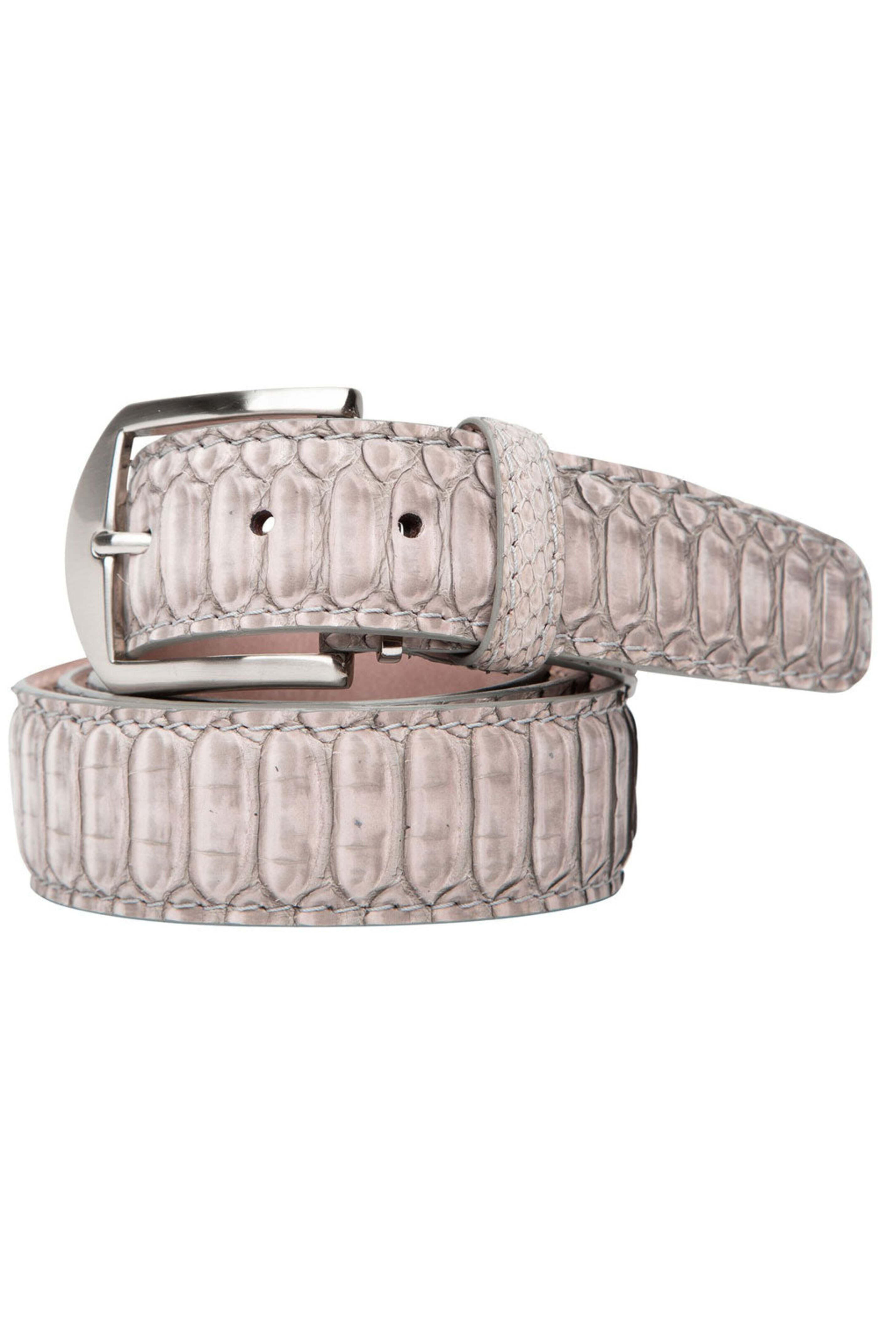 L.E.N. Sueded Python Belt in Tan. Adjustable with single loop keeper. Solid brass hardware in a brushed nickel finish. Tonal stitching. Suede python outer. 40 mm. Made in USA. L.E.N. belts are cut to fit. You may have your belt sized by the cobbler of your choice, or if you are local, we are happy to assist you in store.. You may also have your belt cut to size before it is shipped. Please note, once a belt is cut to size it is final sale and cannot be returned.. We recommend belt sizing to be 2 larger than your pant size. Please list your belt size in the order comments when placing your order. Please contact us for any questions about sizing.