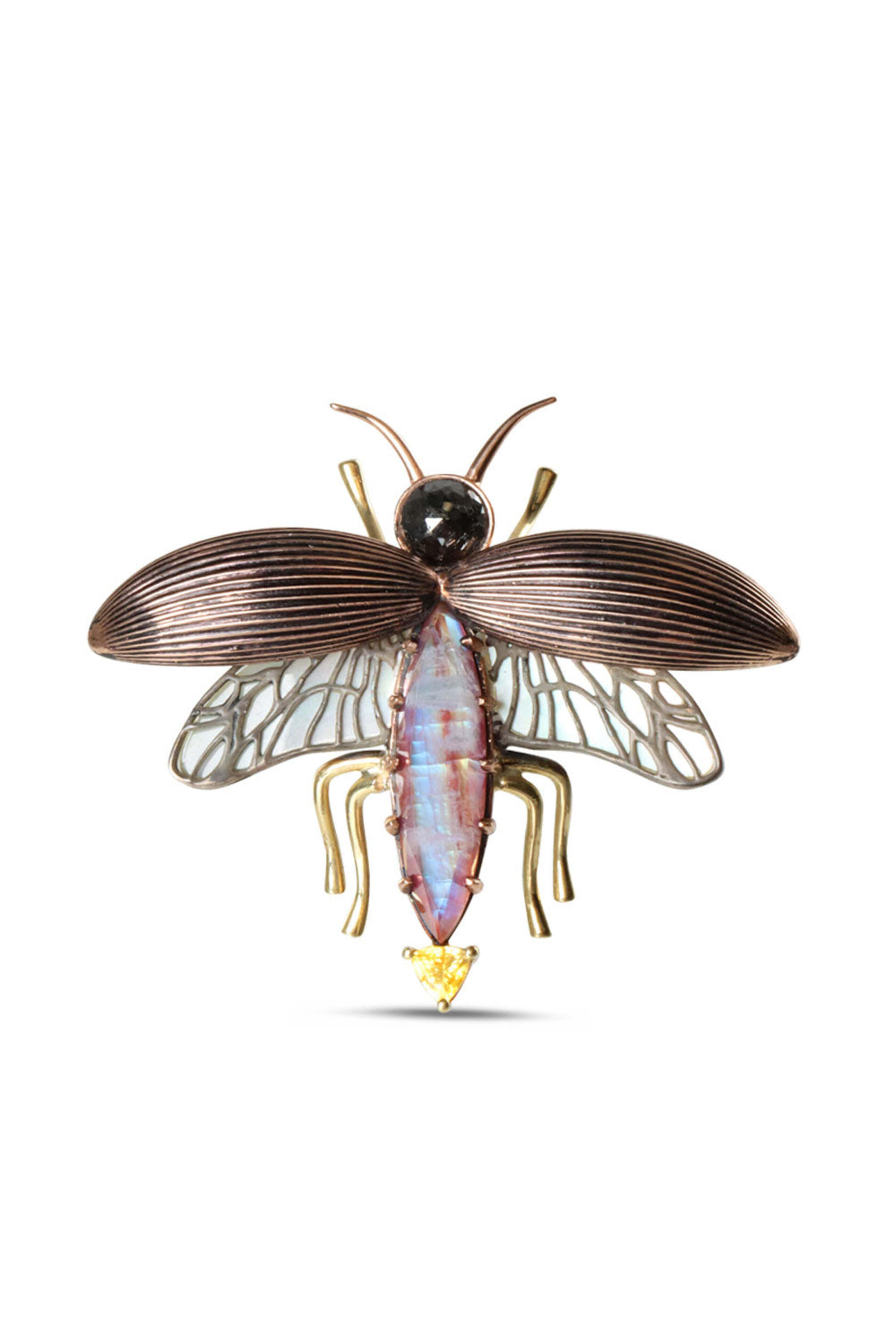 Ferocity Jewelry Firefly Brooch. 18k gold. Sterling silver. Black diamond. Yellow sapphire. Jasper. Moonstone. Engraved detailing. Firefly design.