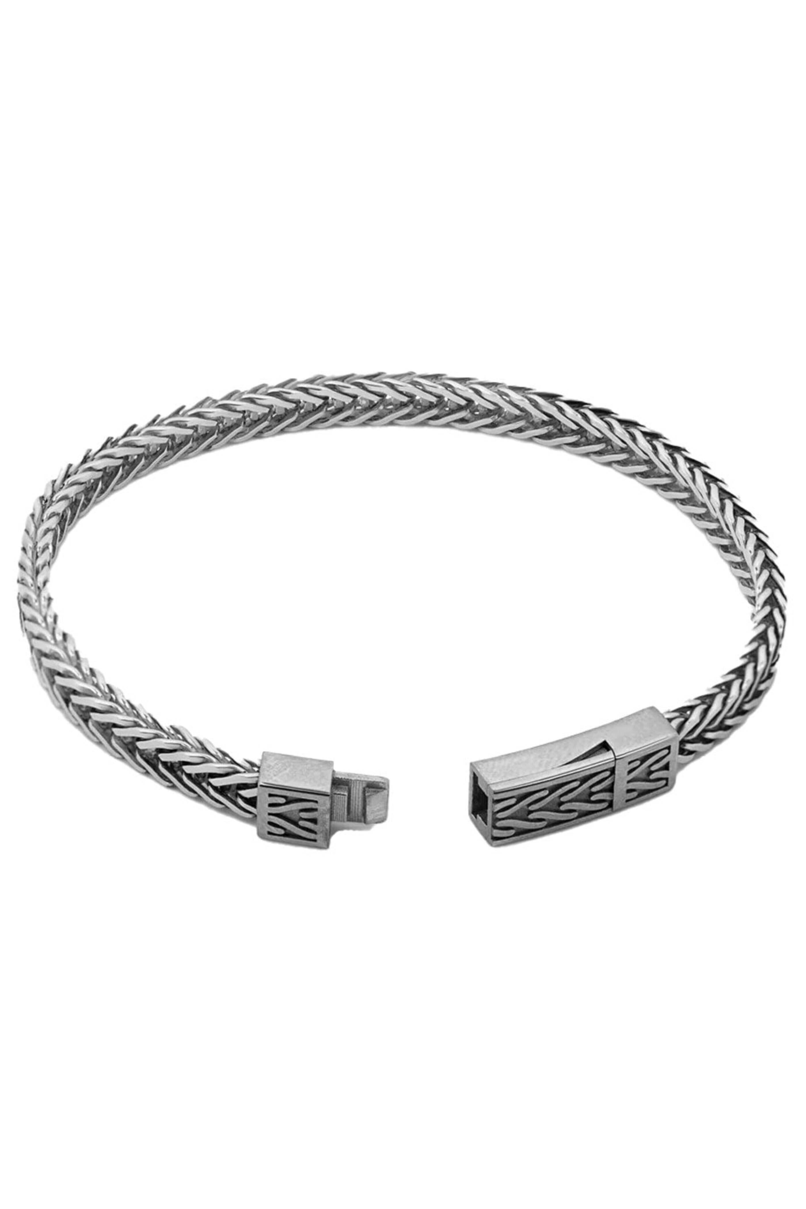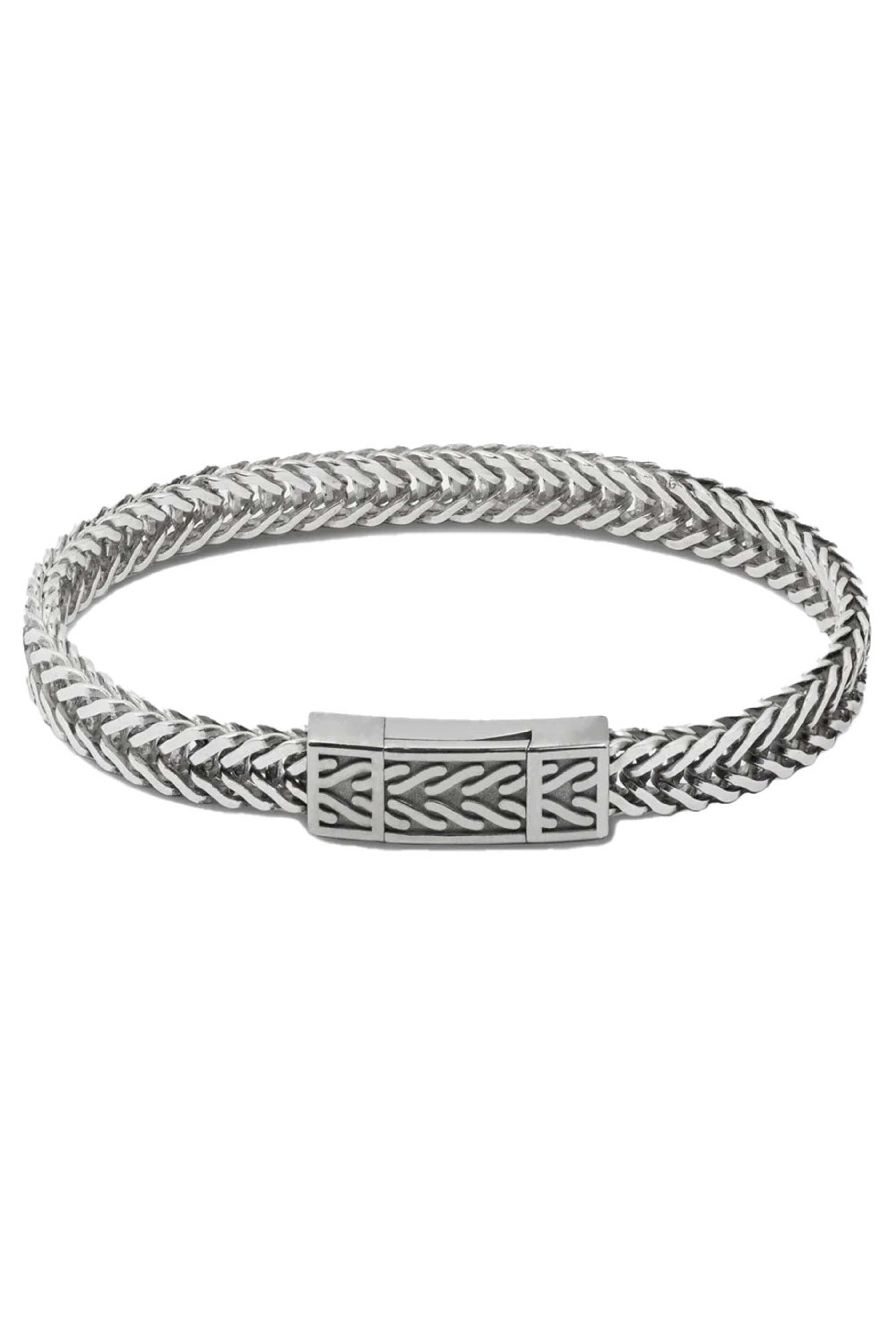 Tateossian Oxidized Silver Coda Di Volpe Bracelet. Oxidized silver. Herringbone pattern design. Single wrap chain. Slide clasp. 18mm.