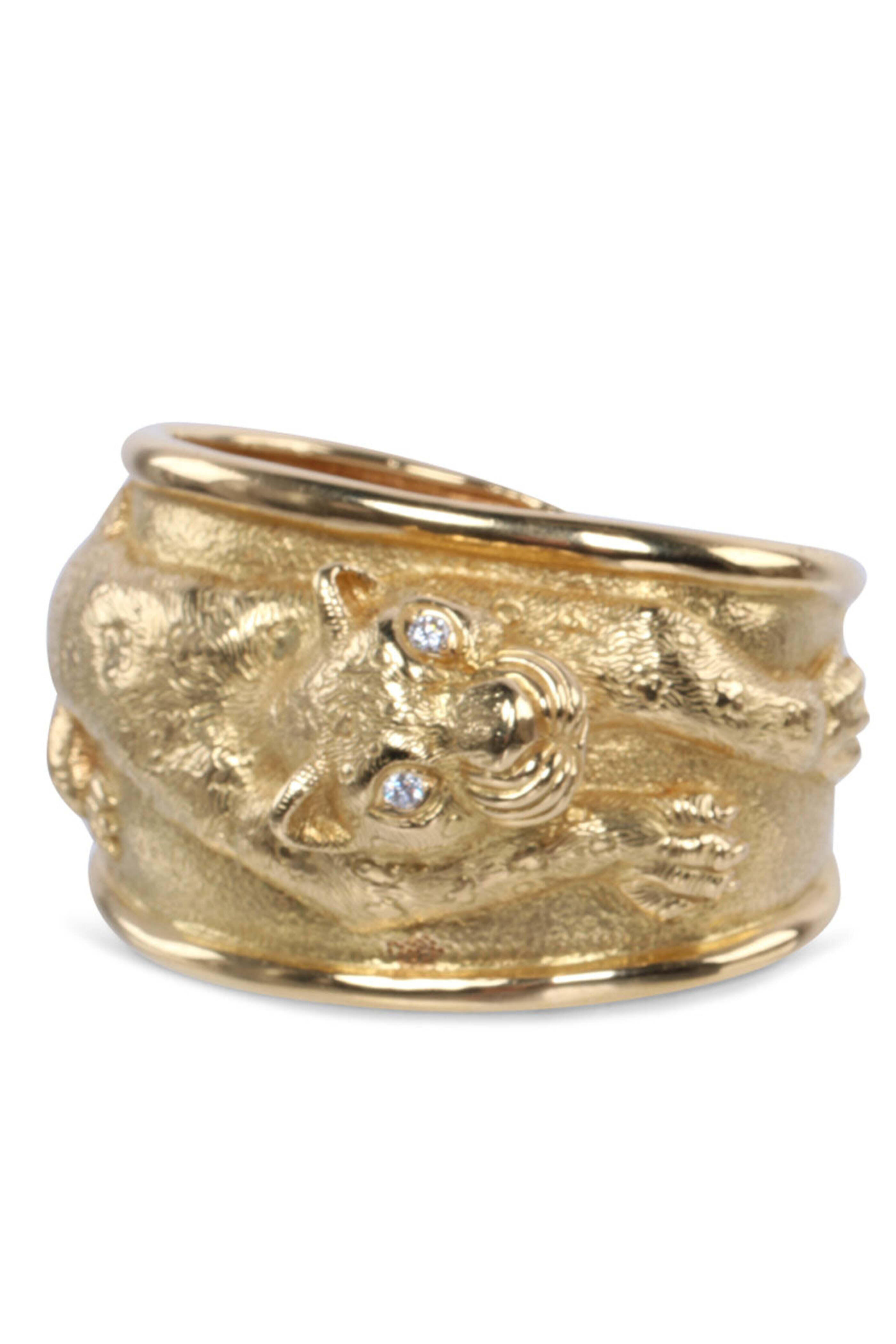 Estate Jewelry Lion Cuff. 18k yellow gold. Diamond 0.20 total carat weight. Lion design across cuff. Diamond eyes. 3D design. Cuff style.