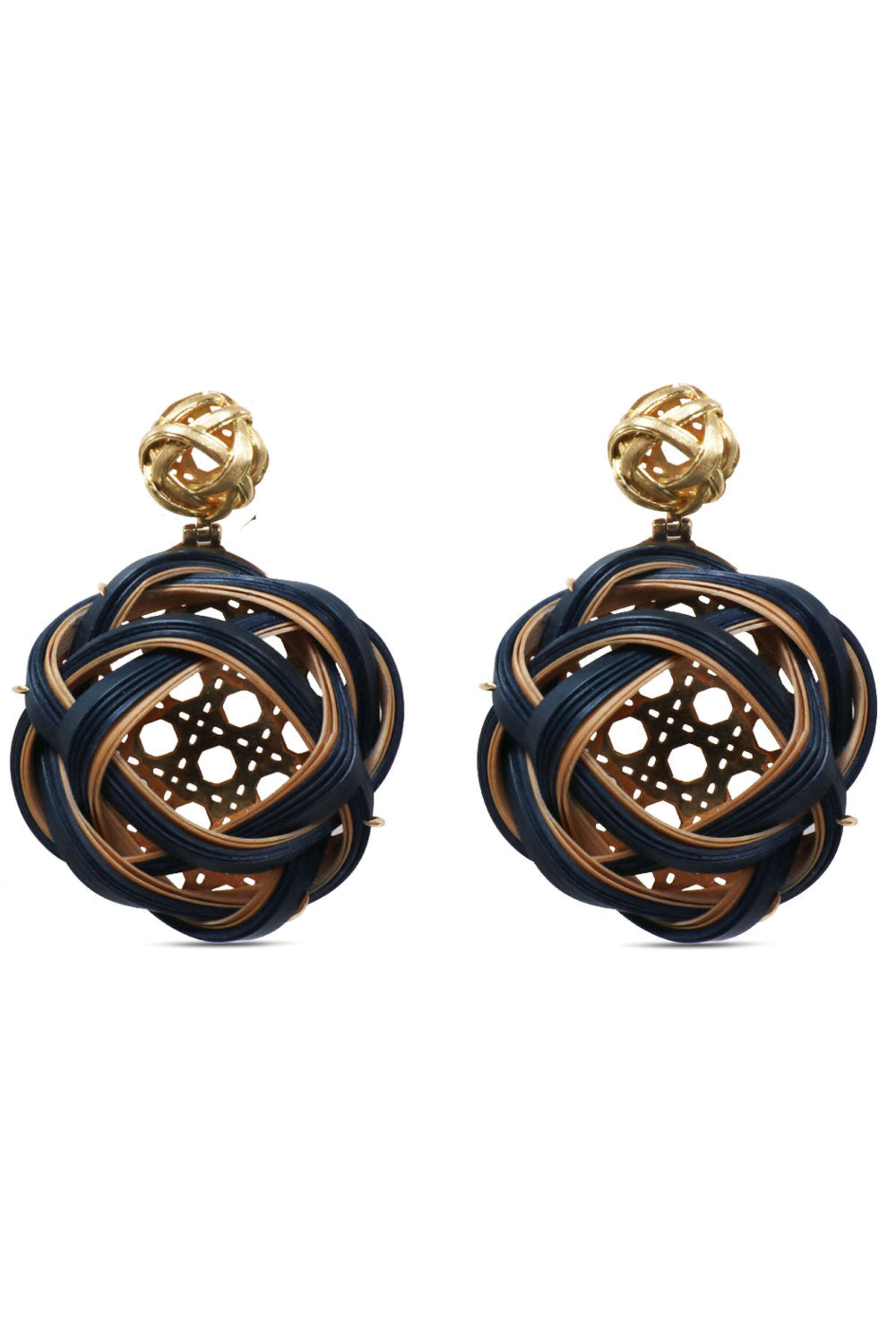 Silvia Furmanovich Woven Bamboo Earrings. 18k gold. Bamboo. Lacy openwork pattern akin to basketry. Amazonia bamboo collection. Drop style. Push back post. Made in Brazil.