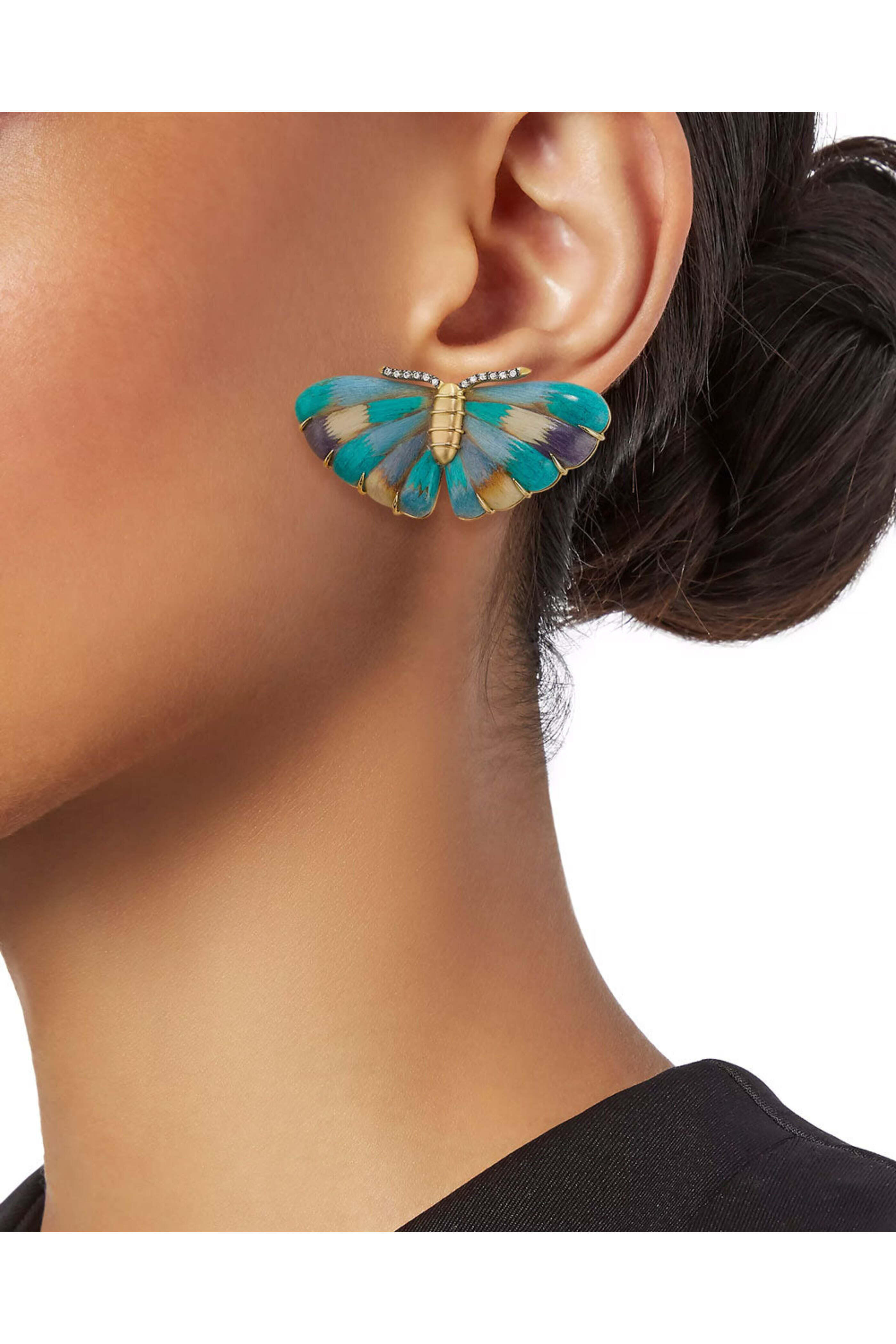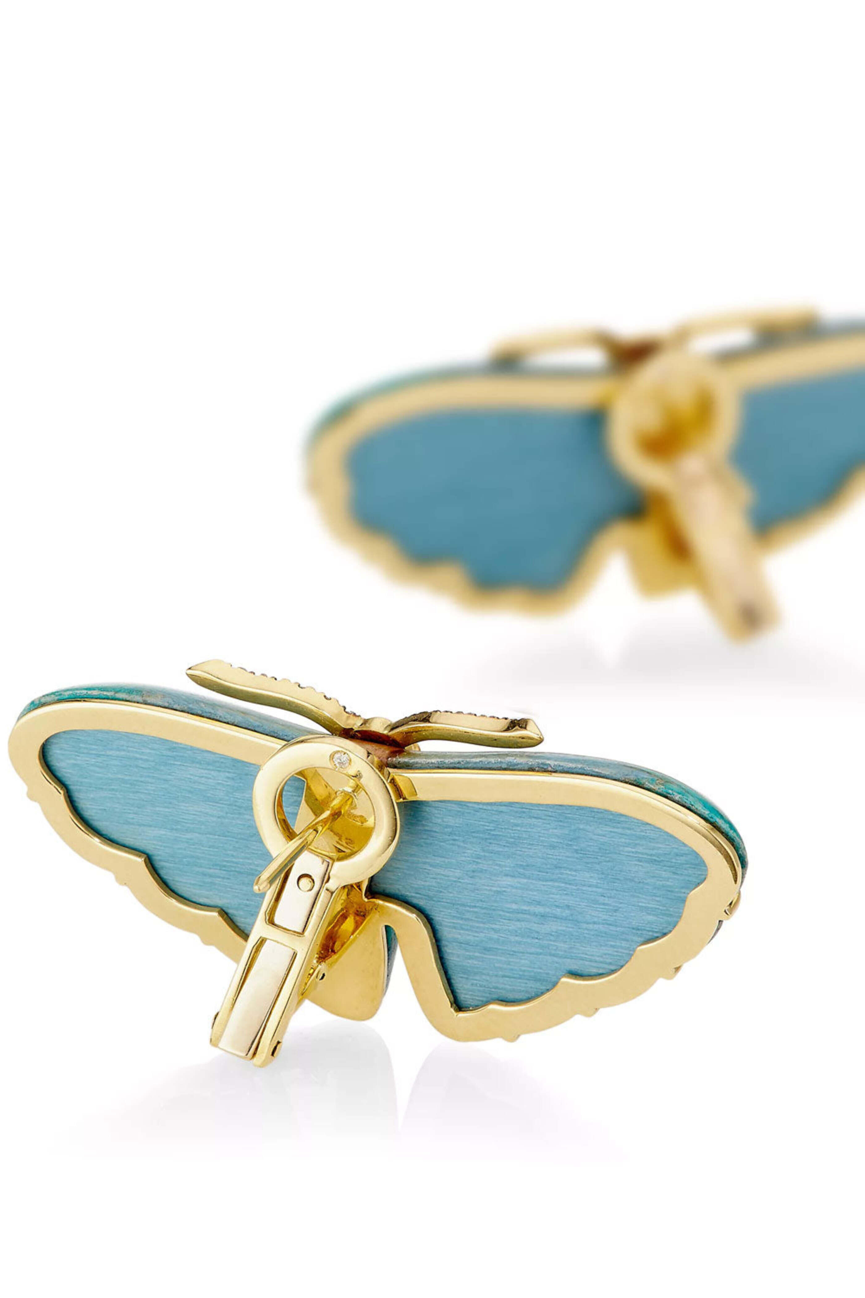 18k gold. Diamond. Marquetry. Teal. Butterfly design. Diamond butterfly antennas. Yellow gold details on butterfly's abdomen. Stud design. Post back. Lever closure. Made in Brazil.