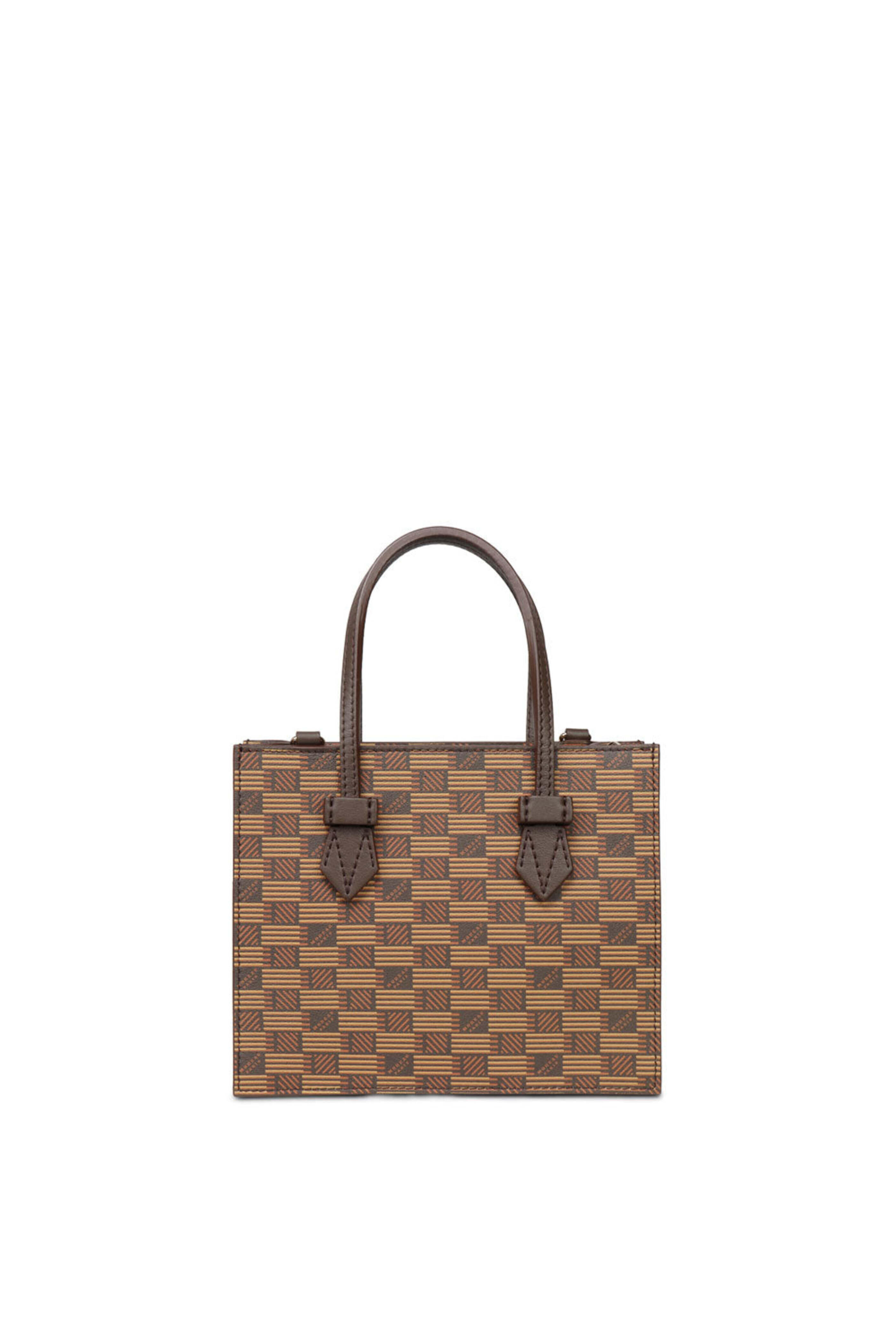 Moreau Paris Small Bregancon Stand Up Tote in Chocolate. Top zip closure . Two retractable top handles . Detachable crossbody strap . Signature Moreanutte canvas . Interior slip pocket . Leather outer . Brown leather lining . 8.7W x 7H x 2.7D . Made in Italy .