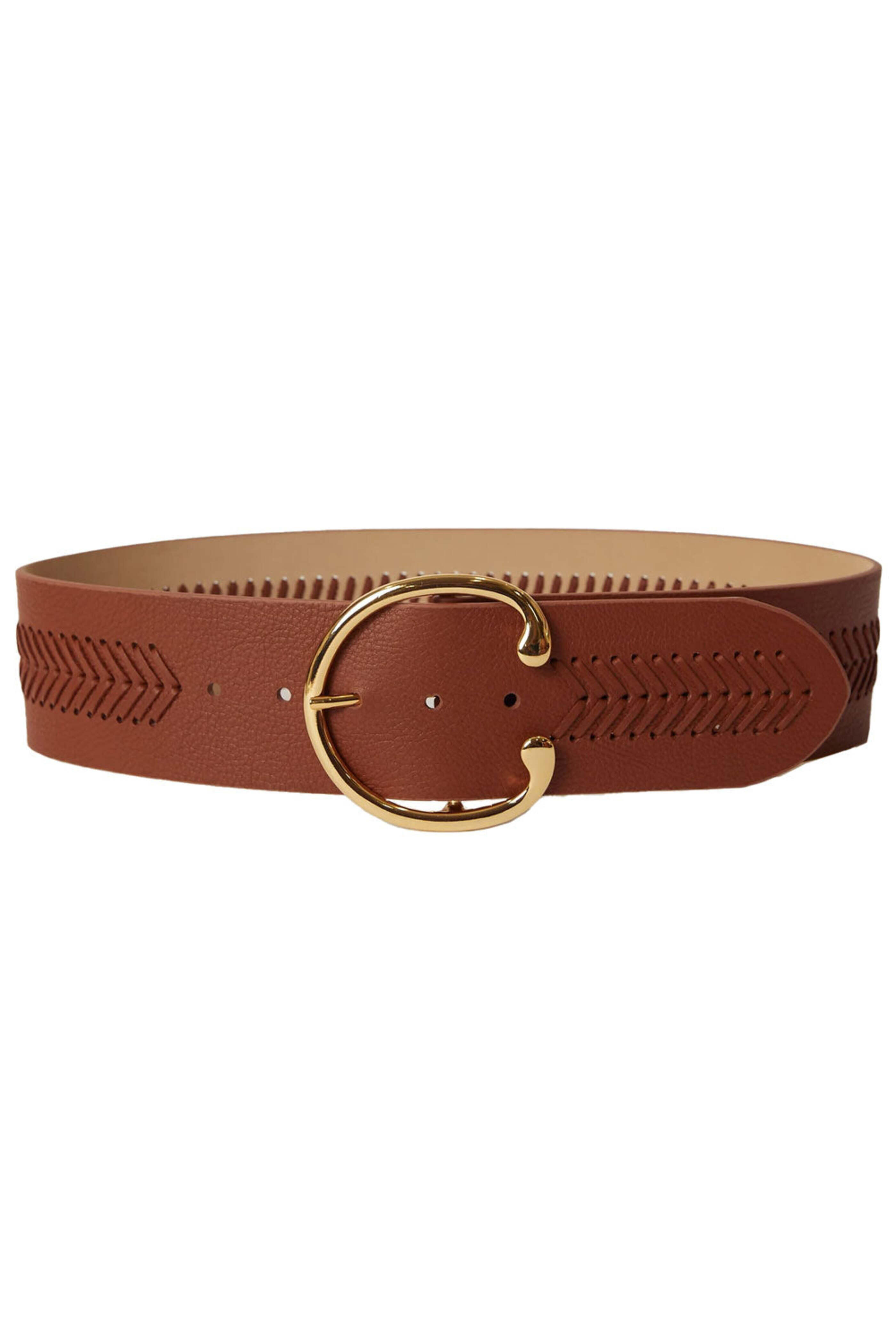 B-low The Belt Kai Waist Belt in Brandy. Waist belt. Adjustable. Gold tone buckle. 2.5 strap width. 3.125 buckle height. Genuine leather with Nubuck lining.