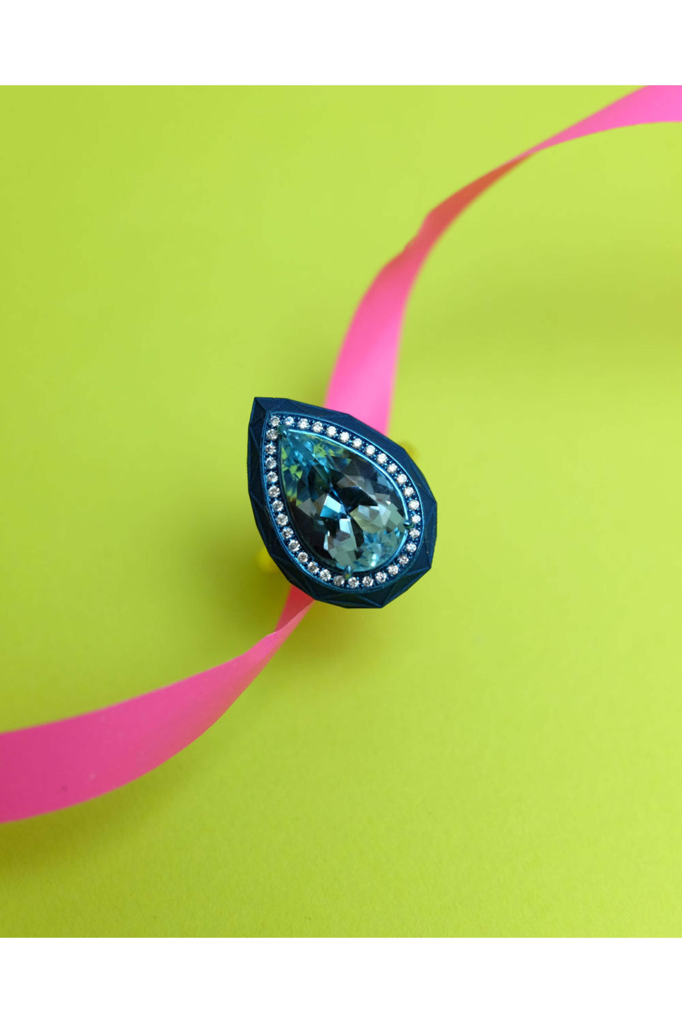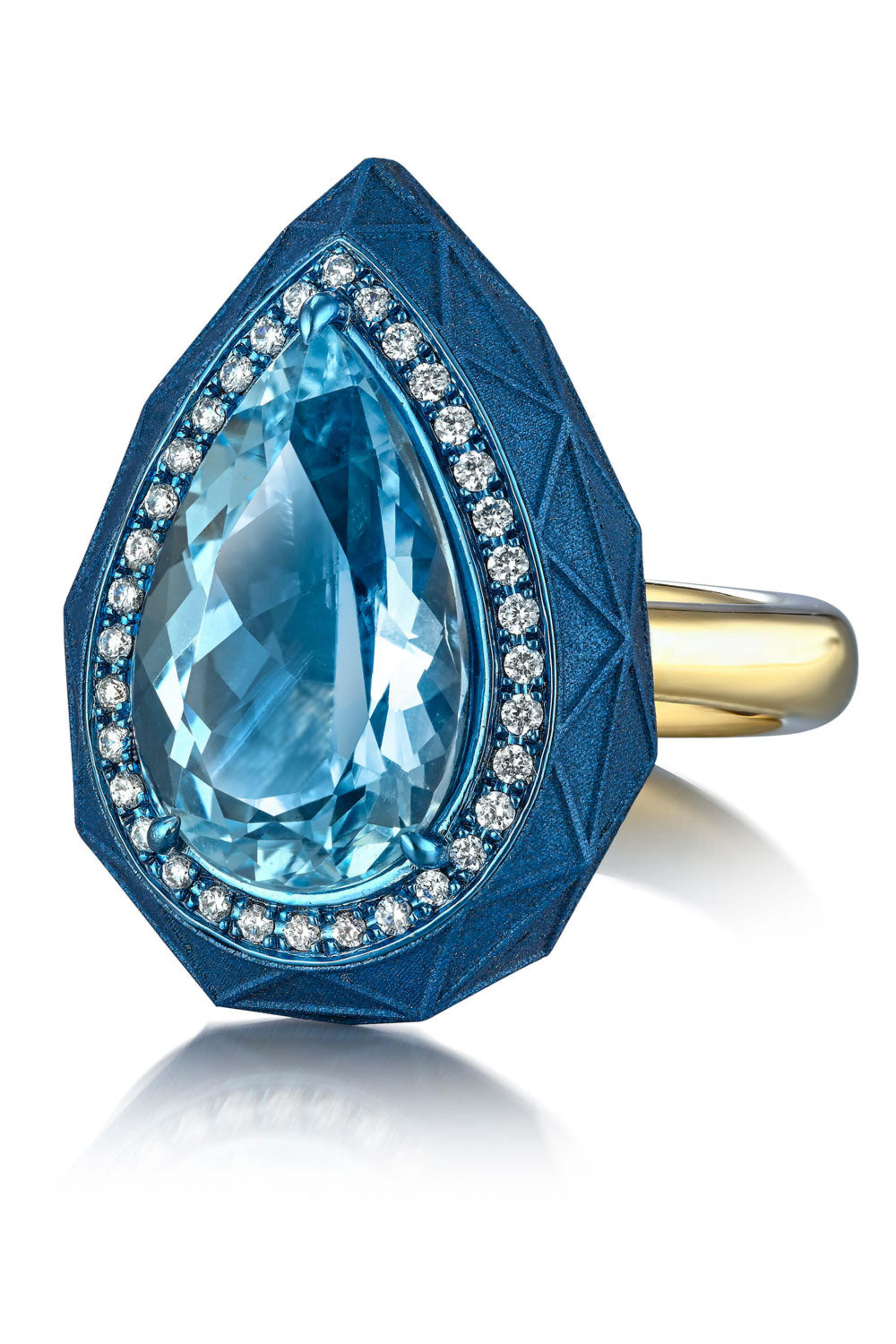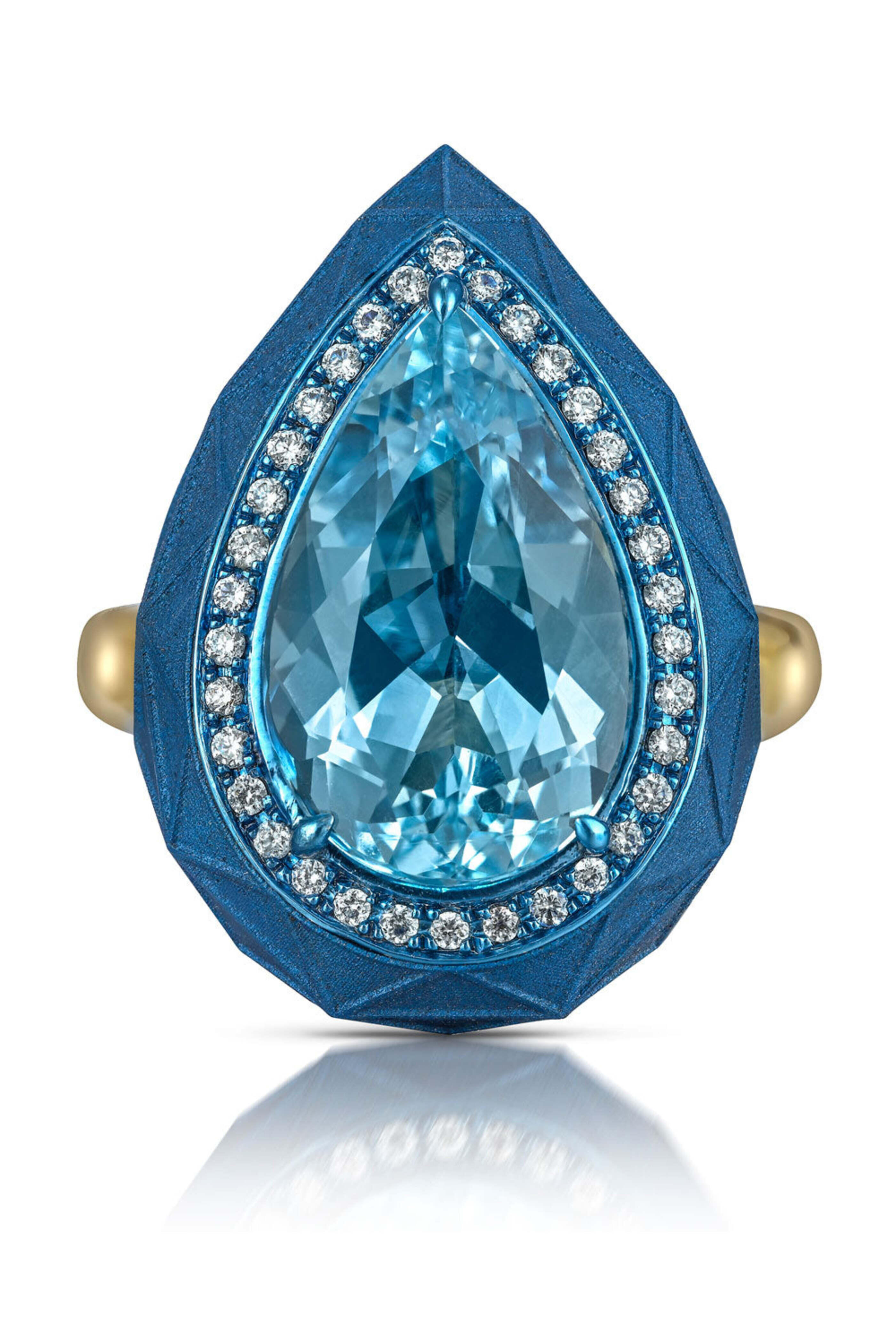 Sarah Ho London Aquamarine Laguna Ring. 18k yellow gold. Cobalt blue ecoating. Titanium. Aluminum alloy anodized blue. 6.62 ct. aquamarine. 0.19 ct. diamond. Bright Young Things Collection.