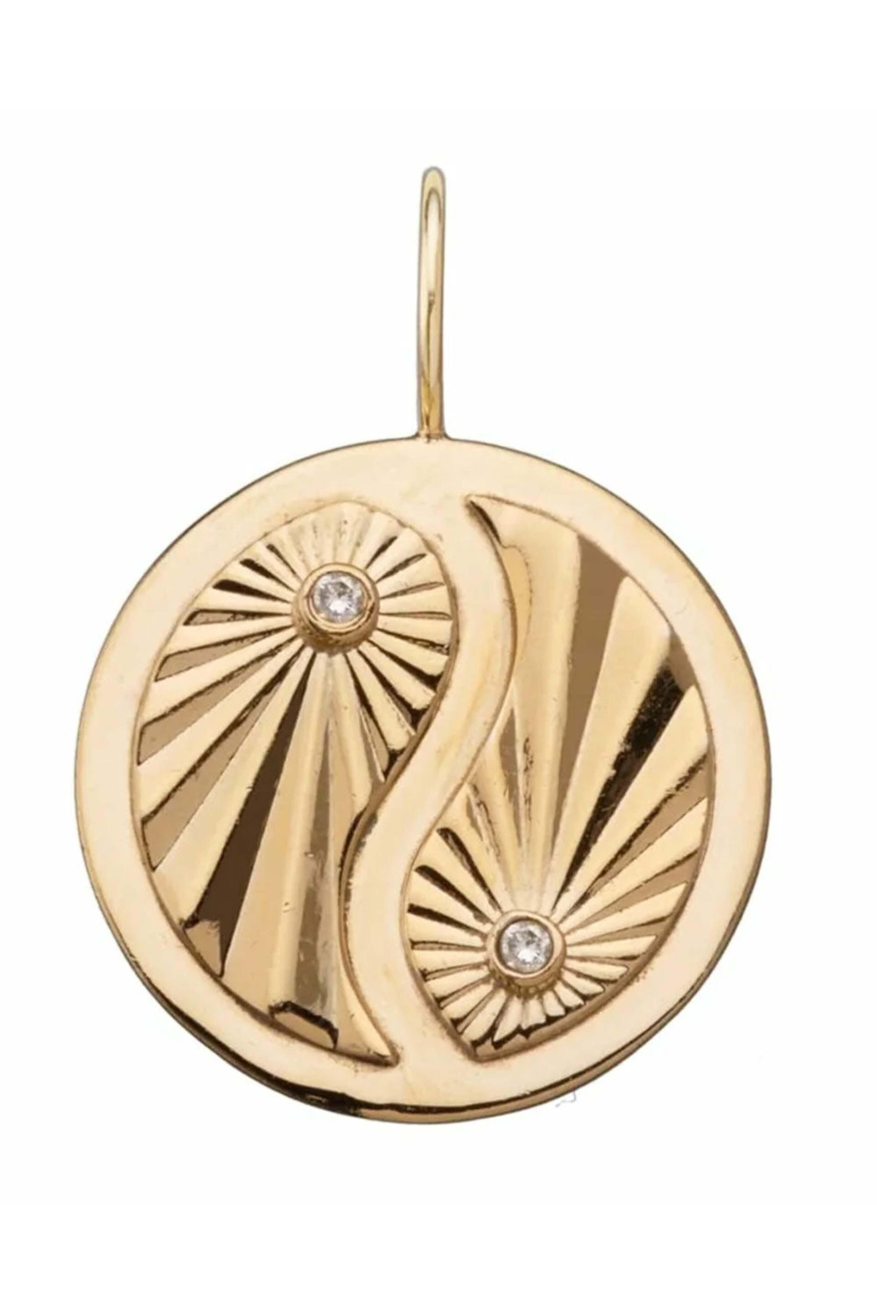 Jennifer Zeuner Monroe Charm. Gold vermeil. Diamond 0.015 total carat weight. Yin yang symbol. Swirling ridged design. Two diamond chips on circular charms. 1. Bail.
