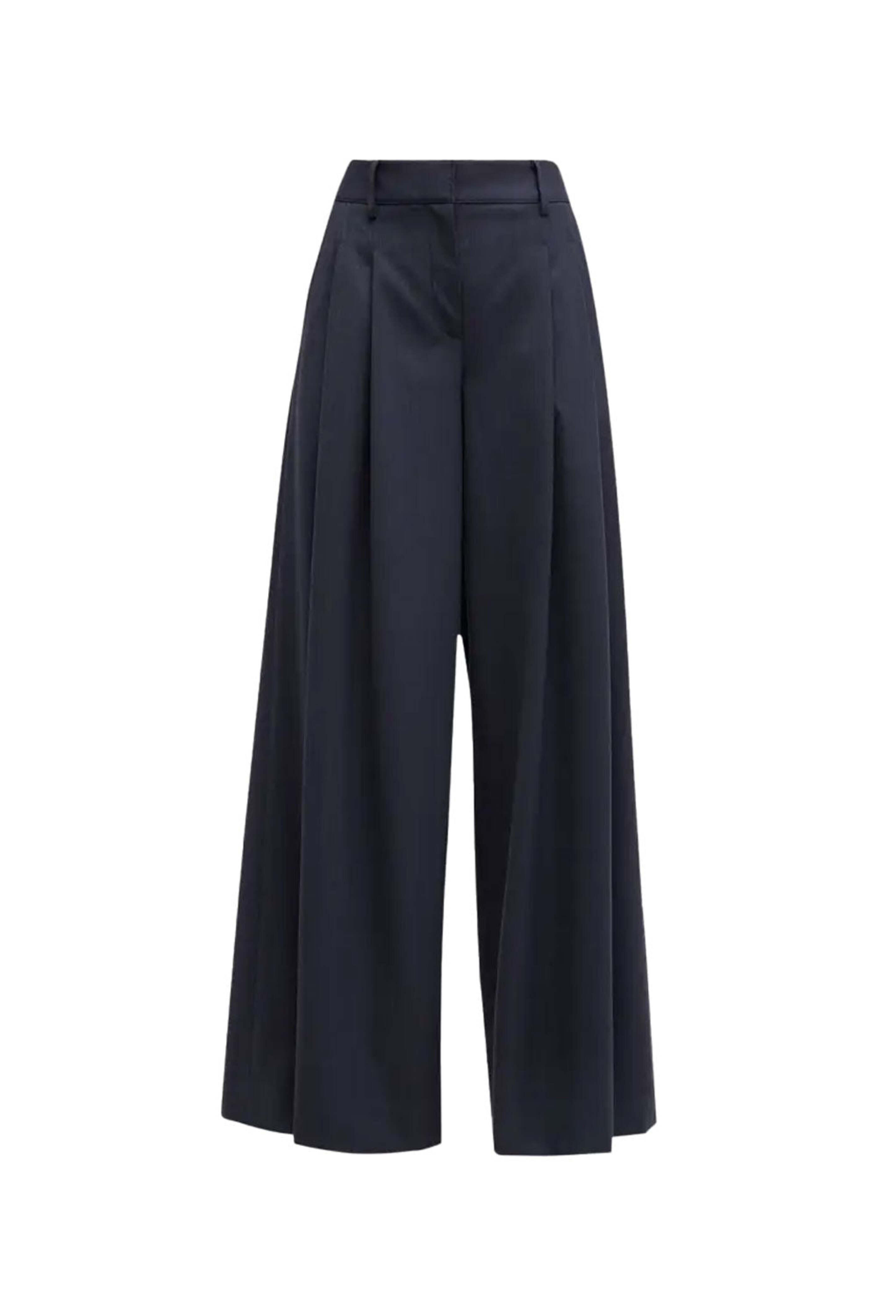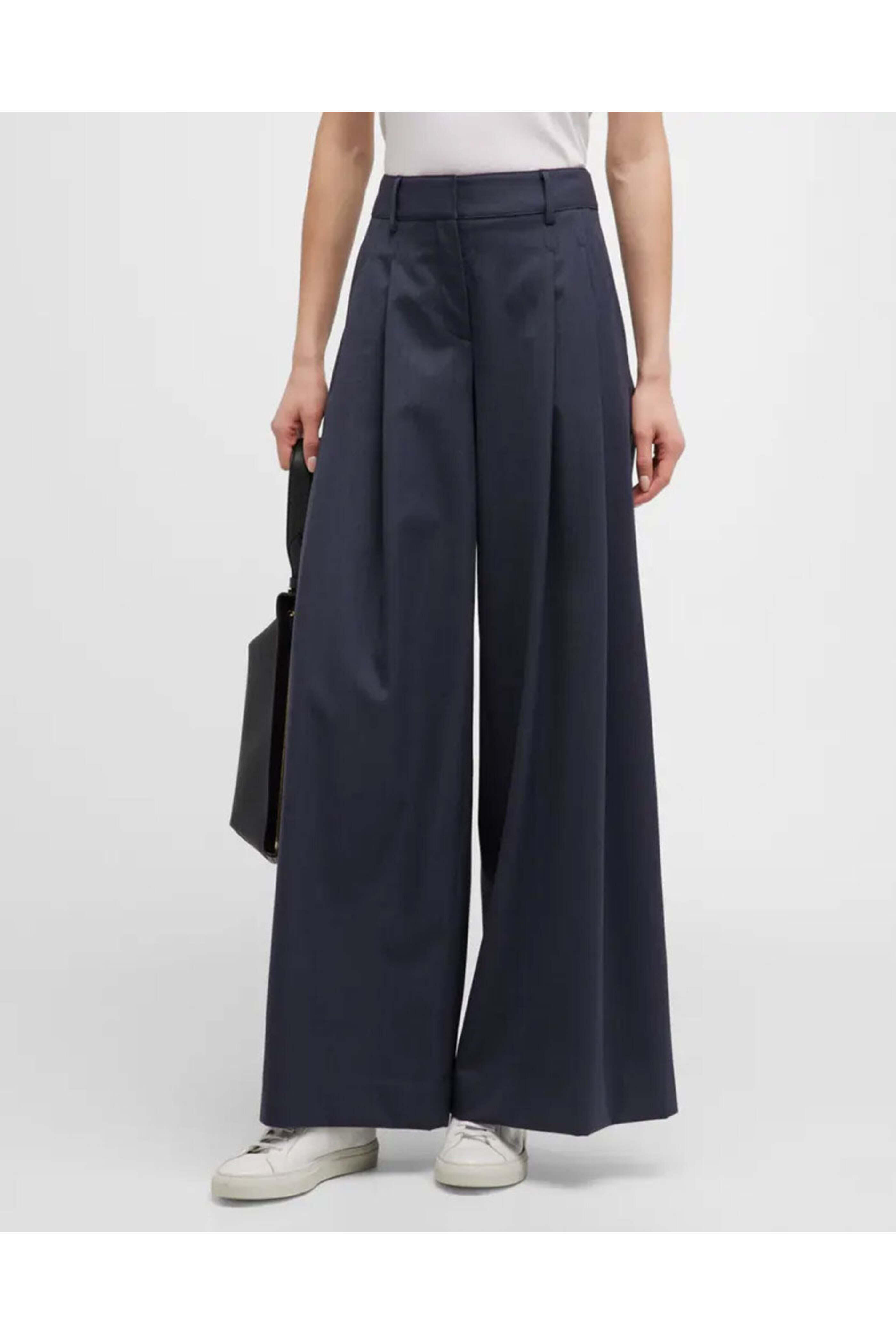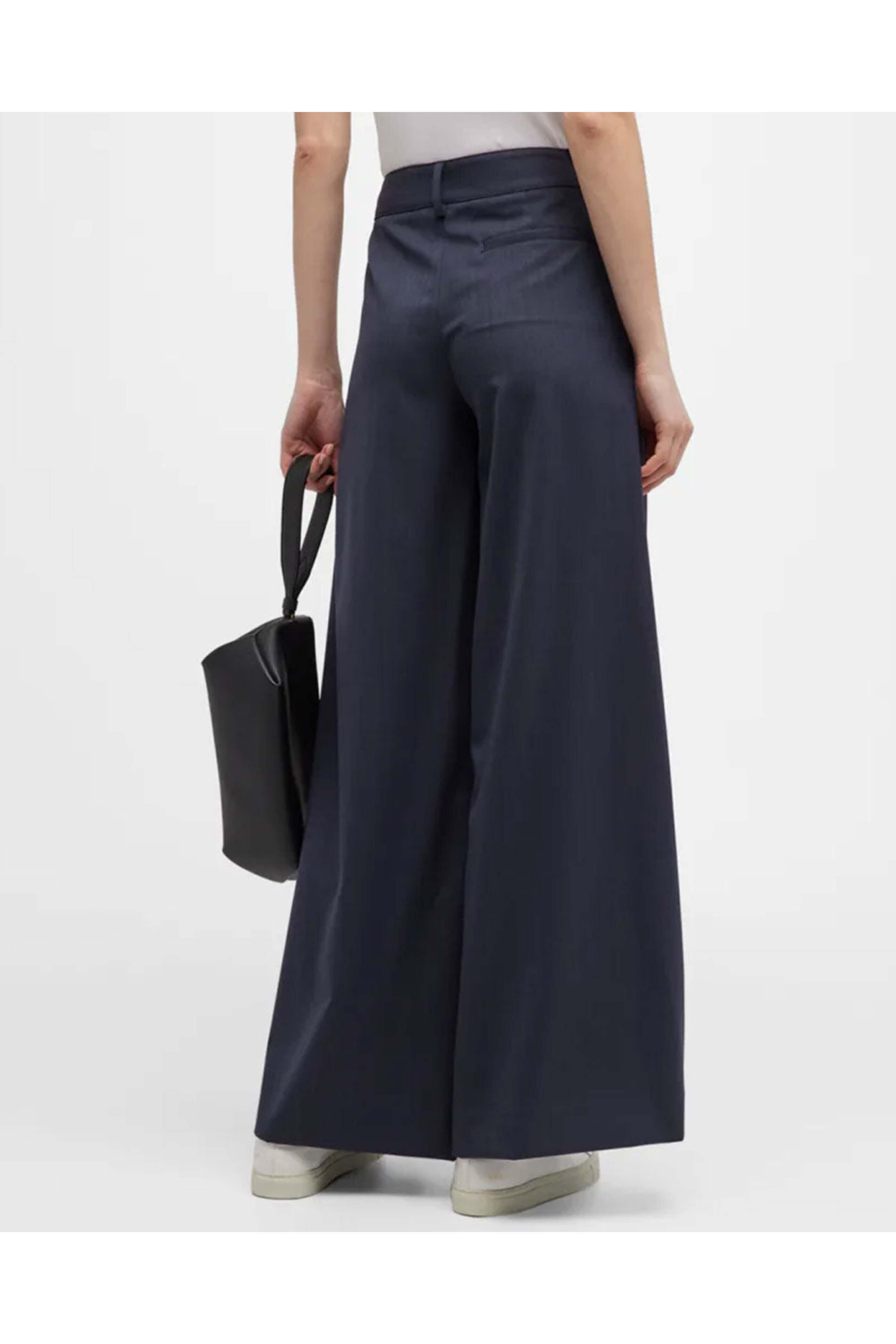 TWP Indigo New Didi Pant . High rise. Belt loops. Concealed hook/zip front. Side seam pockets; back welt pocket. Wide leg . Relaxed fit . 100% Wool.