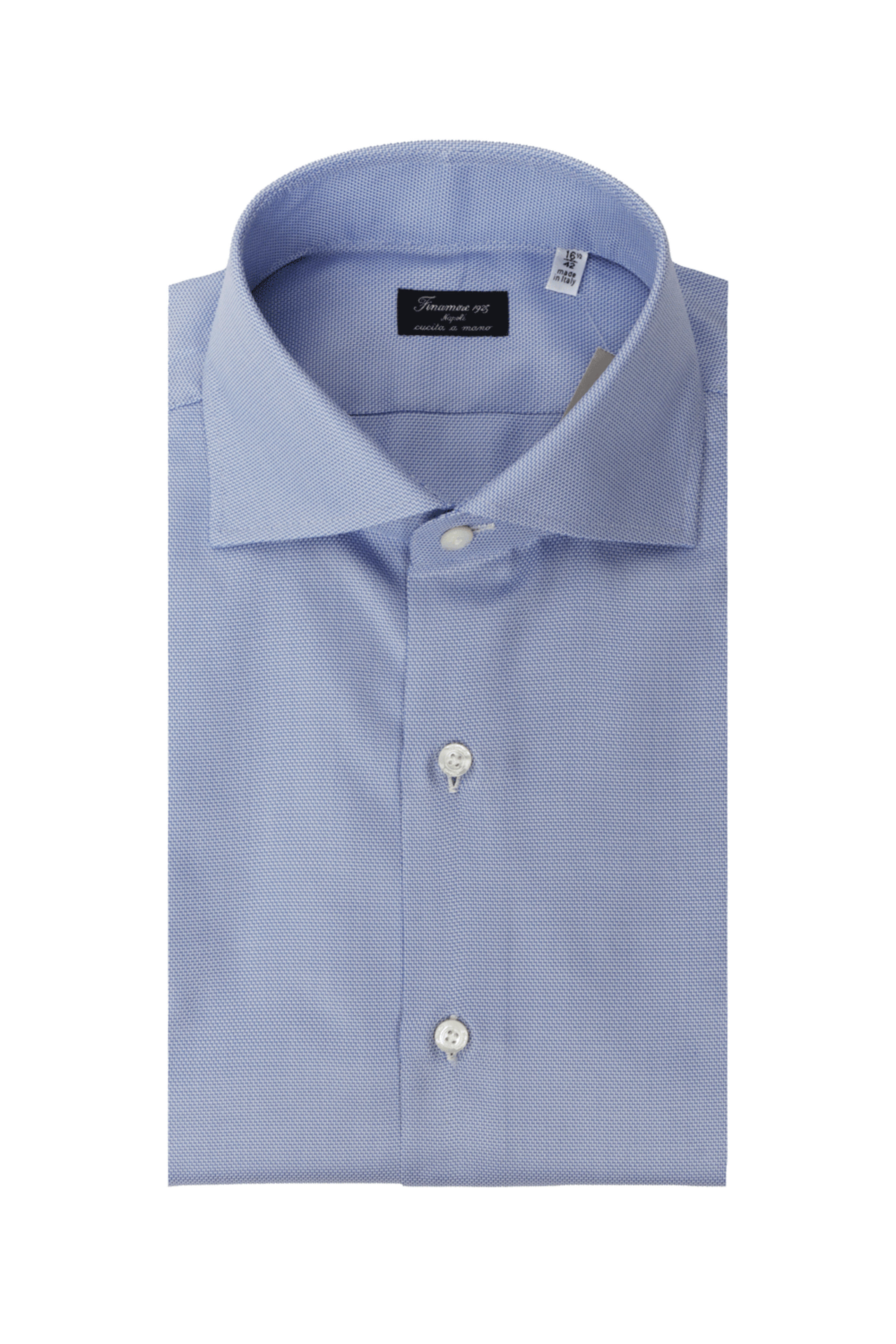 Finamore Blue Herringbone Dress Shirt. Spread collar. Button down front closure. Long sleeves. Button cuffs . Made in Italy . 100% Cotton.