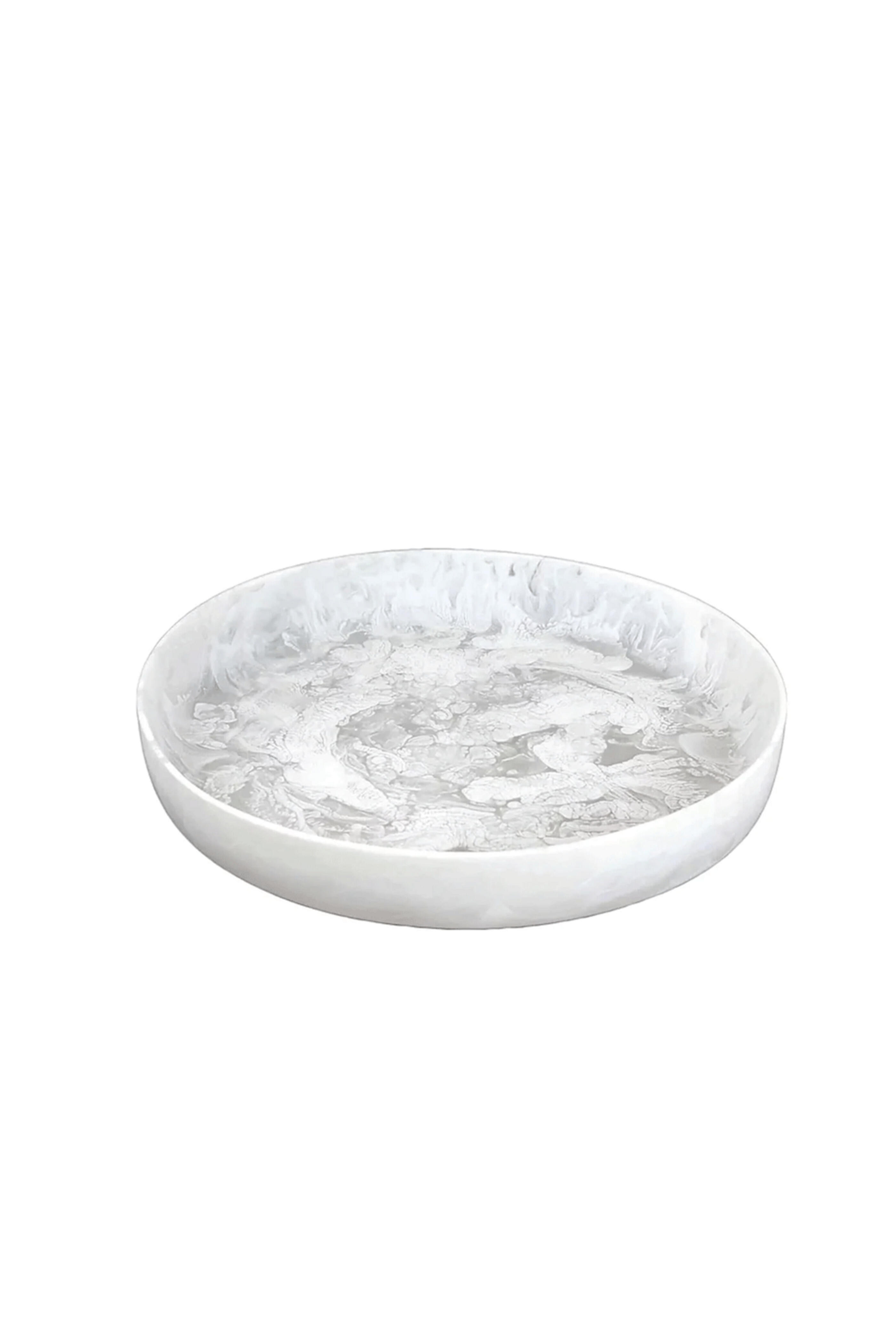 Nashi Medium Round Platter in White Swirl. Non porous. Shatter resistant. Individually poured; making each piece unique. 15W x 2H x 15L.