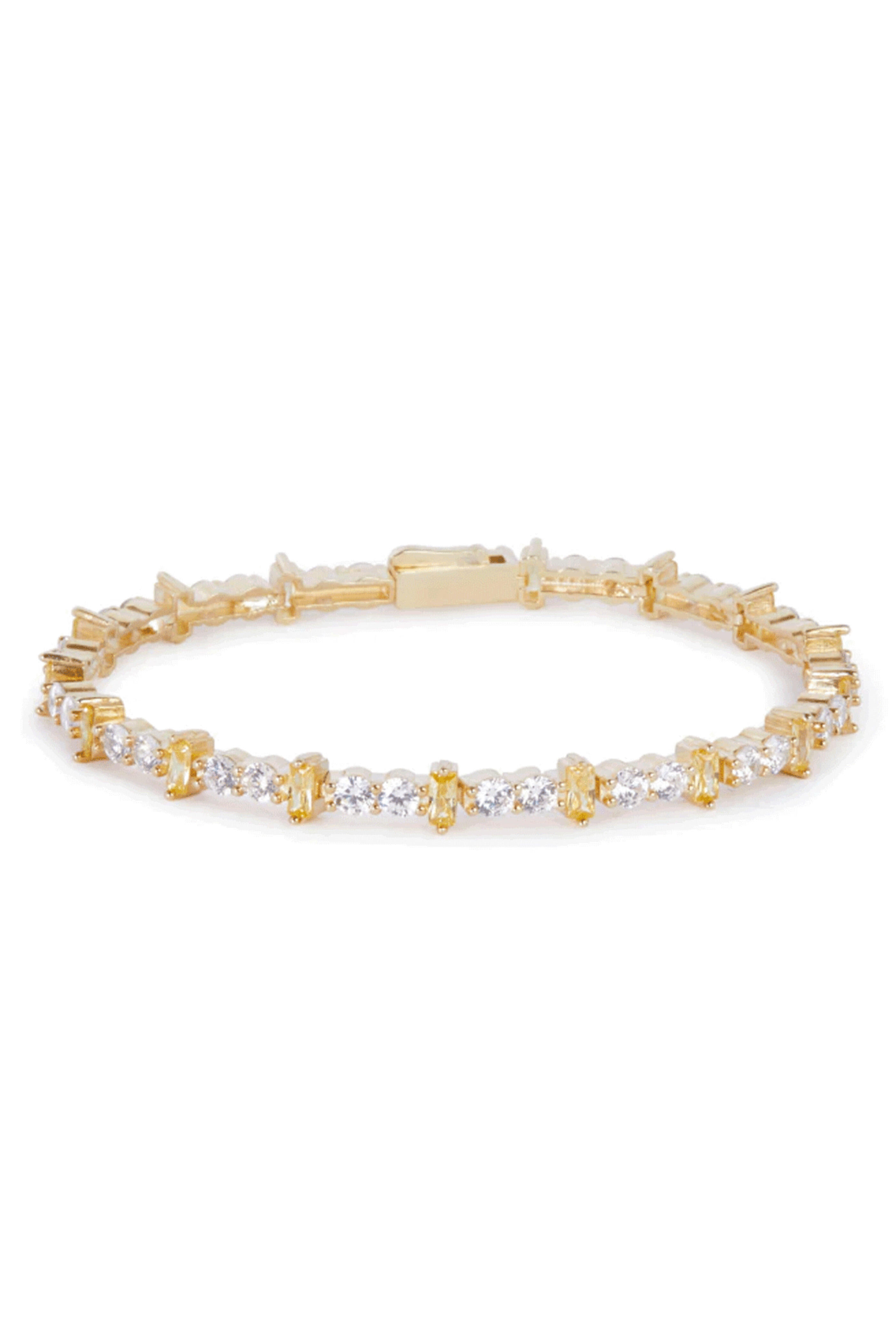 Nickho Rey Gold Mila Bracelet. 14k gold. White crystals. Yellow crystals. Baguette and round cut crystals. Casted channel design. Prong setting. Hinge box post back closure.