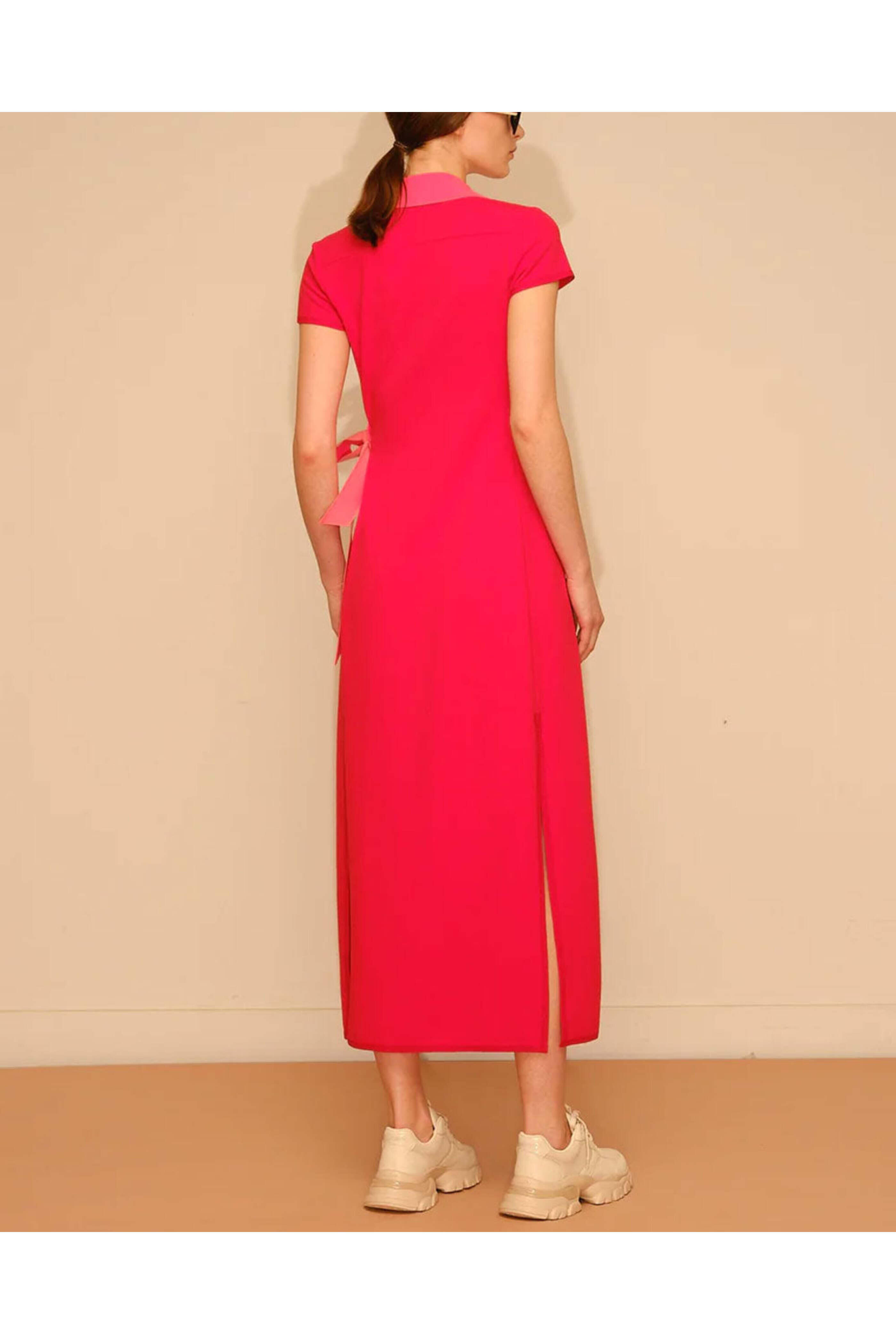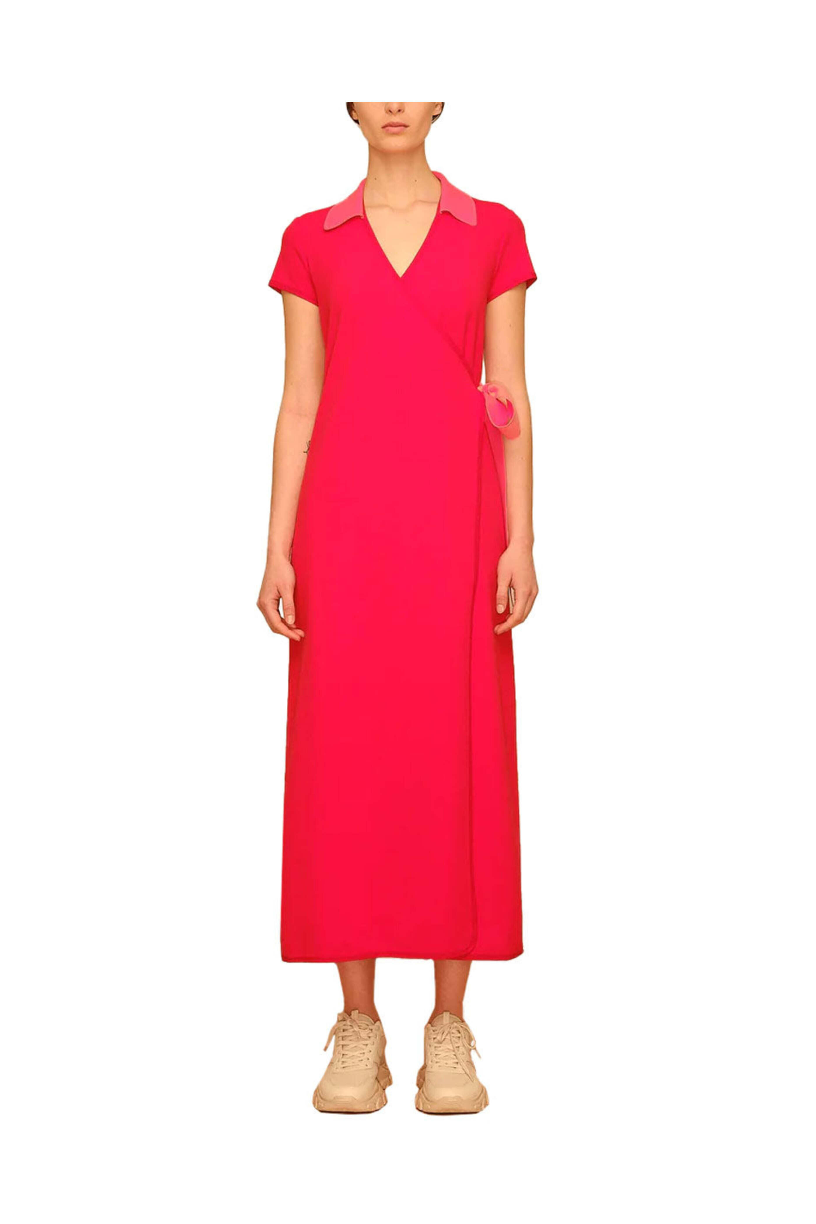 Marie Saint Pierre Red Yuri Dress. Collar. V neck. Short sleeves. Wrap silhouette; self-tie closure at side. Midi to maxi length. Side hem slits. Bicolor fabrication. Made in Montreal. 95% polyester, 5% elastane outer 1, 86% polyamide, 14% elastane outer2, 72% polyamide, 28% elastane outer3.