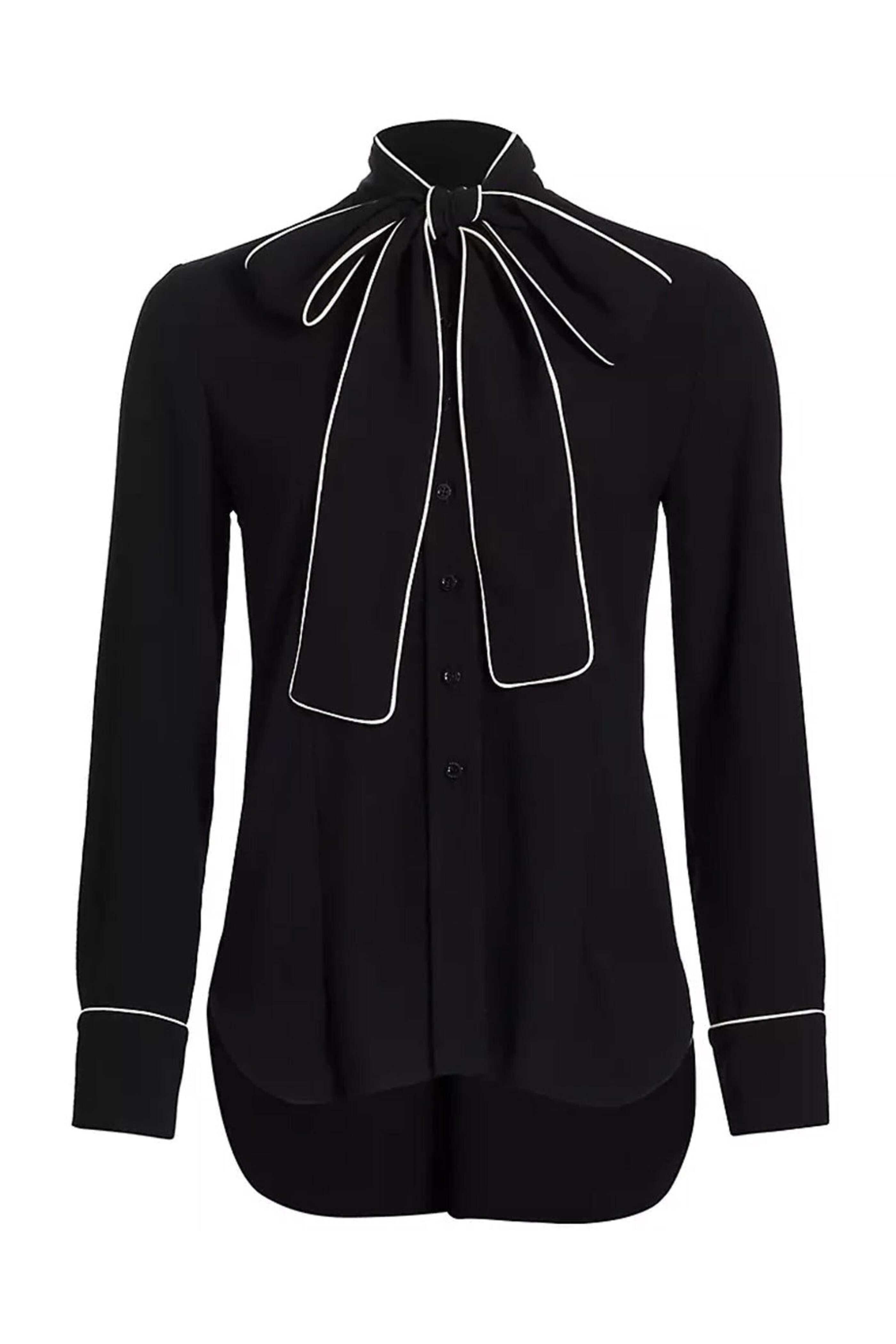 Carolina Herrera Black Pearl Bow Front Button Up Shirt. Self-tie bow detail at neck. Long sleeves; button cuffs. Button down front closure. Rounded shirttail hem. Piped detail at trim. Made in Italy. 100% polyester.