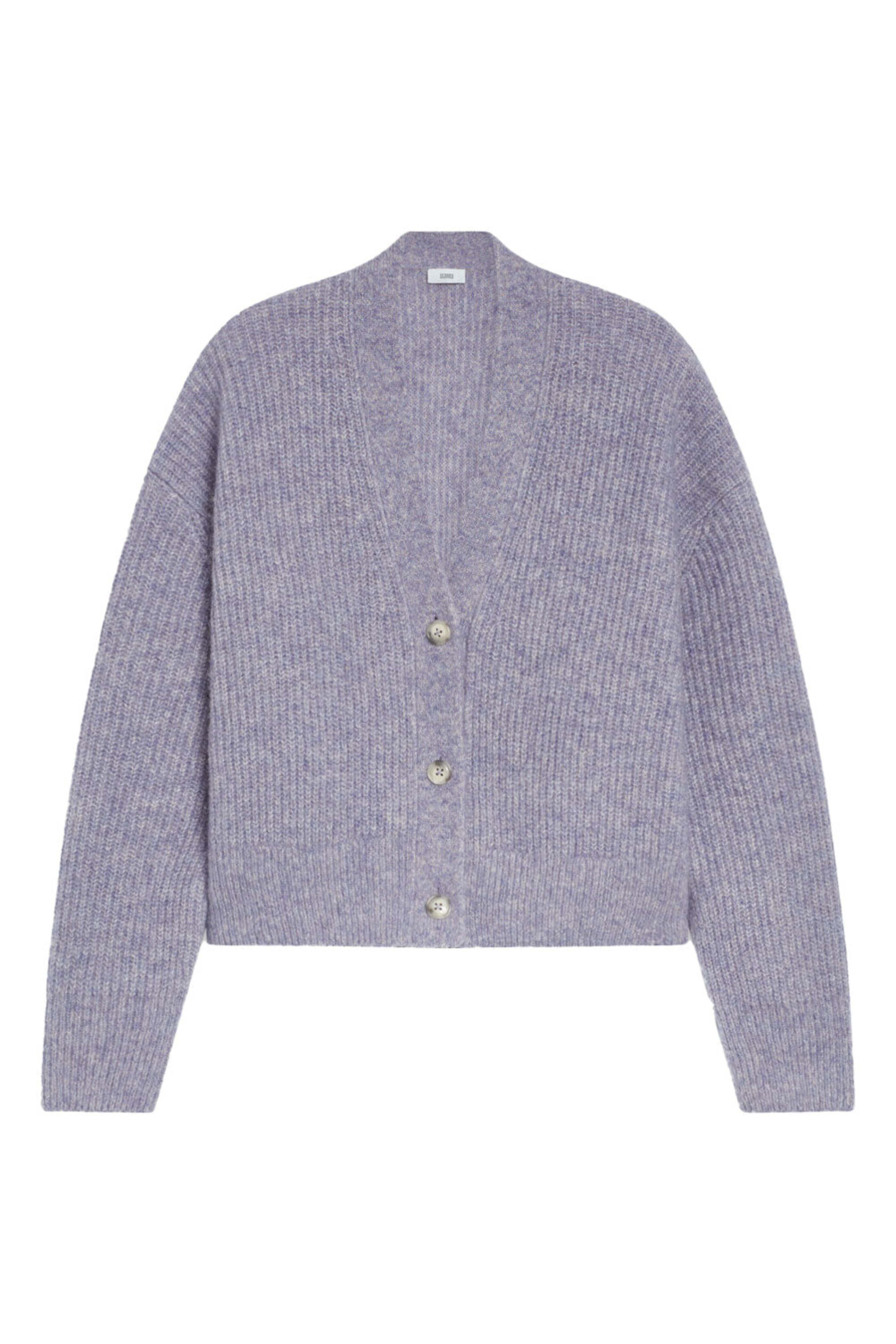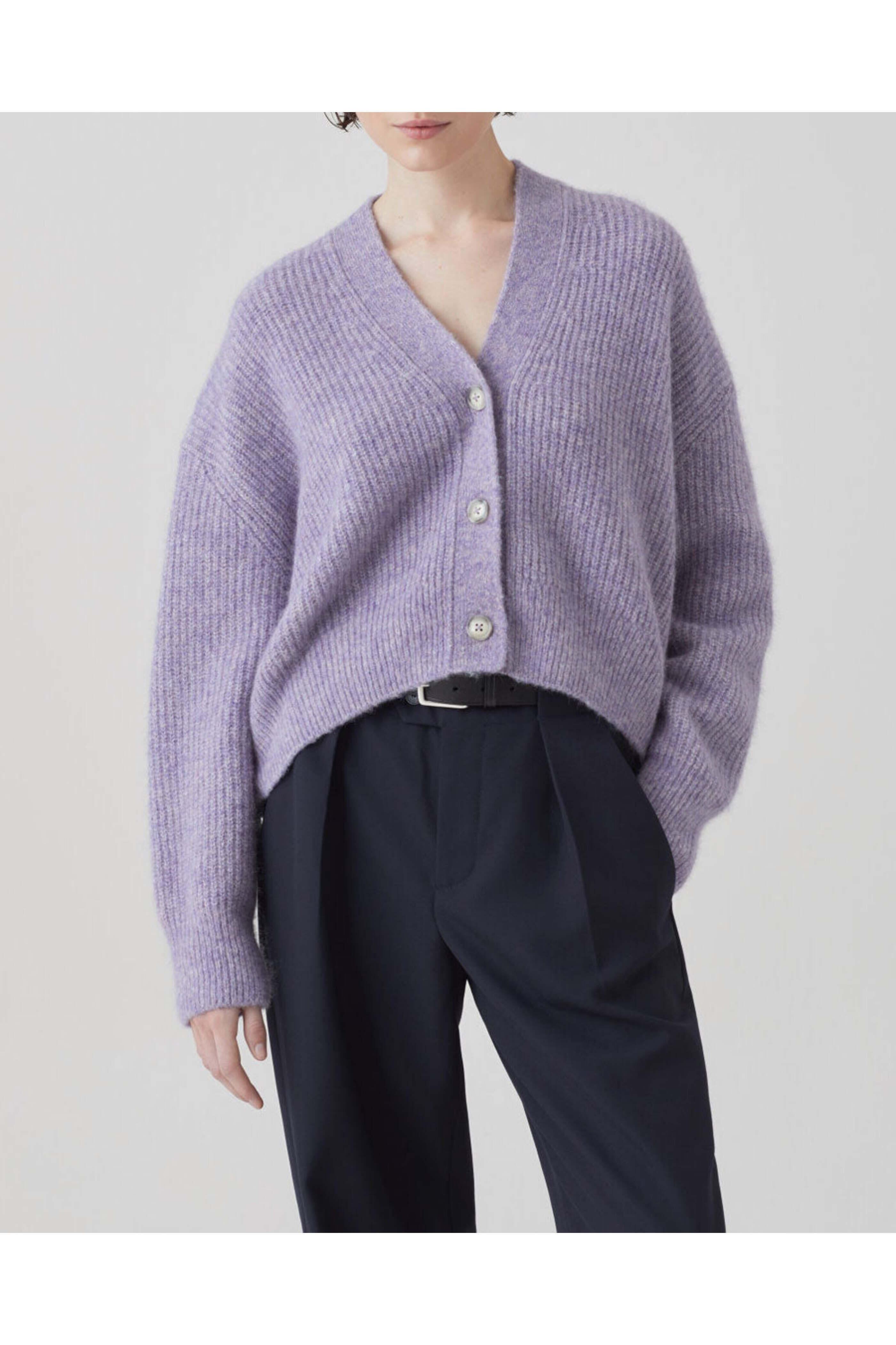 Closed Lilac Breeze Italian Yarn Cardigan. V Neck. Dropped shoulders. Long sleeves. Front button up closure. Ribbed cuffs and hem. Boxy silhouette. Relaxed fit. 41% Polyamide, 32% Alpaca, 27% Wool.