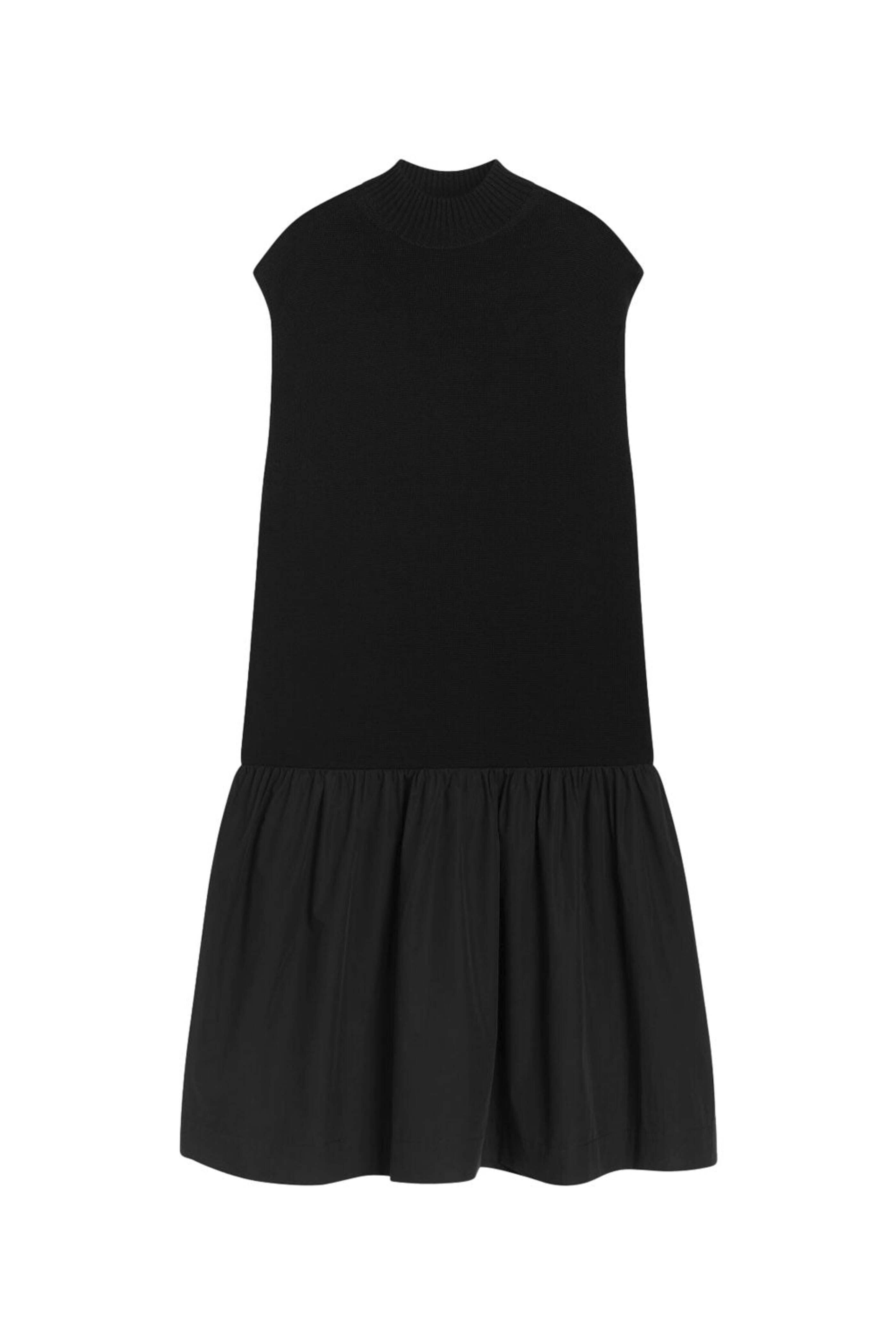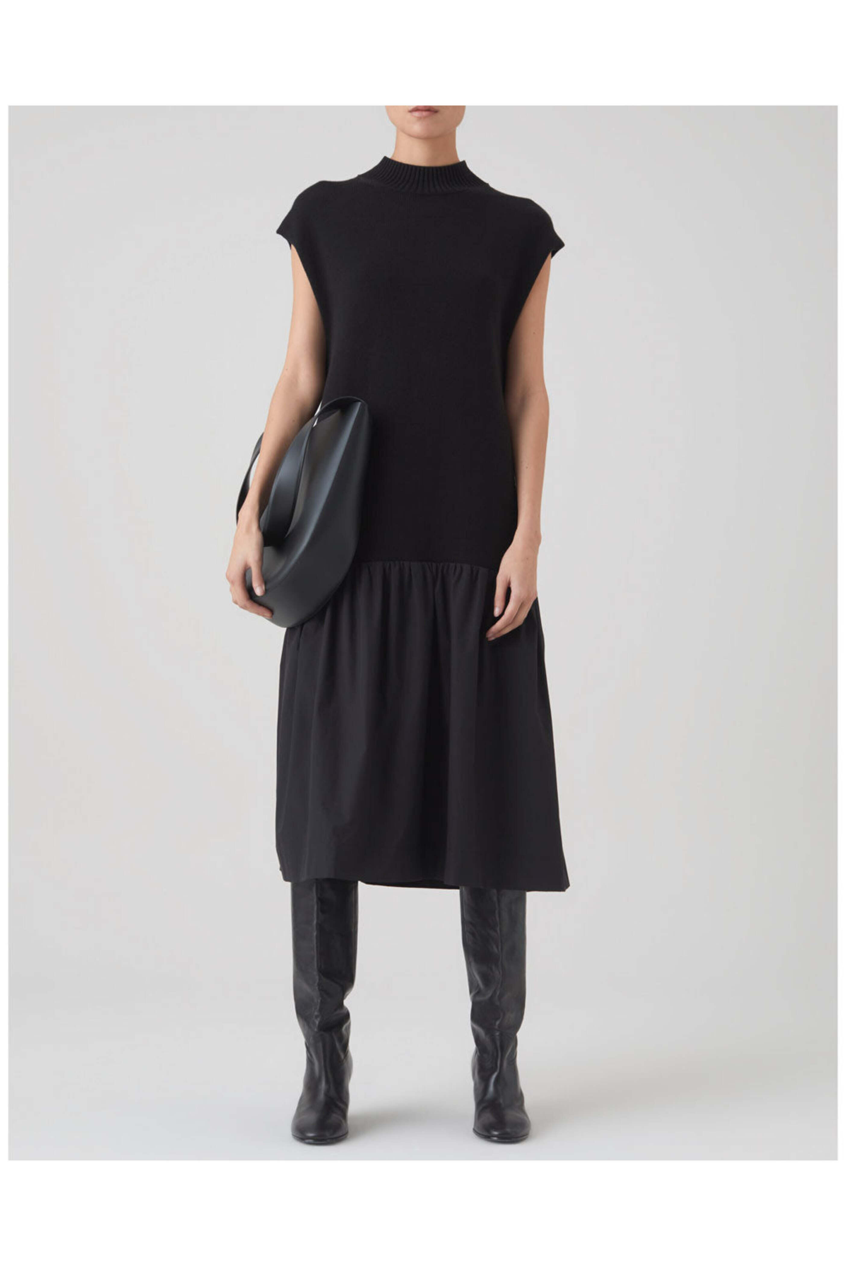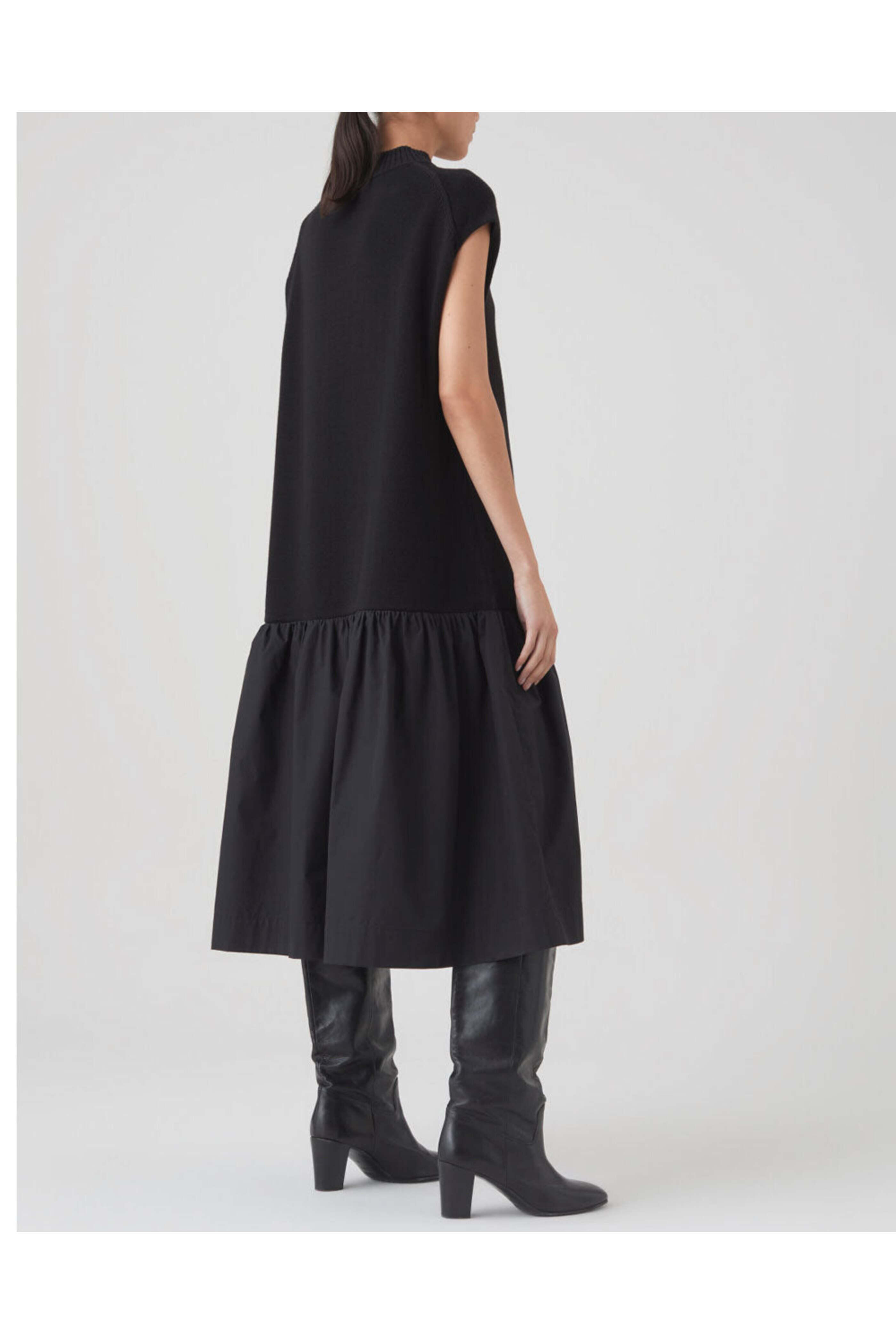 Closed Black Poplin Knit Dress. Ribbed Mockneck. Short cap sleeves. Midi length; flounce hem. A line silhouette. Relaxed fit. Cotton knit and poplin fabrications. 100% Organic Cotton.