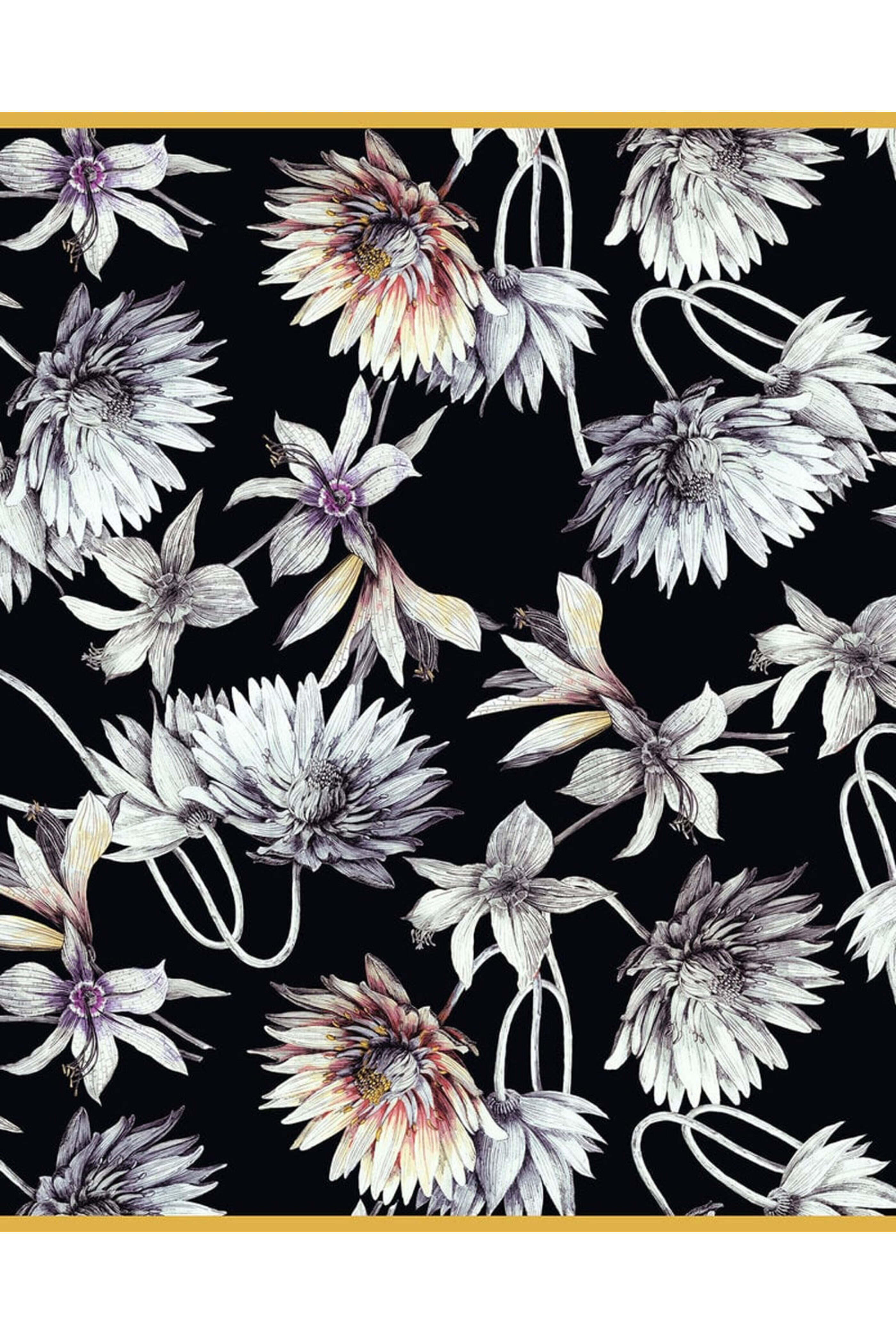Rani Arabella Black Dahlia Scarf. Dahlia print. Rolled trim. 52 x 52. Made in Italy. 35% cashmere, 35% silk, 30% wool.