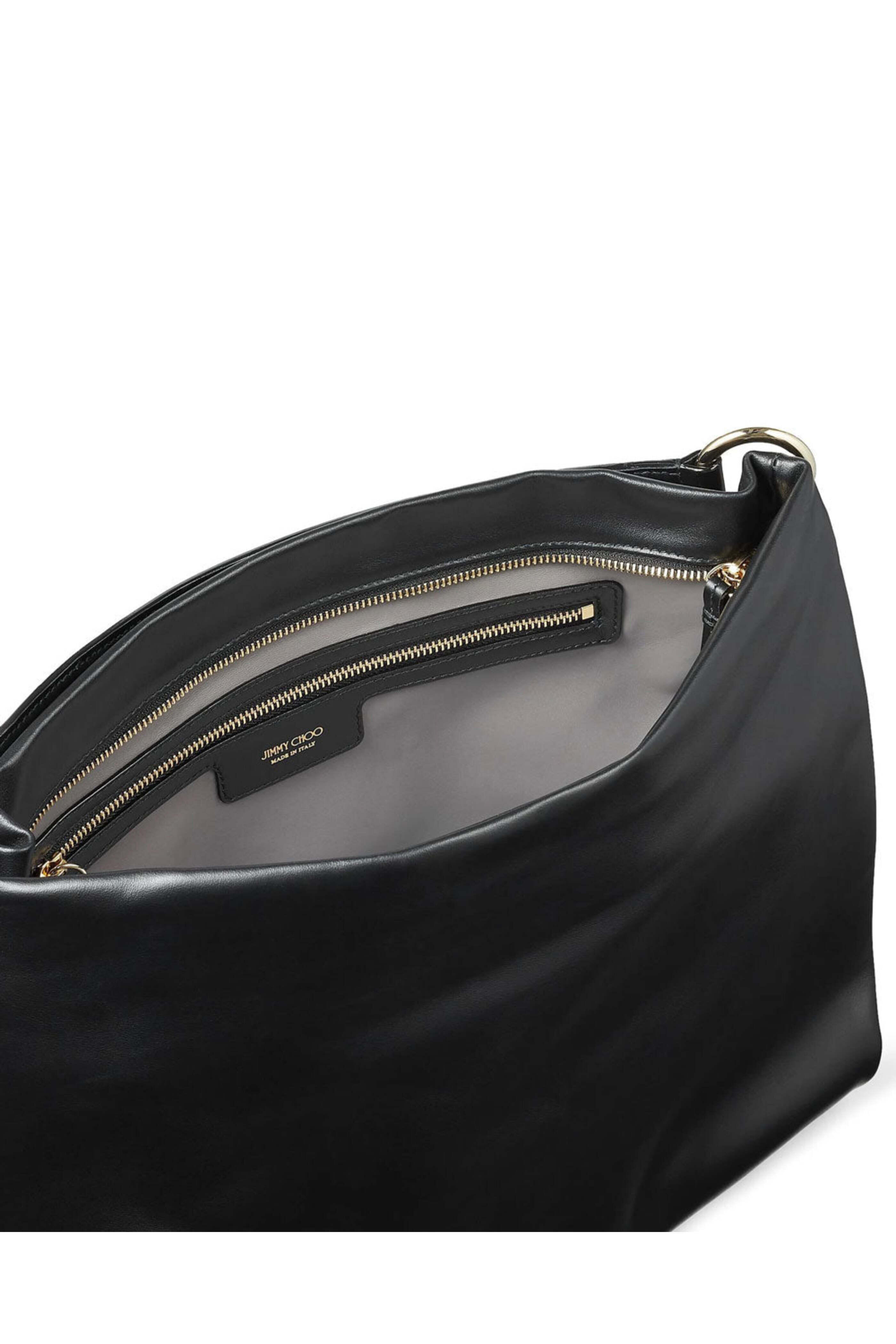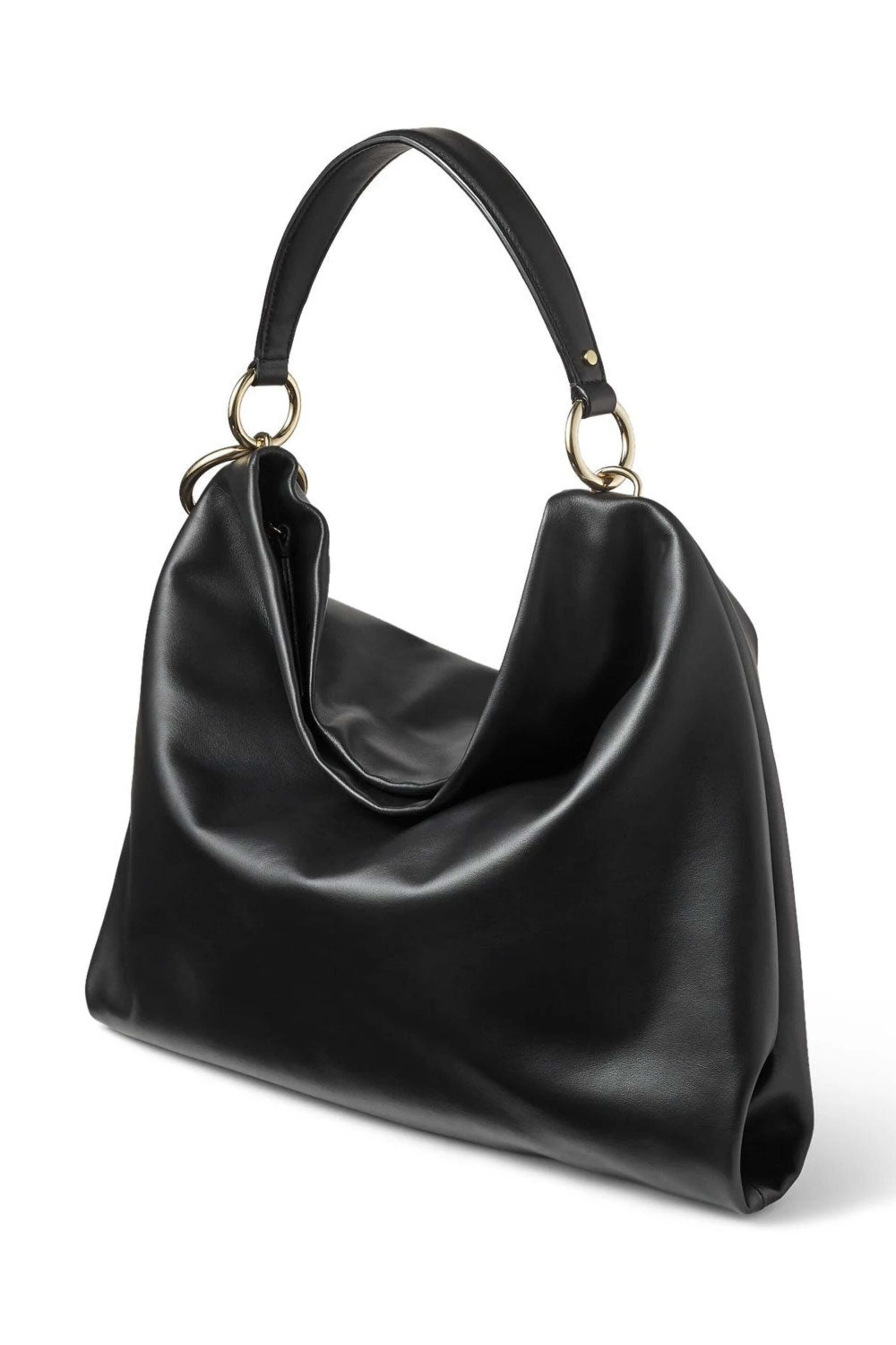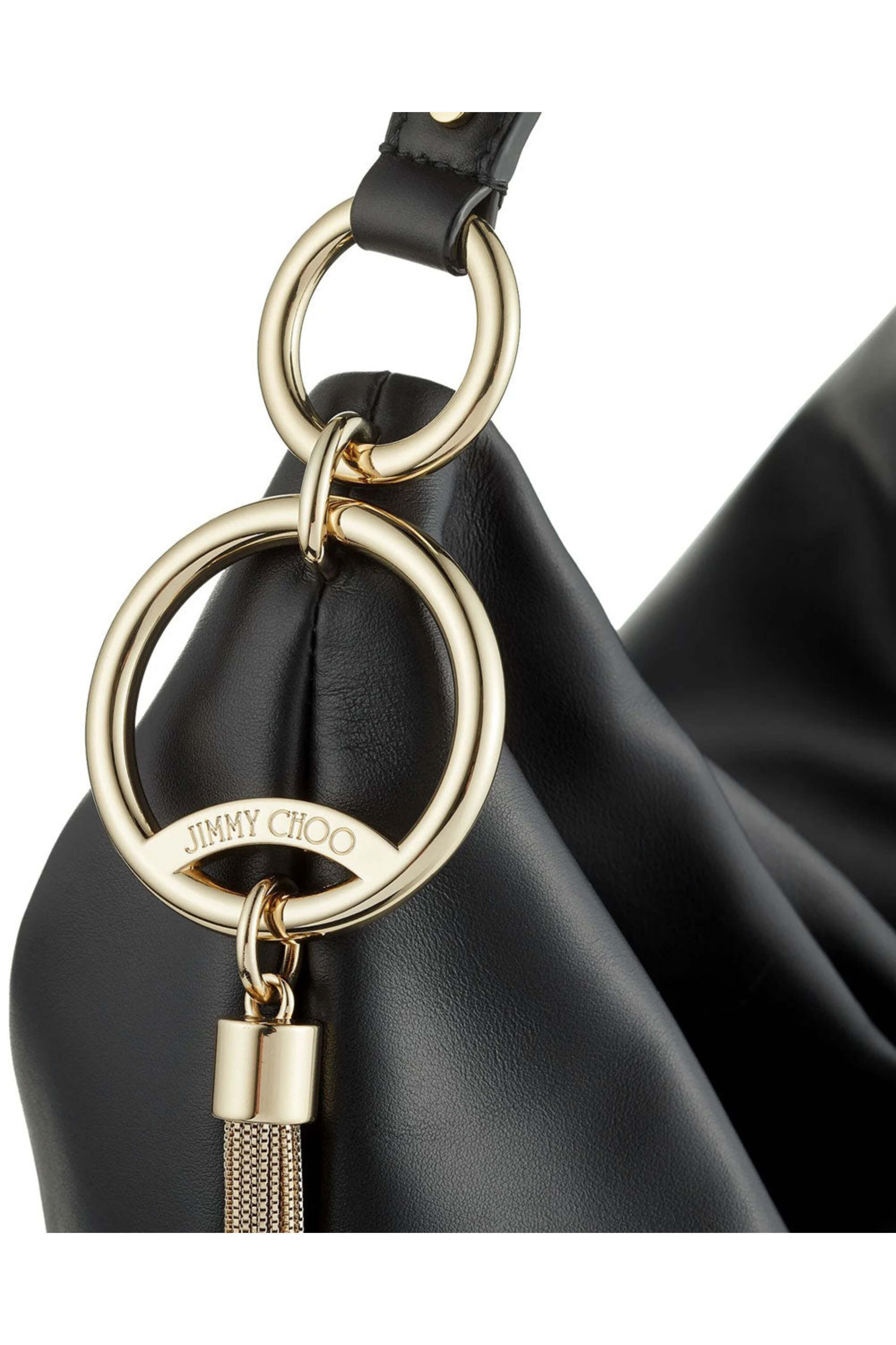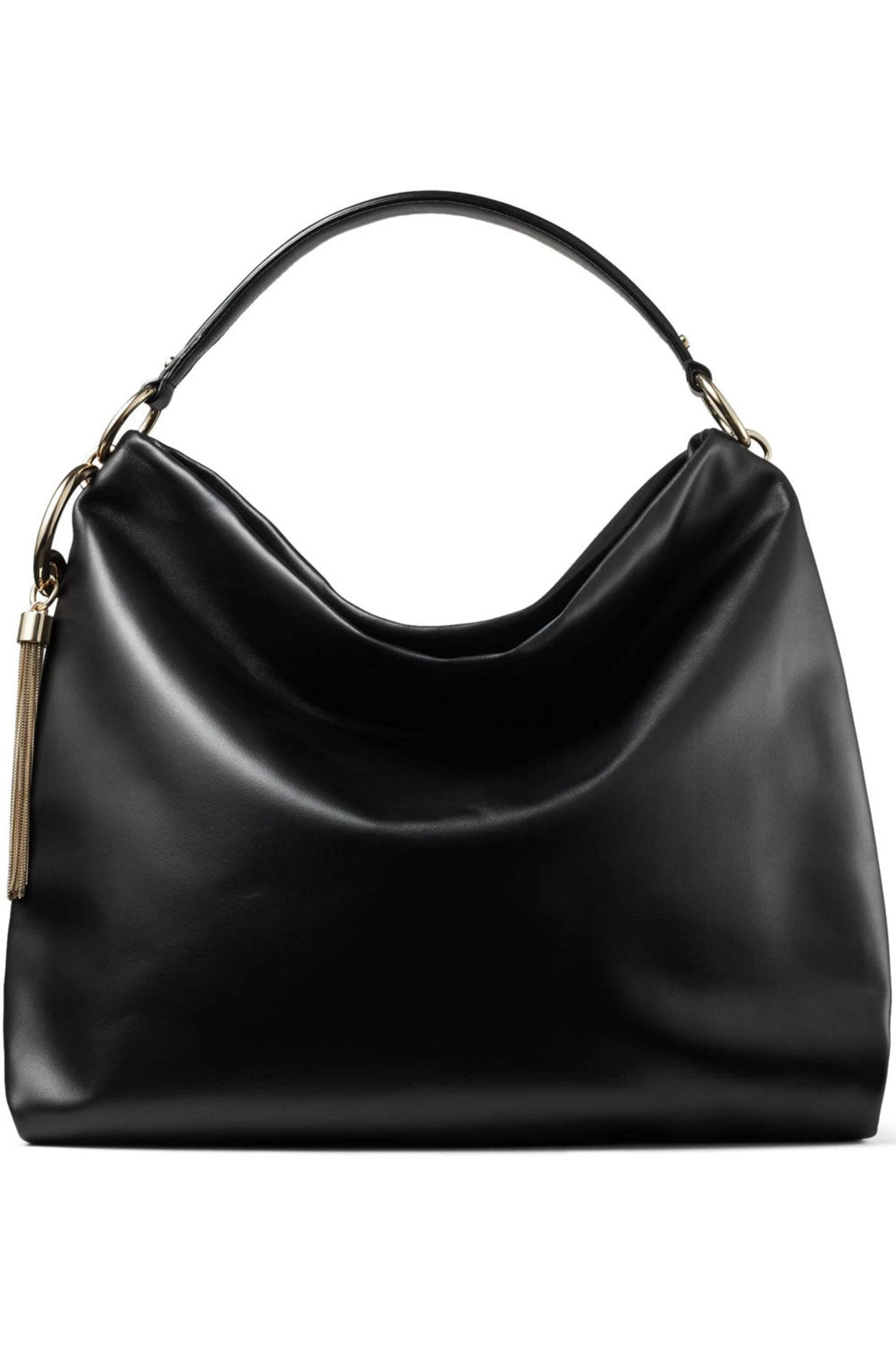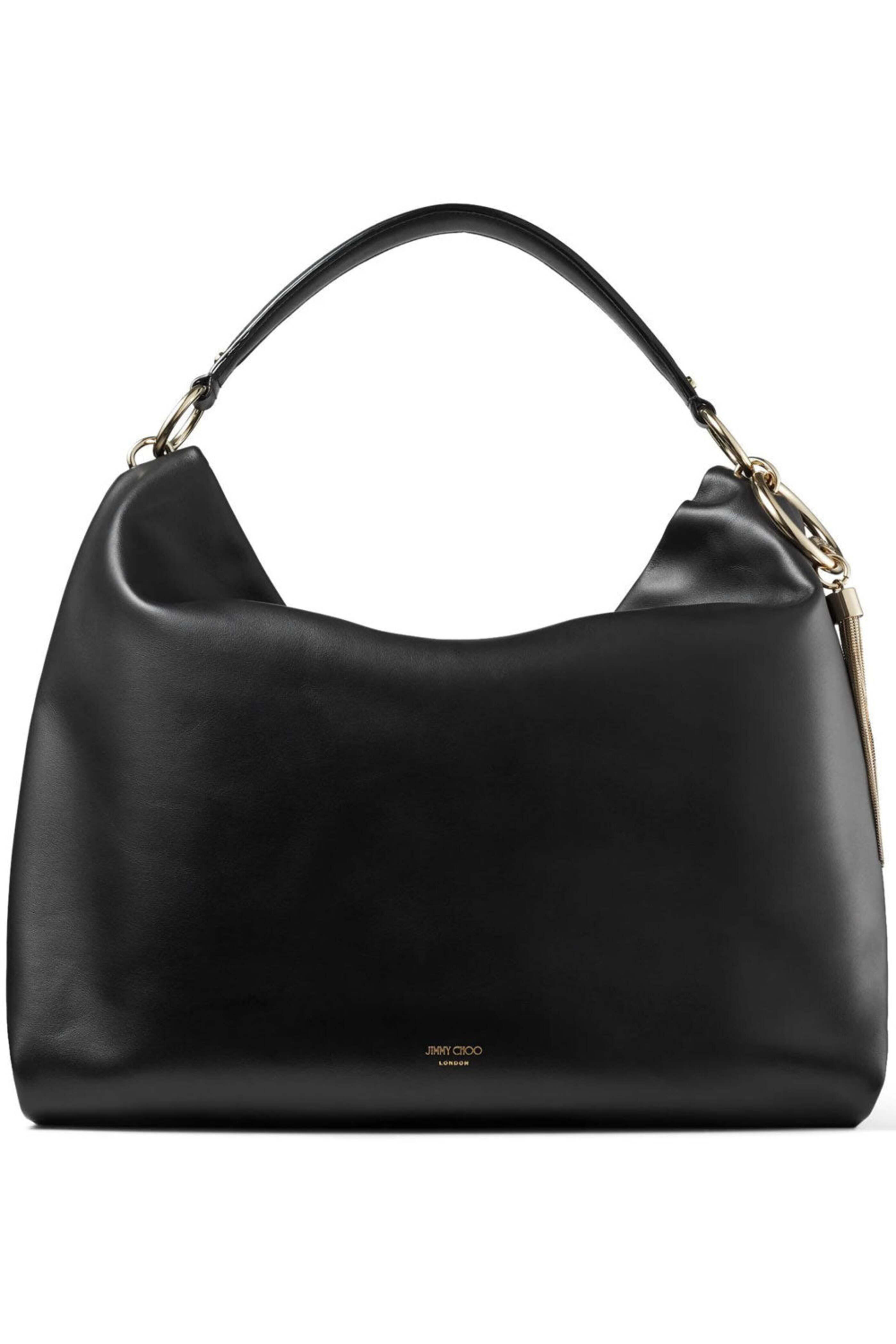 - Jimmy Choo Large Black Callie Hobo Bag Large smooth calf leather hobo bag Top zip closure Chain-trimmed leather shoulder strap Tassel trim Leather lined interior One zip pocket Tonal stitching 10 handle drop 14.5 W X 14 T X 4 D Made in Italy