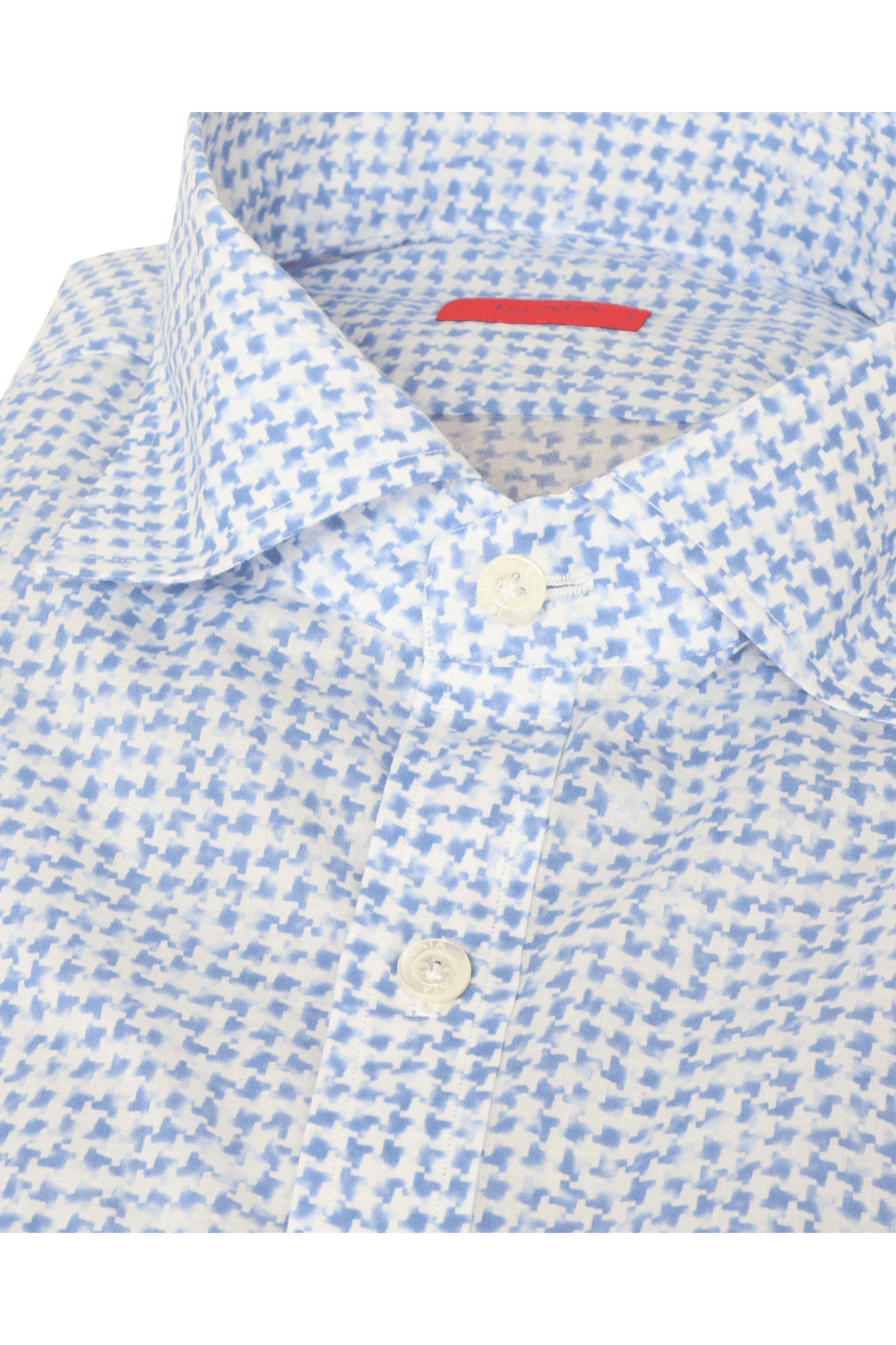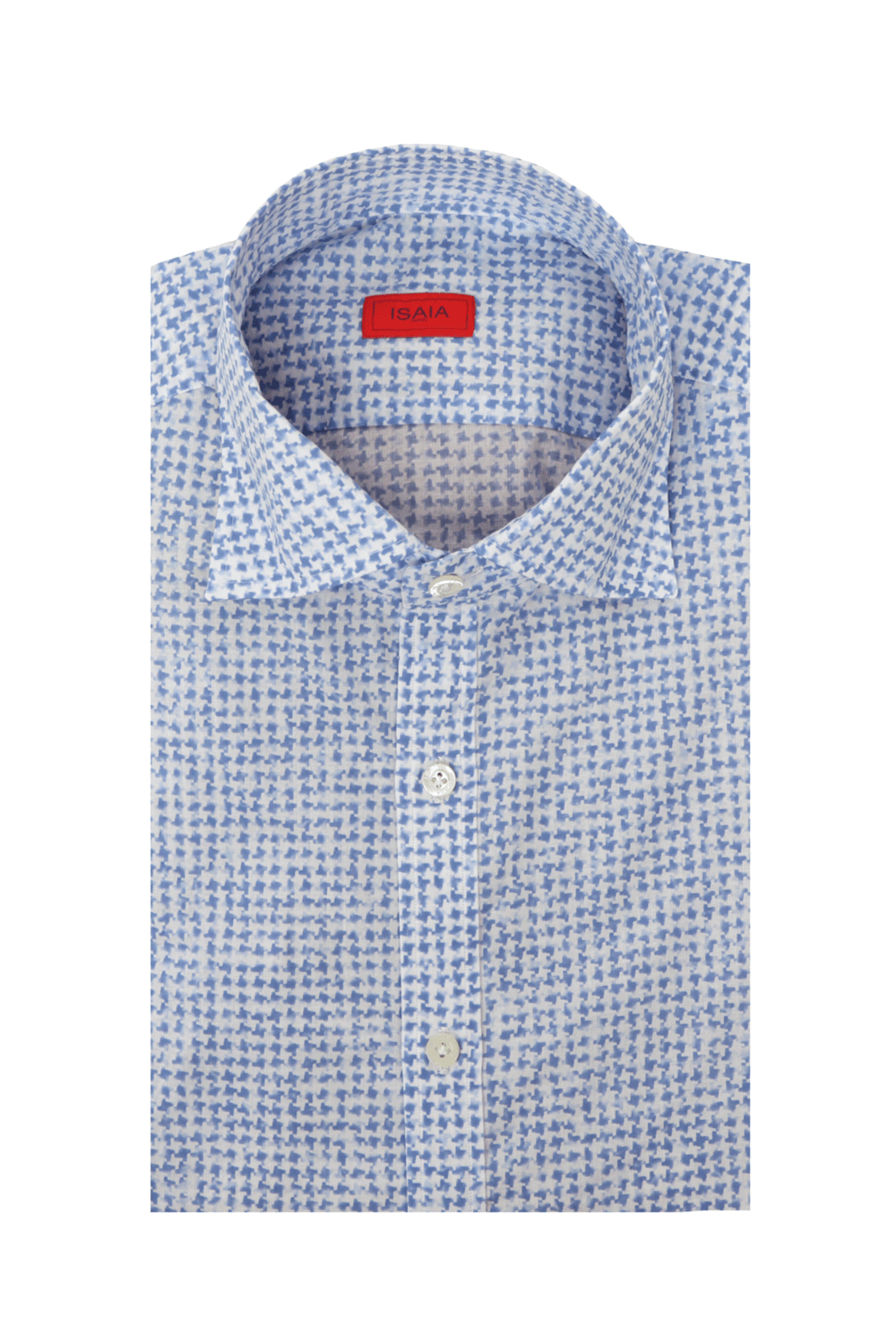 Isaia Faded Blue Houndstooth Sportshirt. Spread collar. Front button placket. Short sleeves. Made in Italy. 100% cotton.
