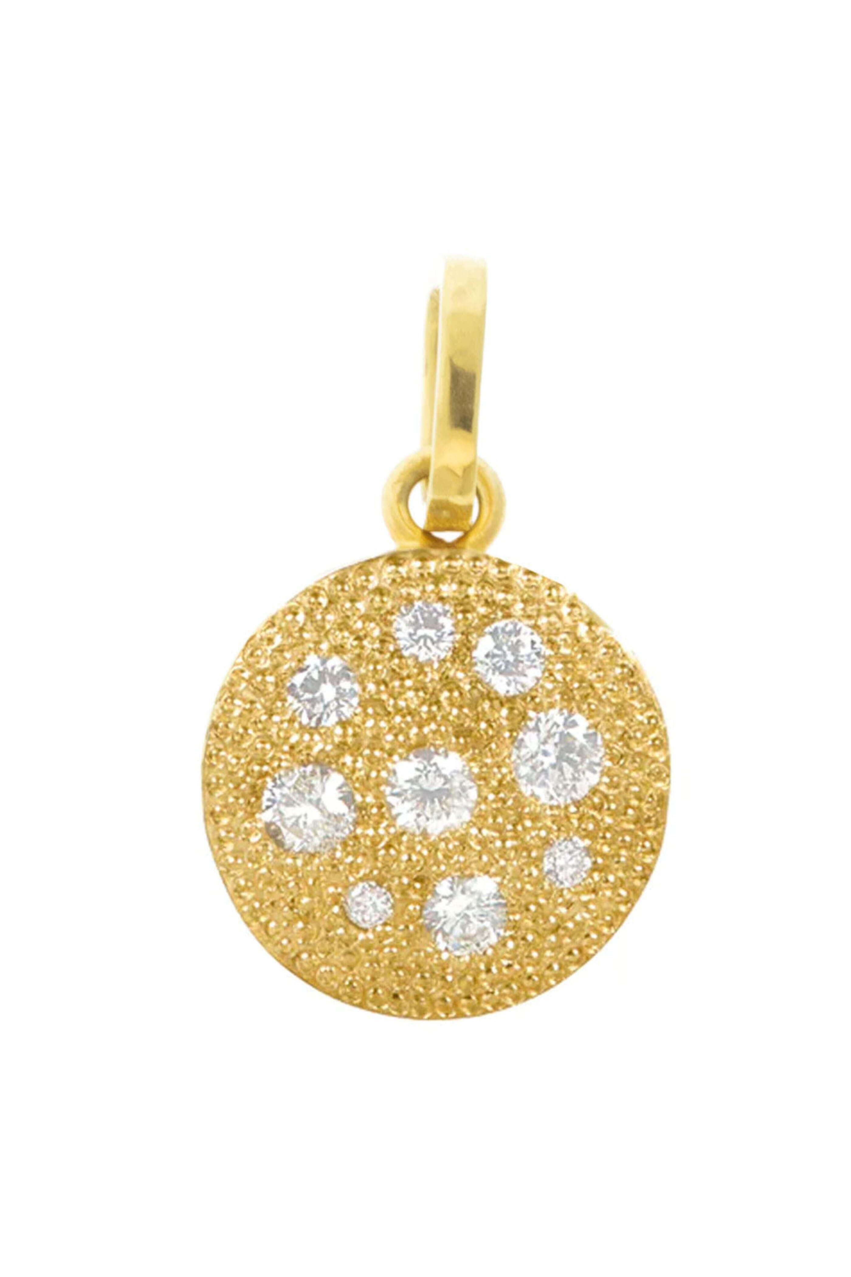 .925Suneera 14k Gold Scattered Diamond Oval Mini Pendant. 14k yellow gold. Diamond 0.10 total carat weight. Scattered diamonds. Mini oval pendant. 5cm width. Handcrafted in L.A.