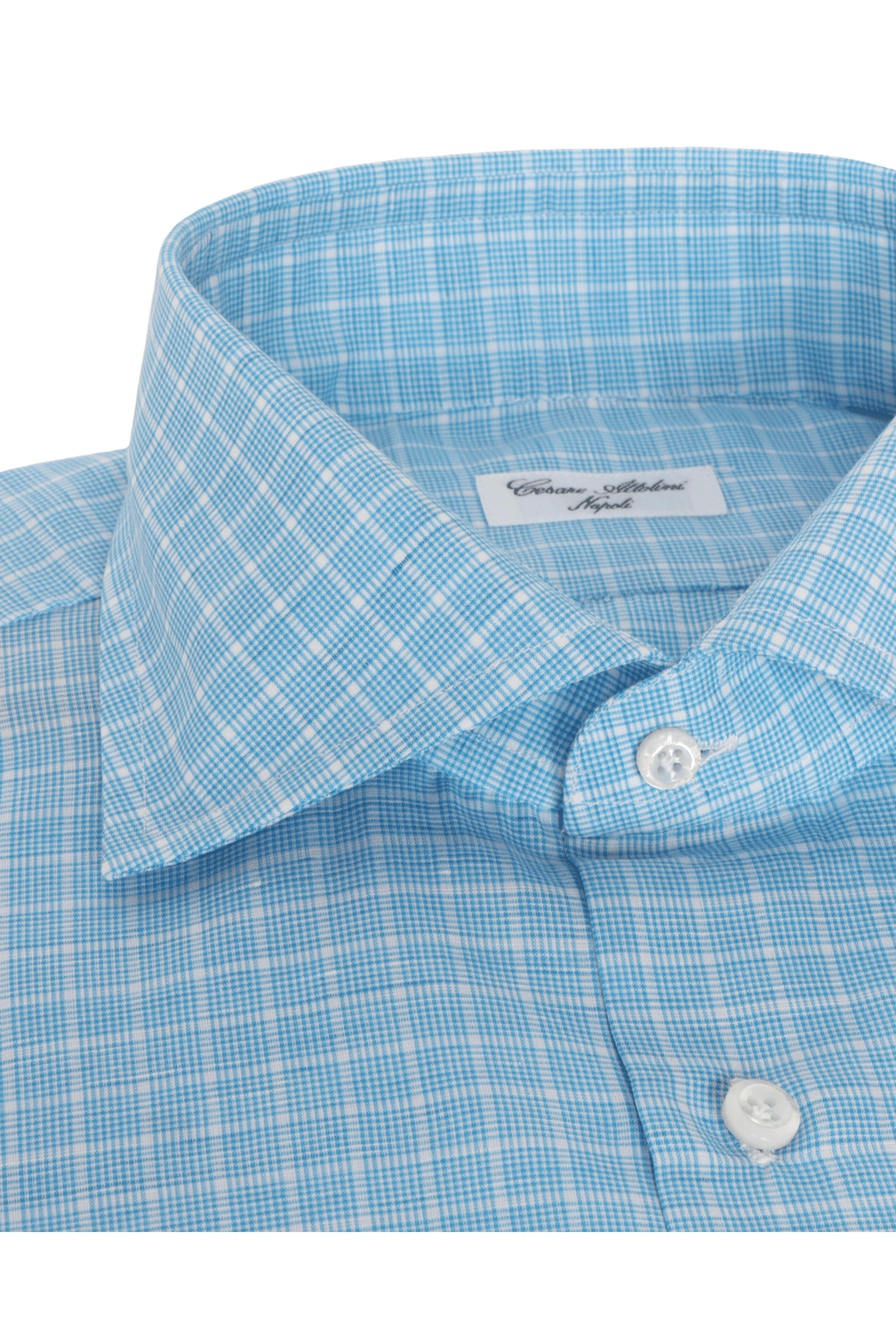 Cesare Attolini Blue Graph Sportshirt. Spread collar. Button down front closure. Long sleeves. Mitered barrel cuffs. Curved hem. Made in Italy . 64% cotton, 36% linen.