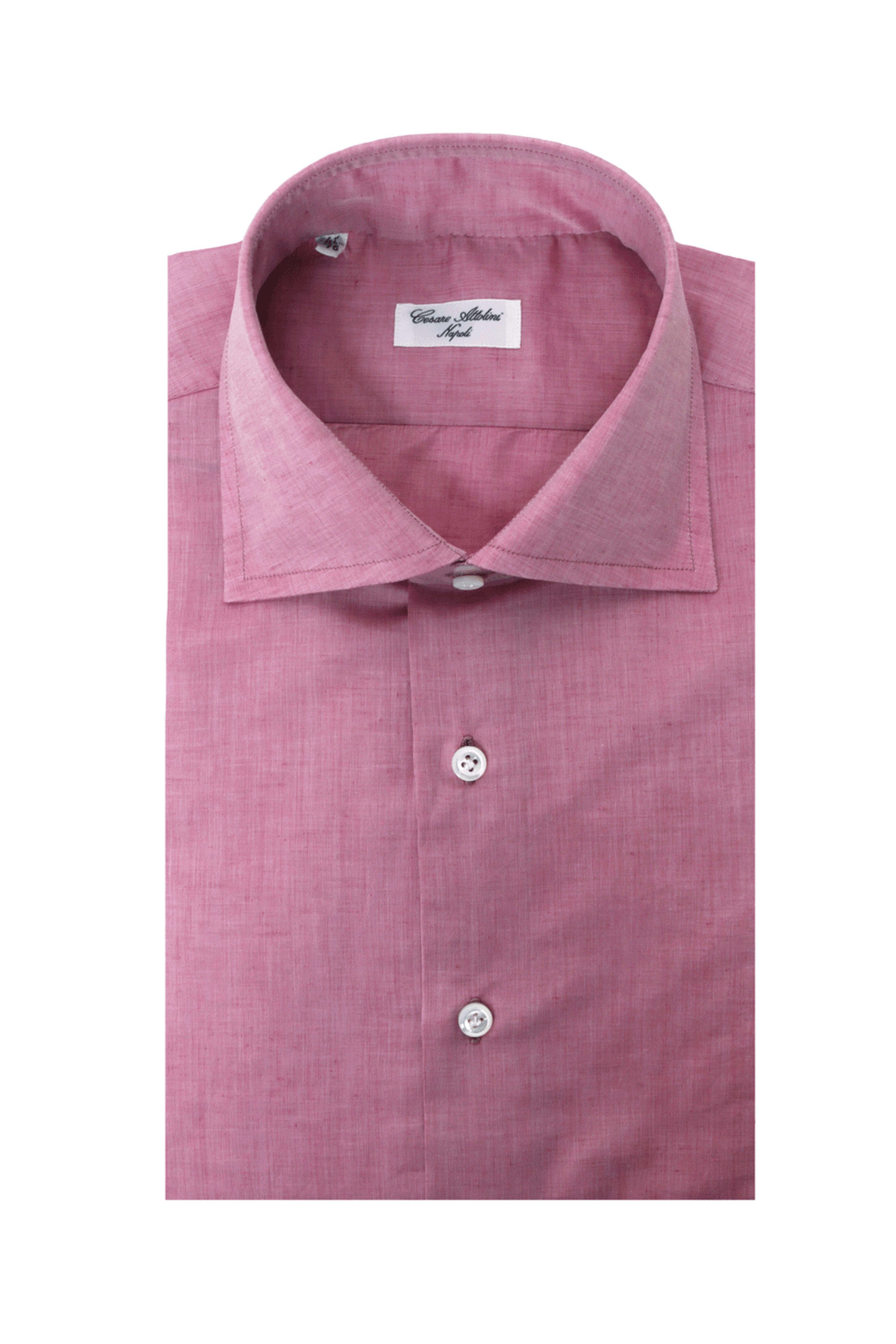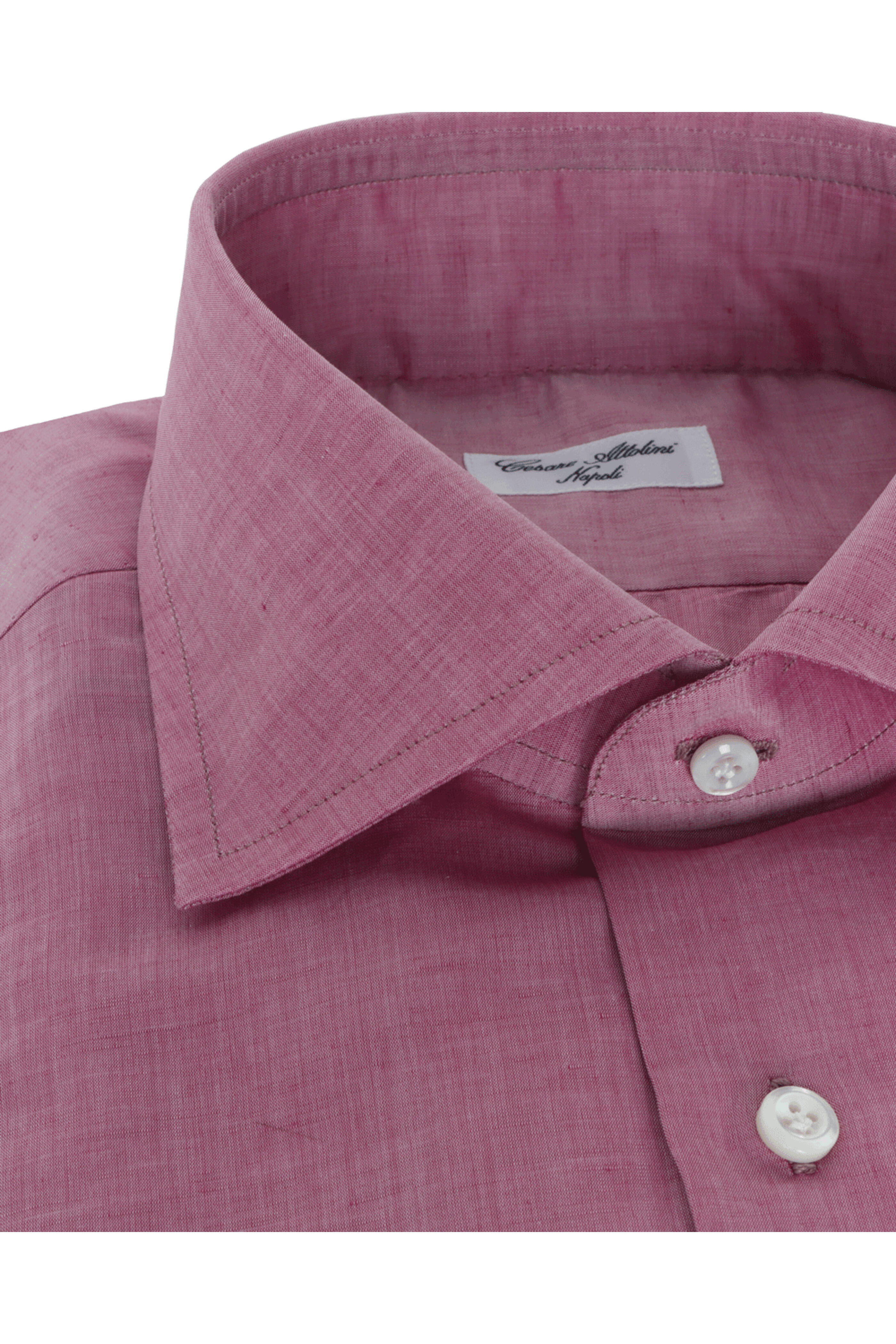 Cesare Attolini Solid Rose Dress Shirt. Spread collar. Button down front closure. Long sleeves. Barrel mitered cuffs. Curved hem. Made in Italy . 63% cotton, 37% linen.