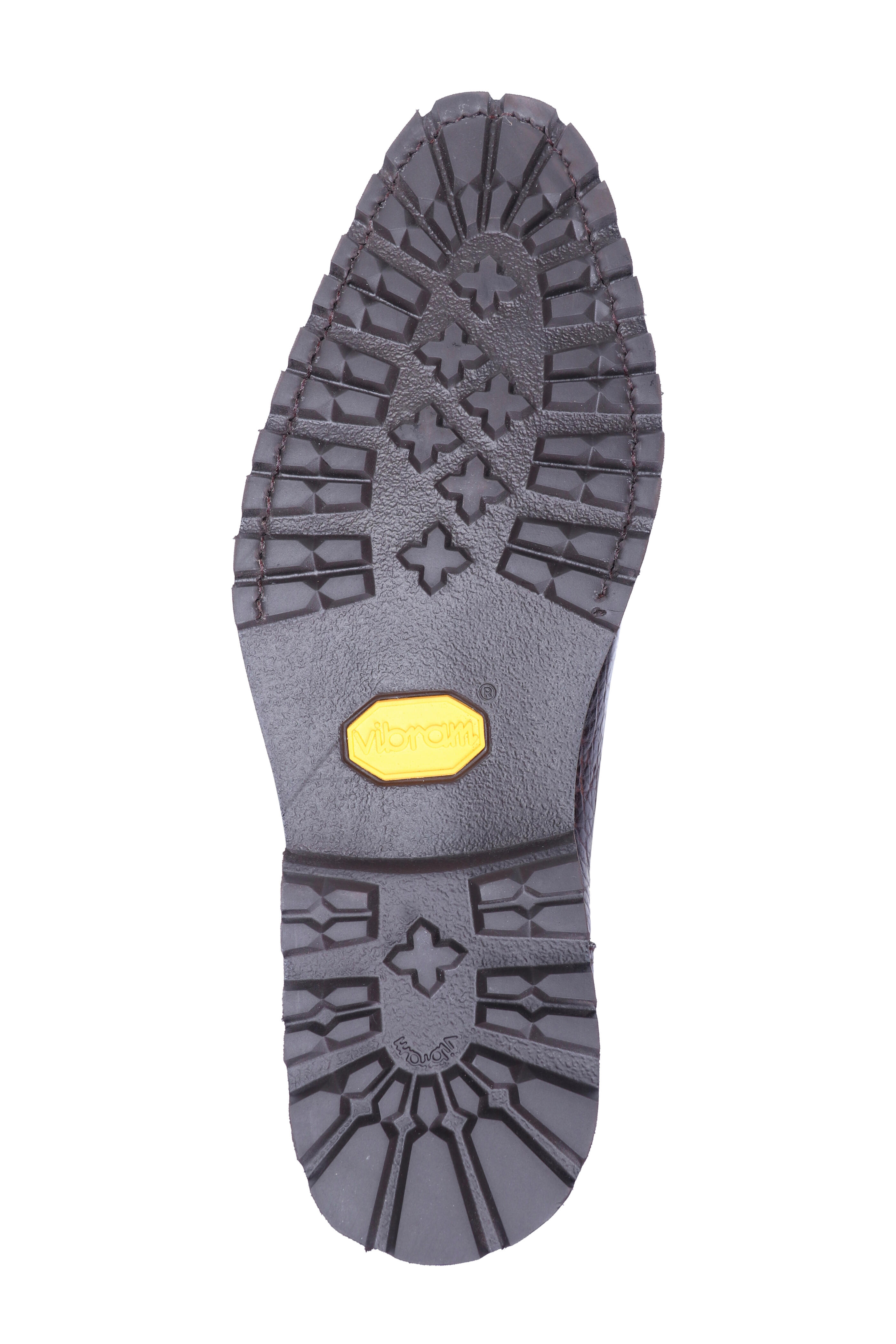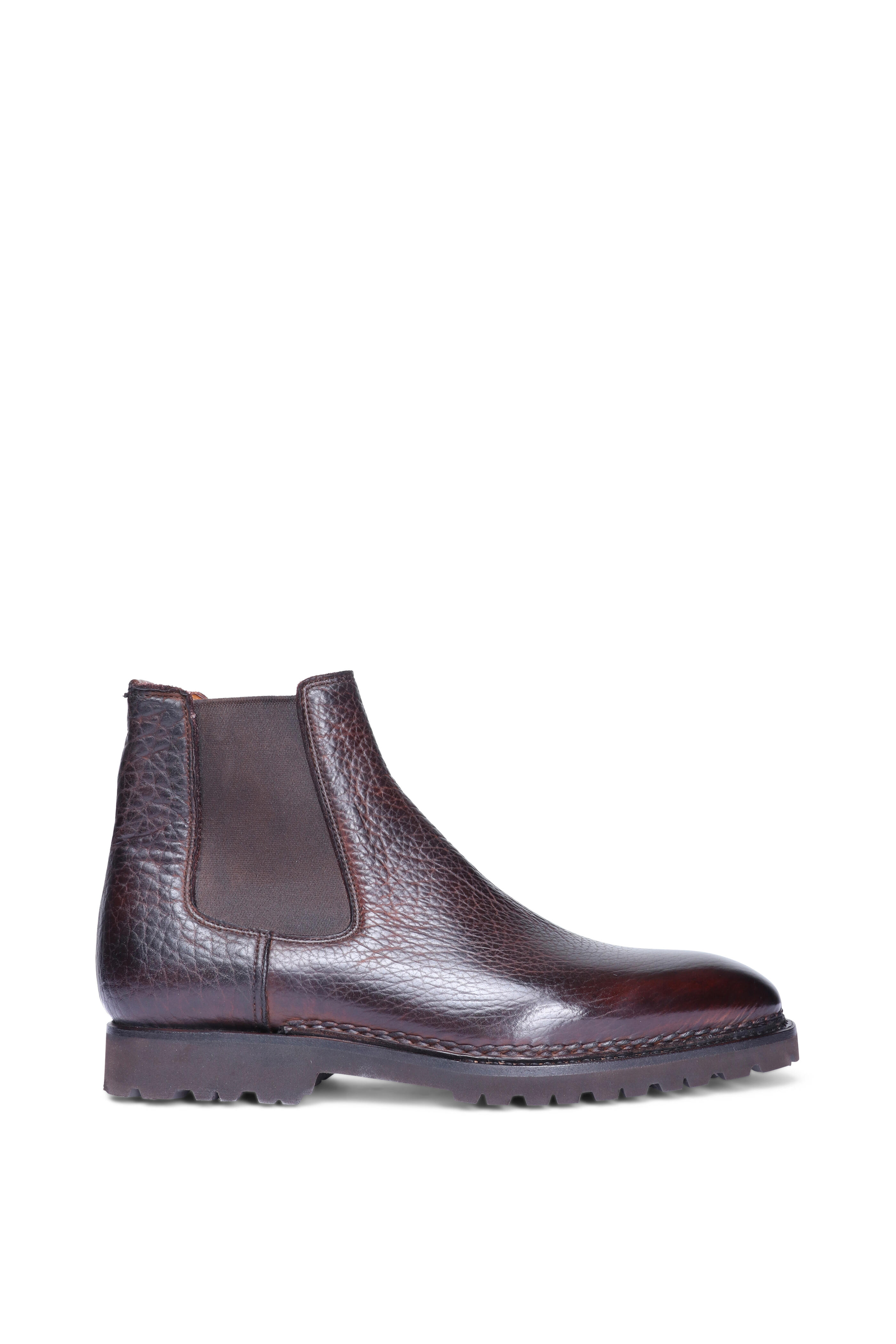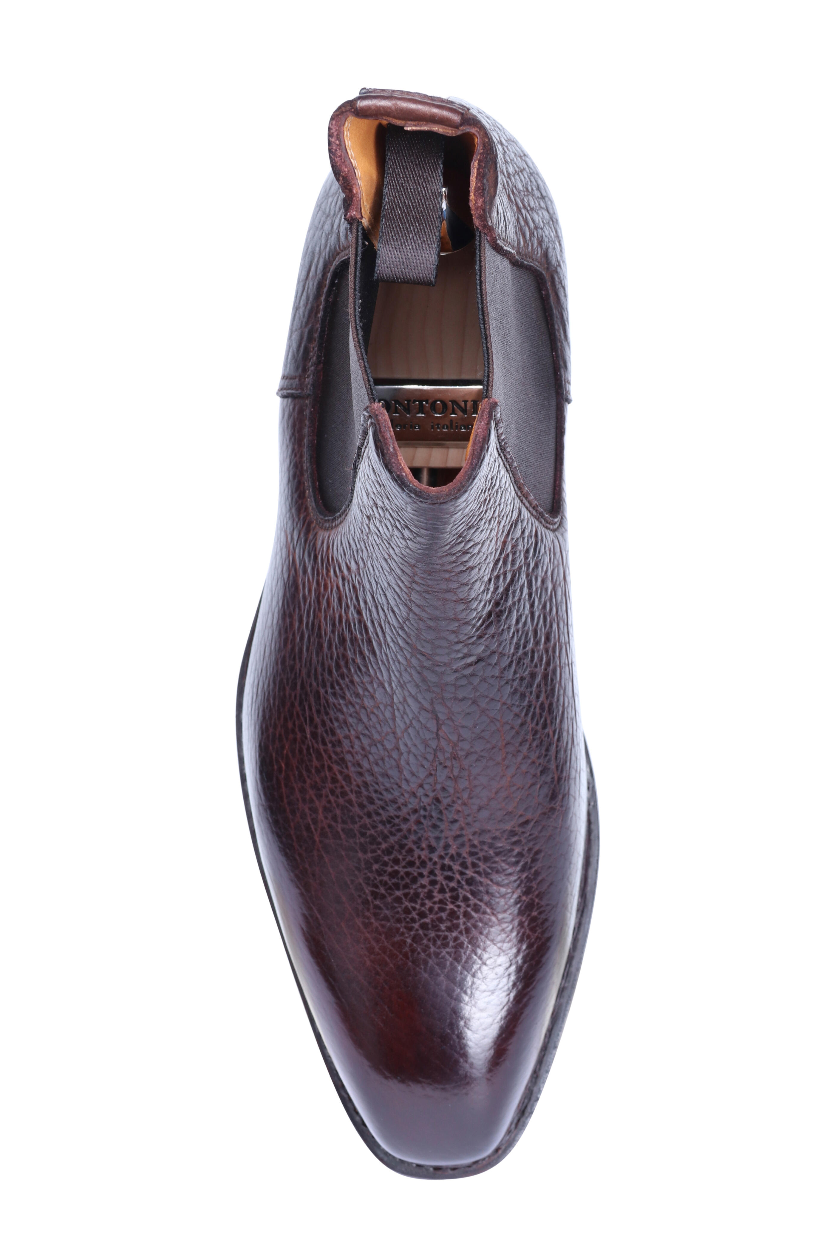 Bison leather upper. Leather lining. Lug sole. Almond toe. Elasticized side gores. Norwegian stitch. Shoe tree included. Pull-on style. Made in Italy. All sizes listed are in US measurements.