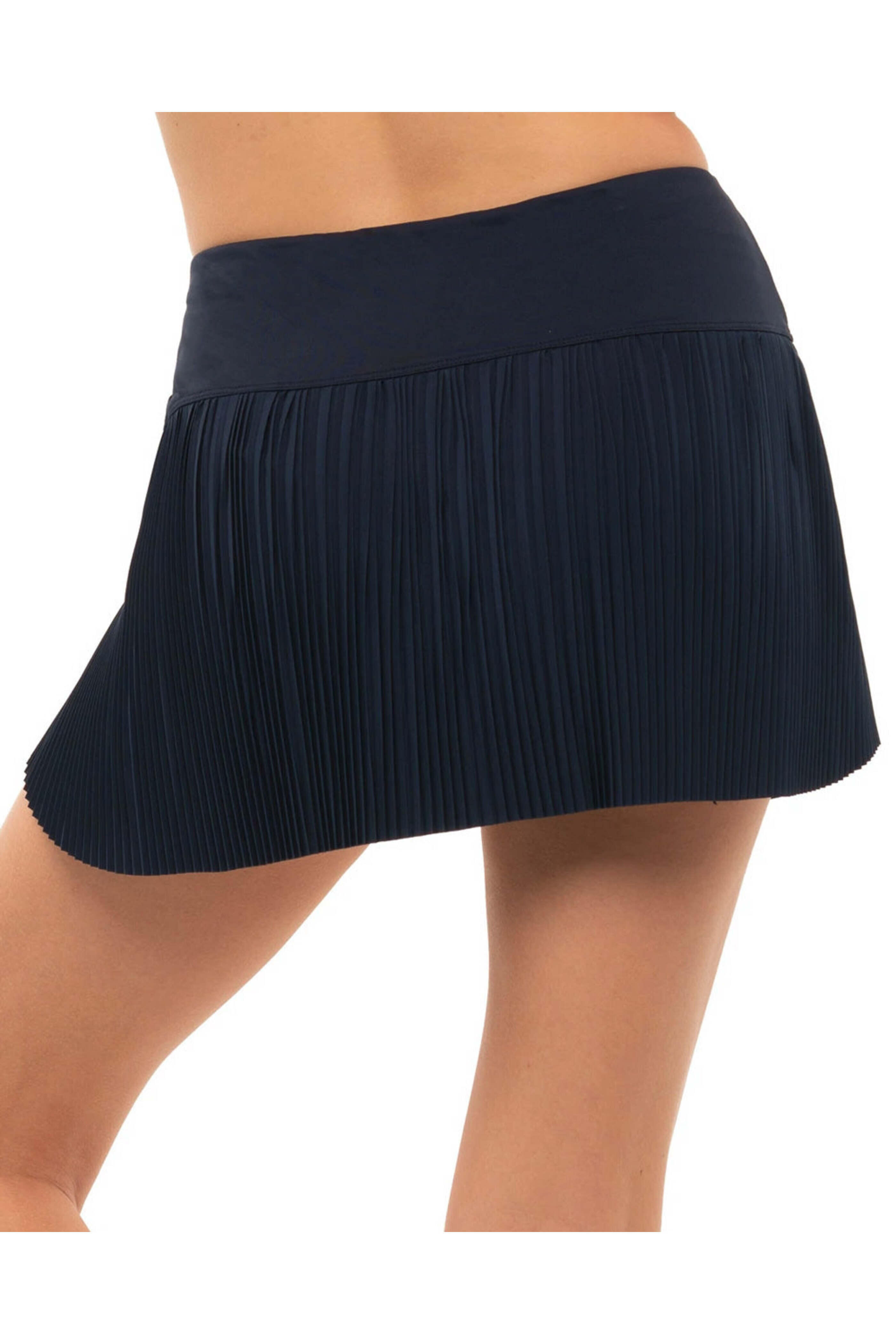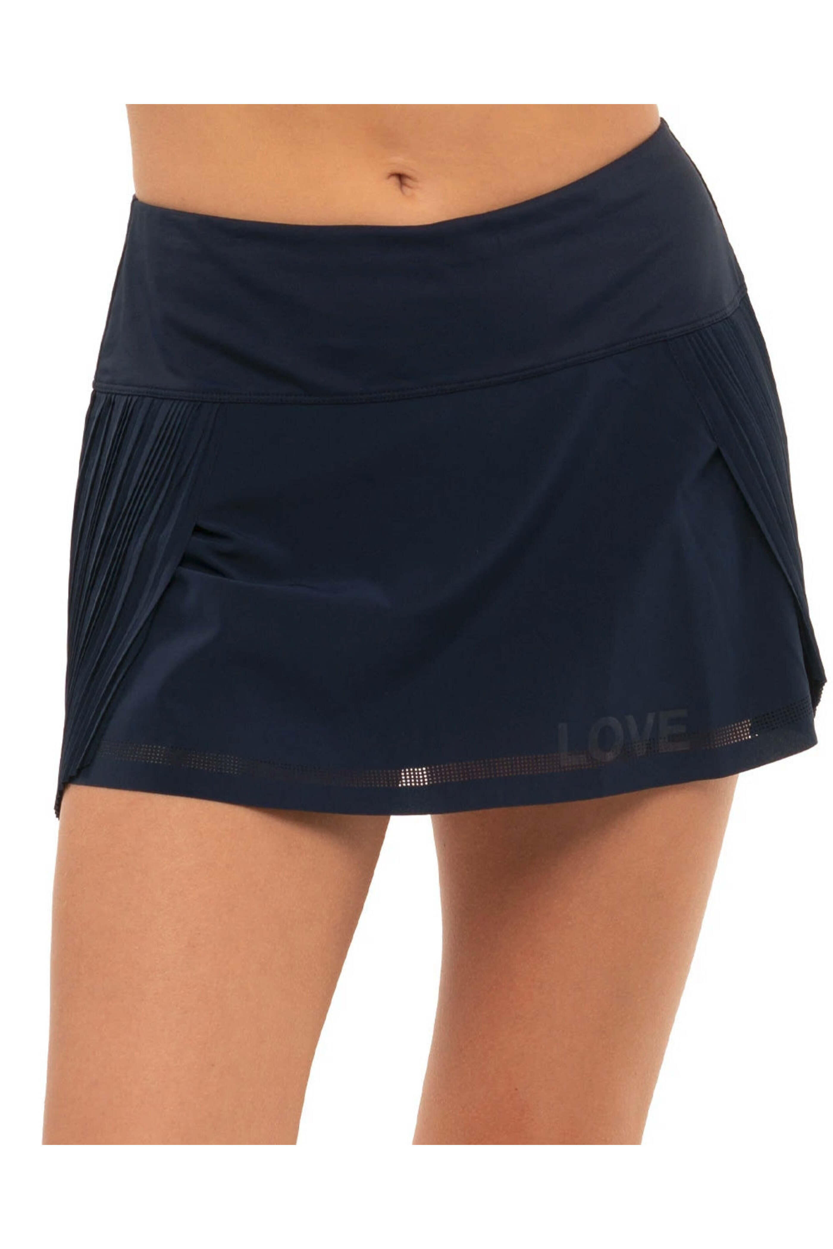 Lucky In Love Midnight Love Is Power Skirt. Mid rise. 12 length. Athletic fit; semi-fitted. White undershorts. Made in El Salvador. 90% polyester; 10% spandex.