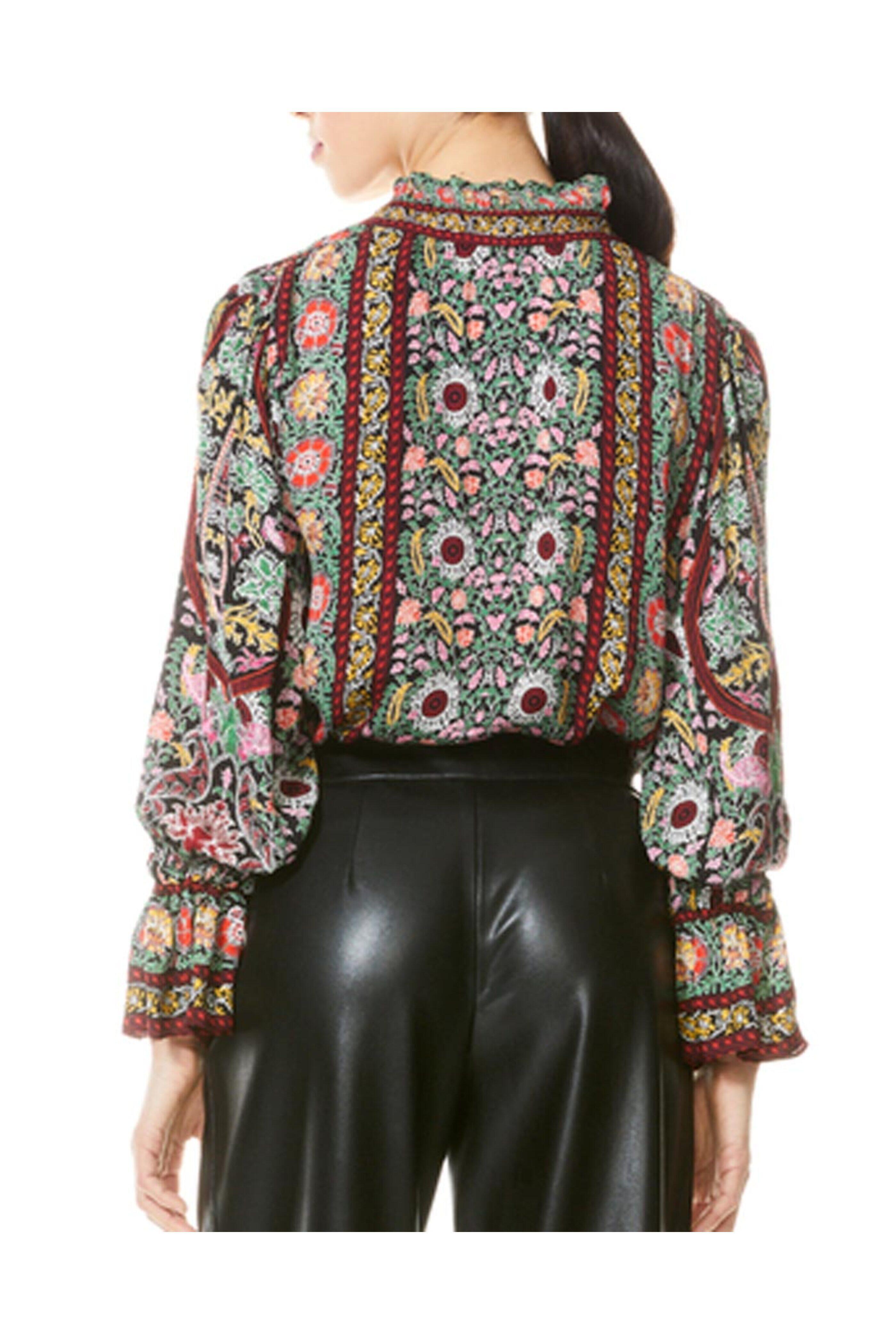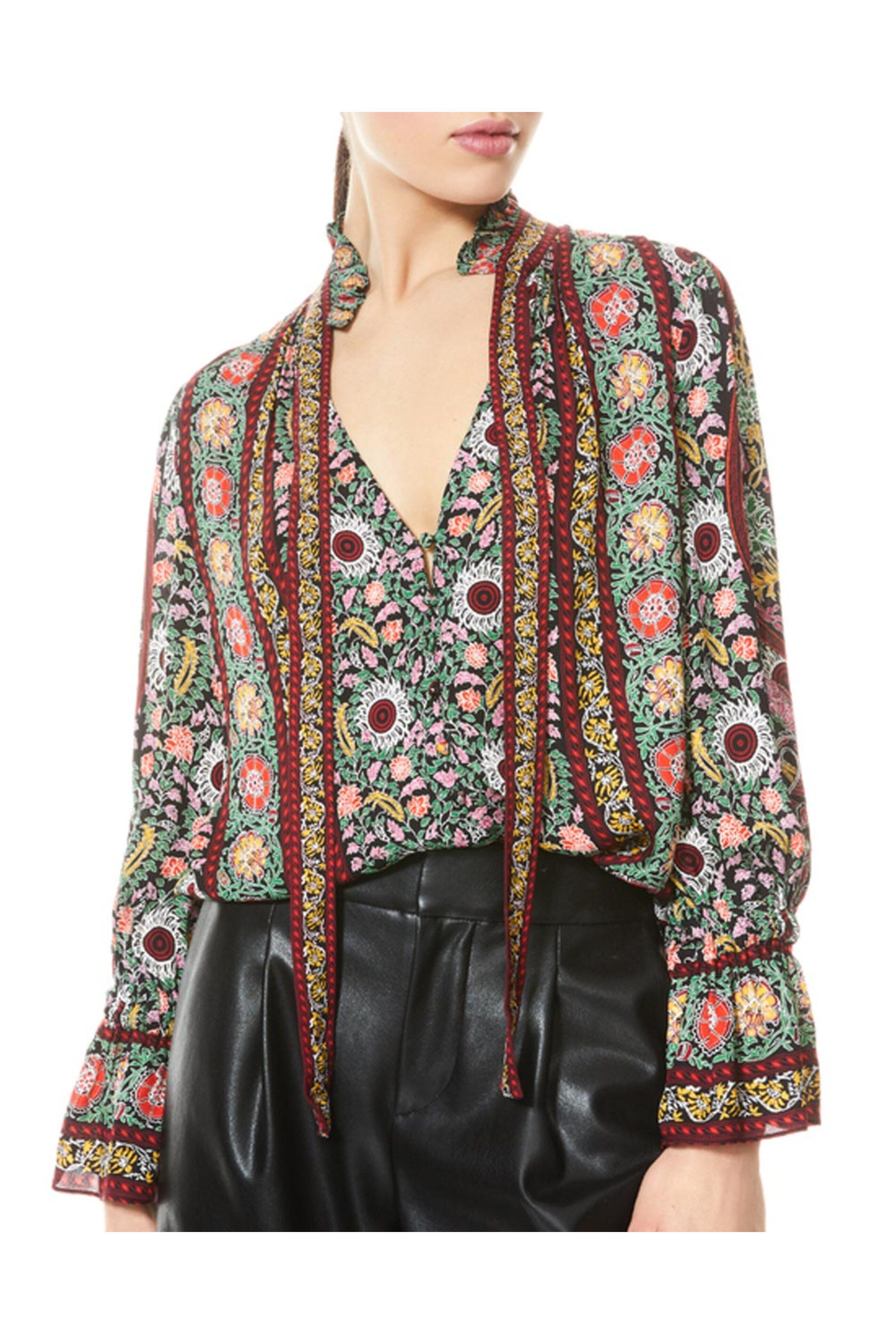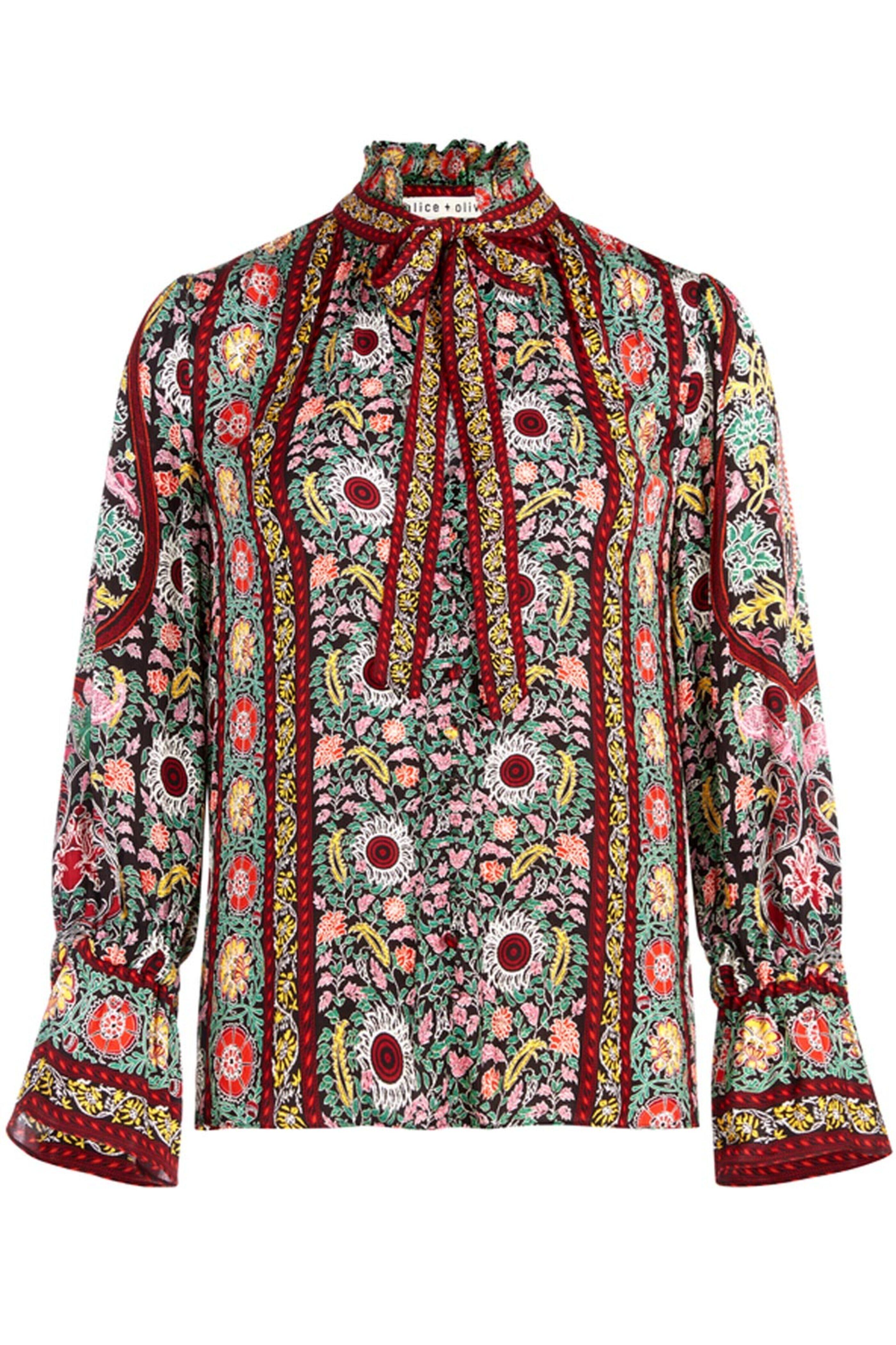 - Alice + Olivia Black Floral Print Tie Neck Reilly Blouse V neck; ruffle detail Self-tie detail at neck Long sleeves; elastic cuffs Relaxed fit 100% viscose