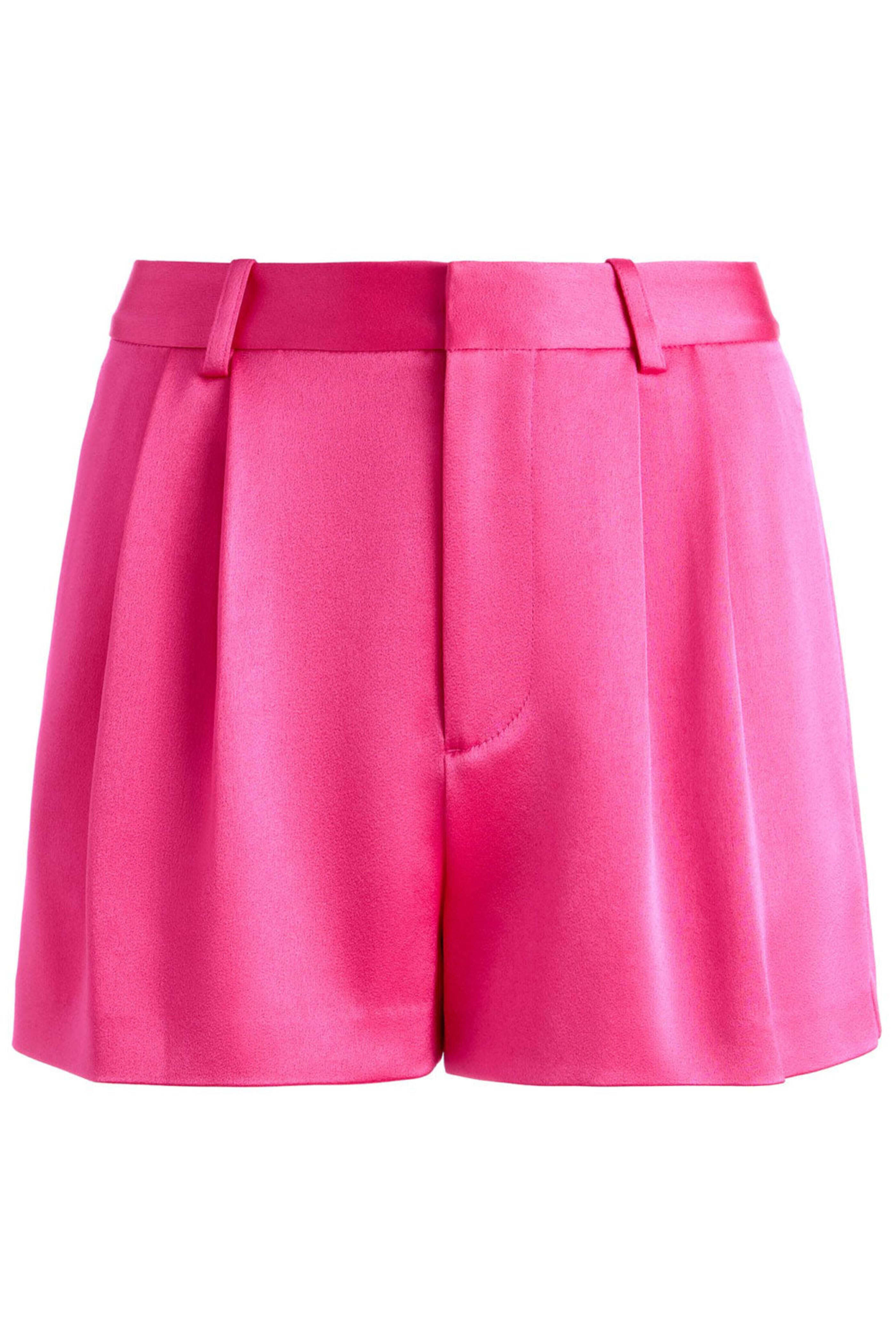 Alice + Olivia Candy Conry Pleated Short. Mid rise. Hook and eye closure; zip fly. Belt loops. Front pleat detail. Wide through leg. Short length. 98% polyester, 2% elastane.