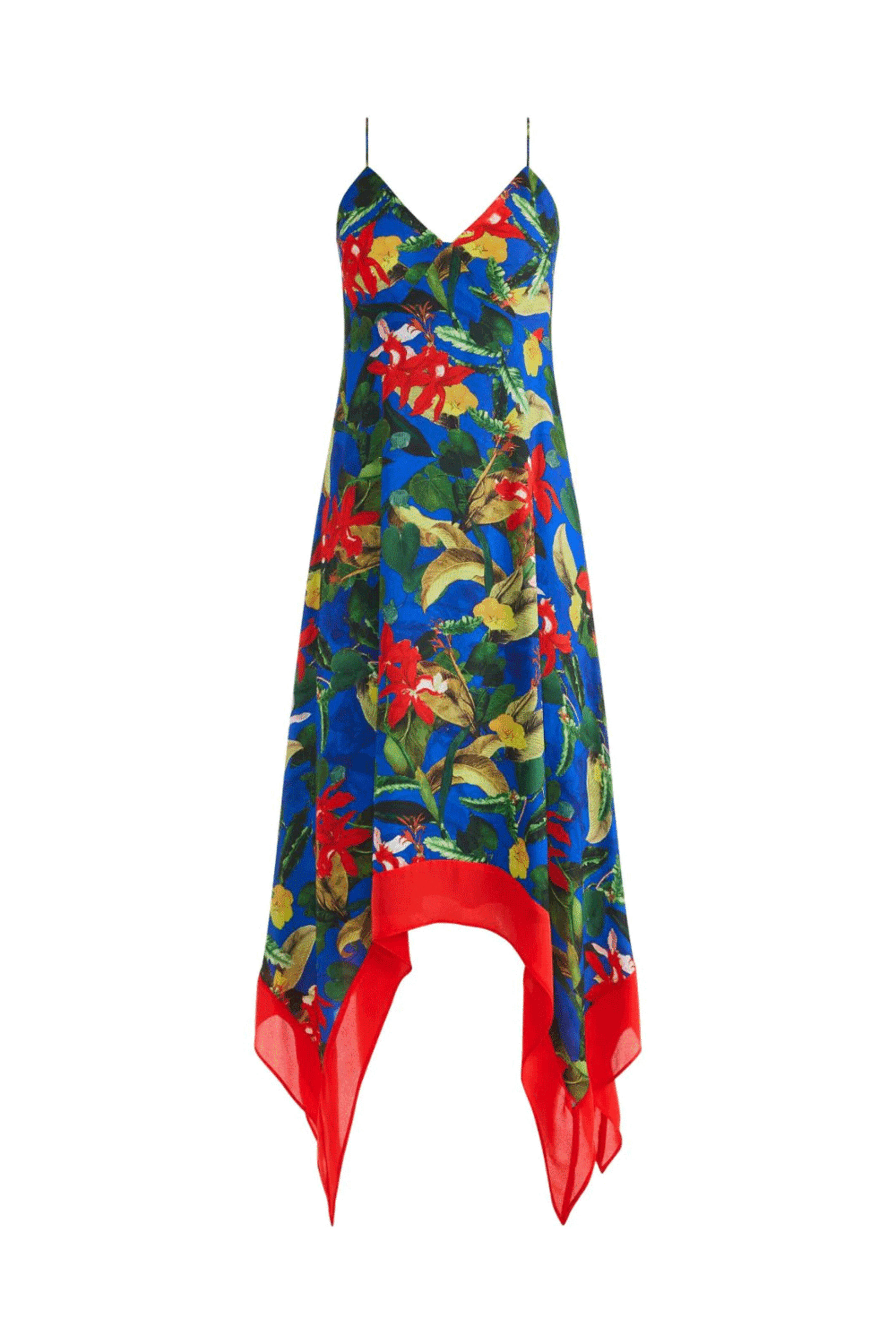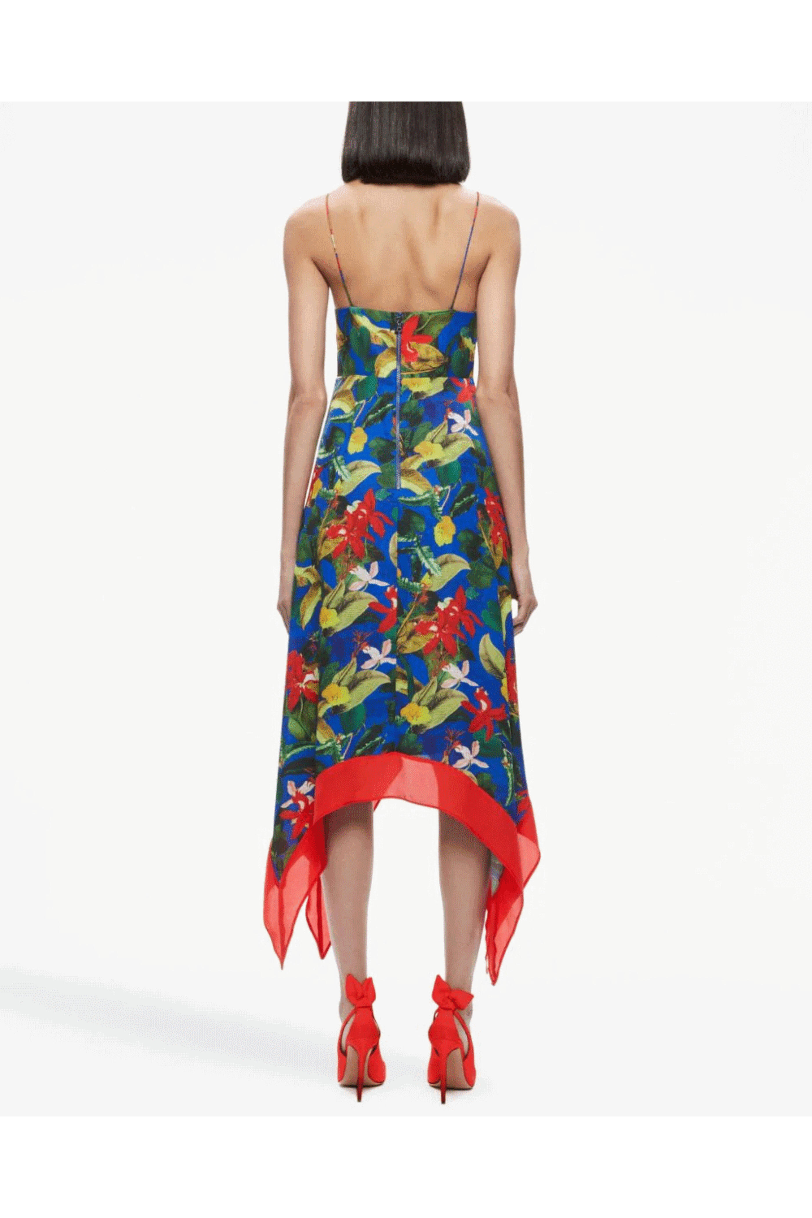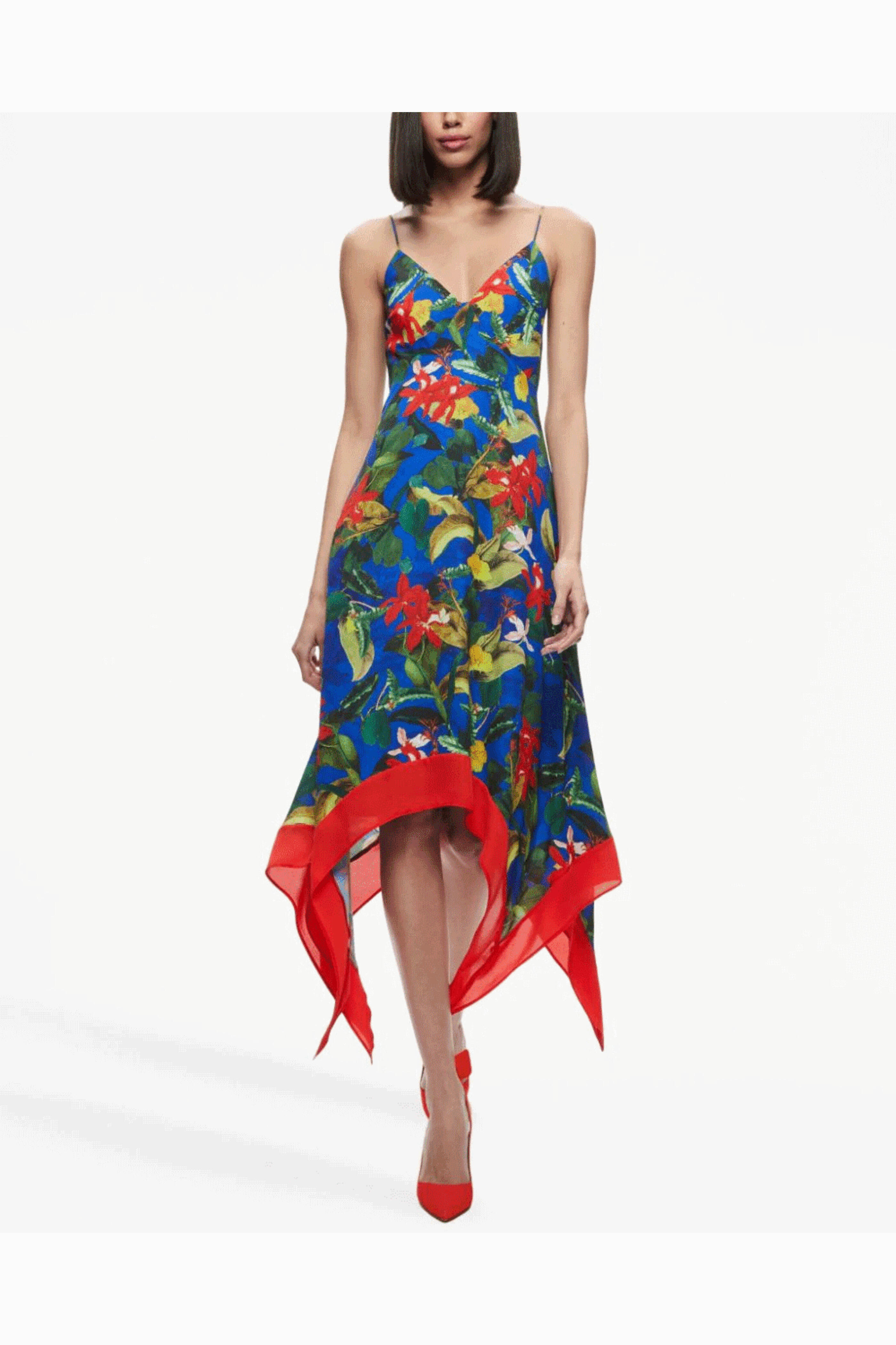 Alice + Olivia Sapphire and White Kayson Handkerchief Hem Dress. V neck. Square neck. Sleeveless. Back zip closure. Bust seam detail. Handkerchief hem. Midi length. 100% polyester.