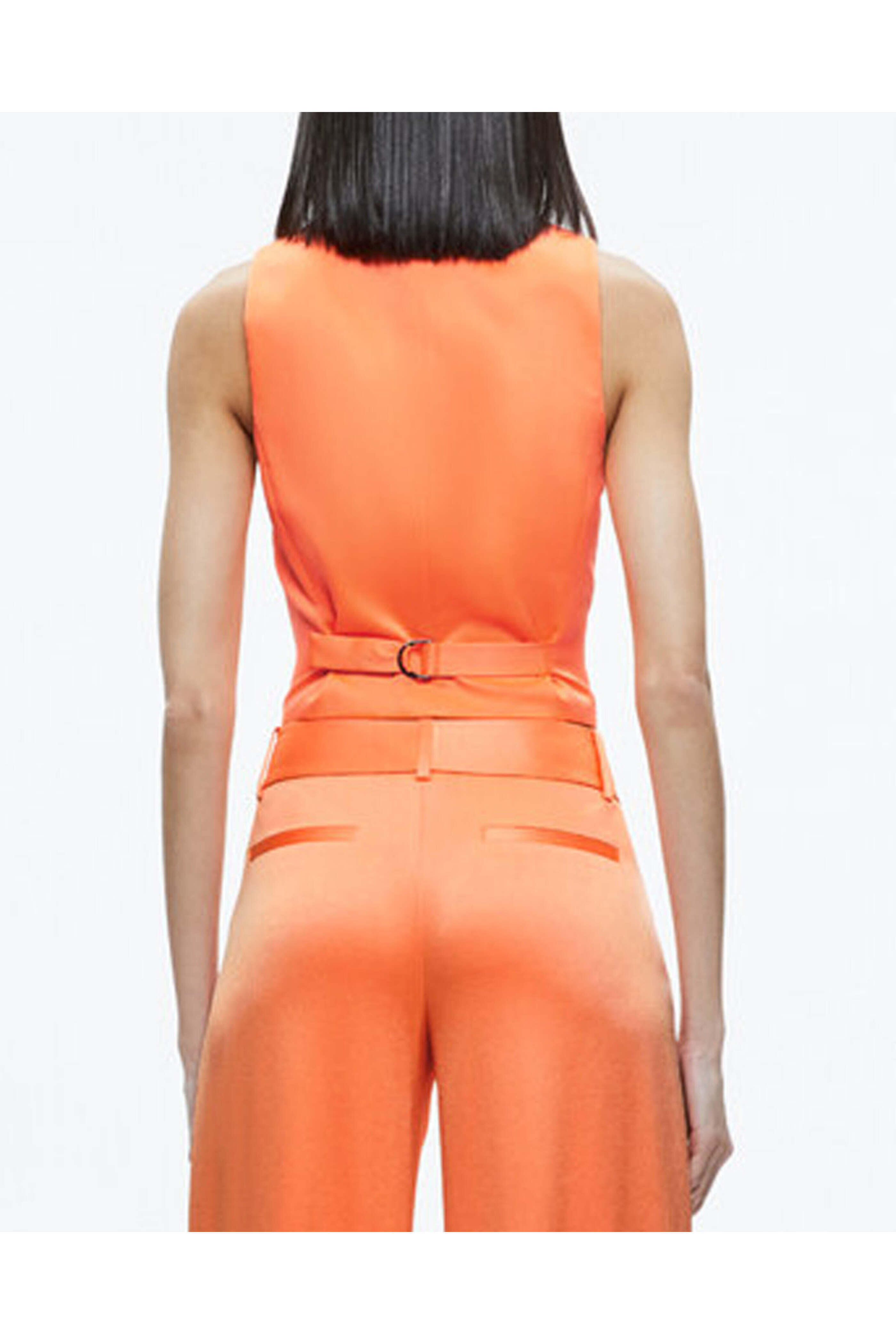 Alice + Olivia Coral Amber Collar Vest. Notch lapel. Sleeveless. Button down front closure. Slim silhouette. Adjustable back tab detail. 75% triacetate, 25% polyester.