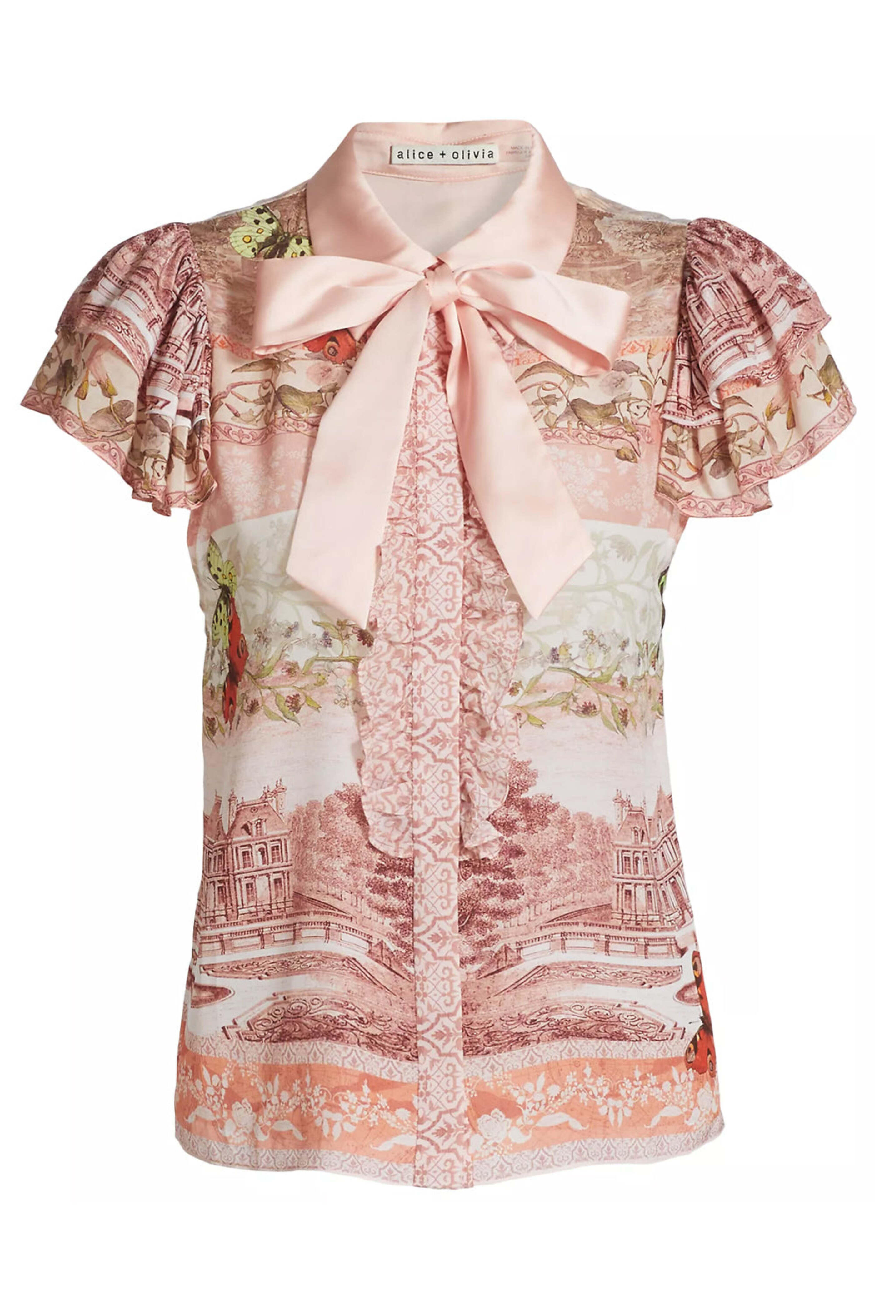 Alice + Olivia Versailles Minda Ruffle Sleeve Blouse. Collar. Front bow detail. Short ruffle sleeves. Concealed button down front placket. Relaxed fit. 100% silk outer 1, 100% polyester outer 2.