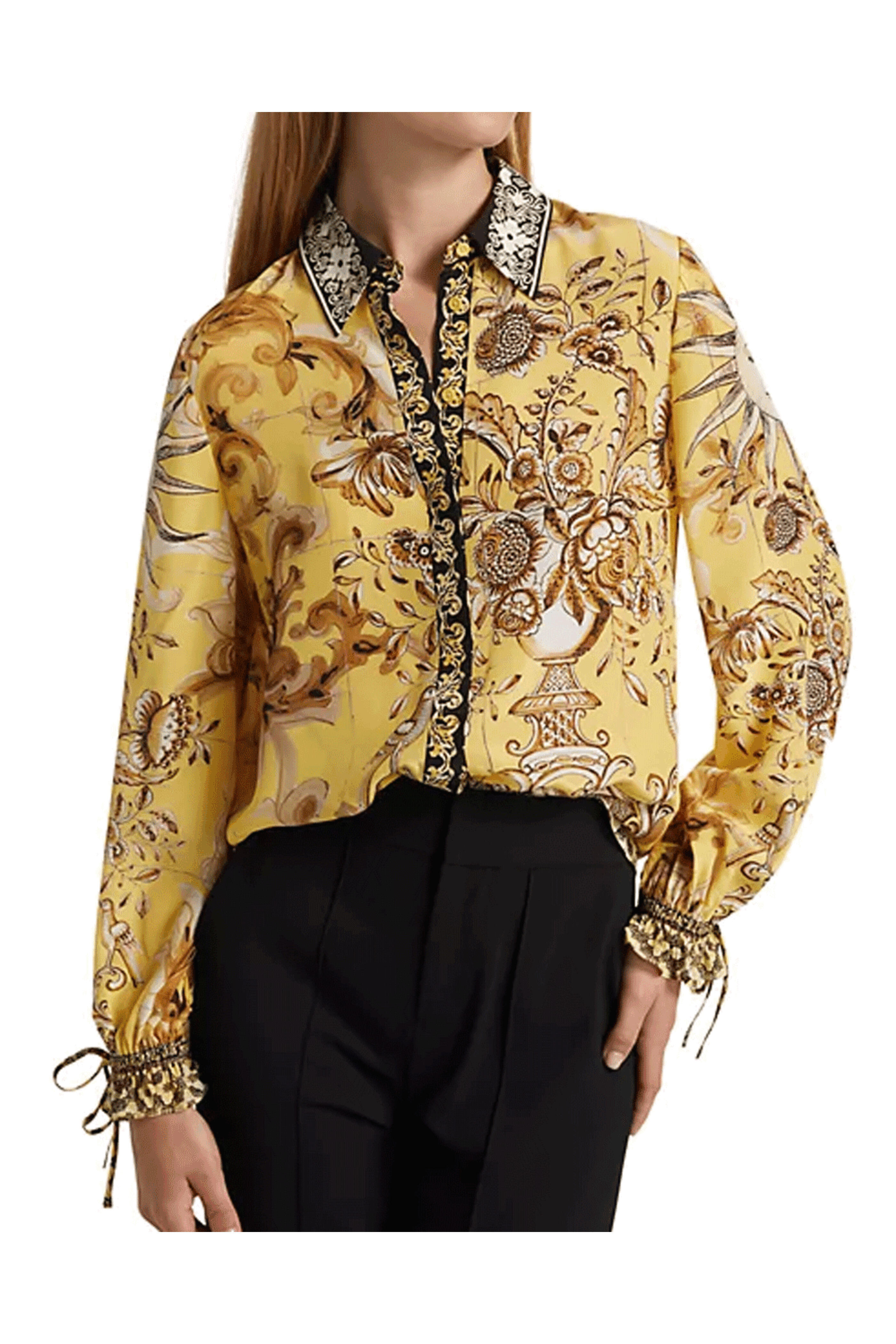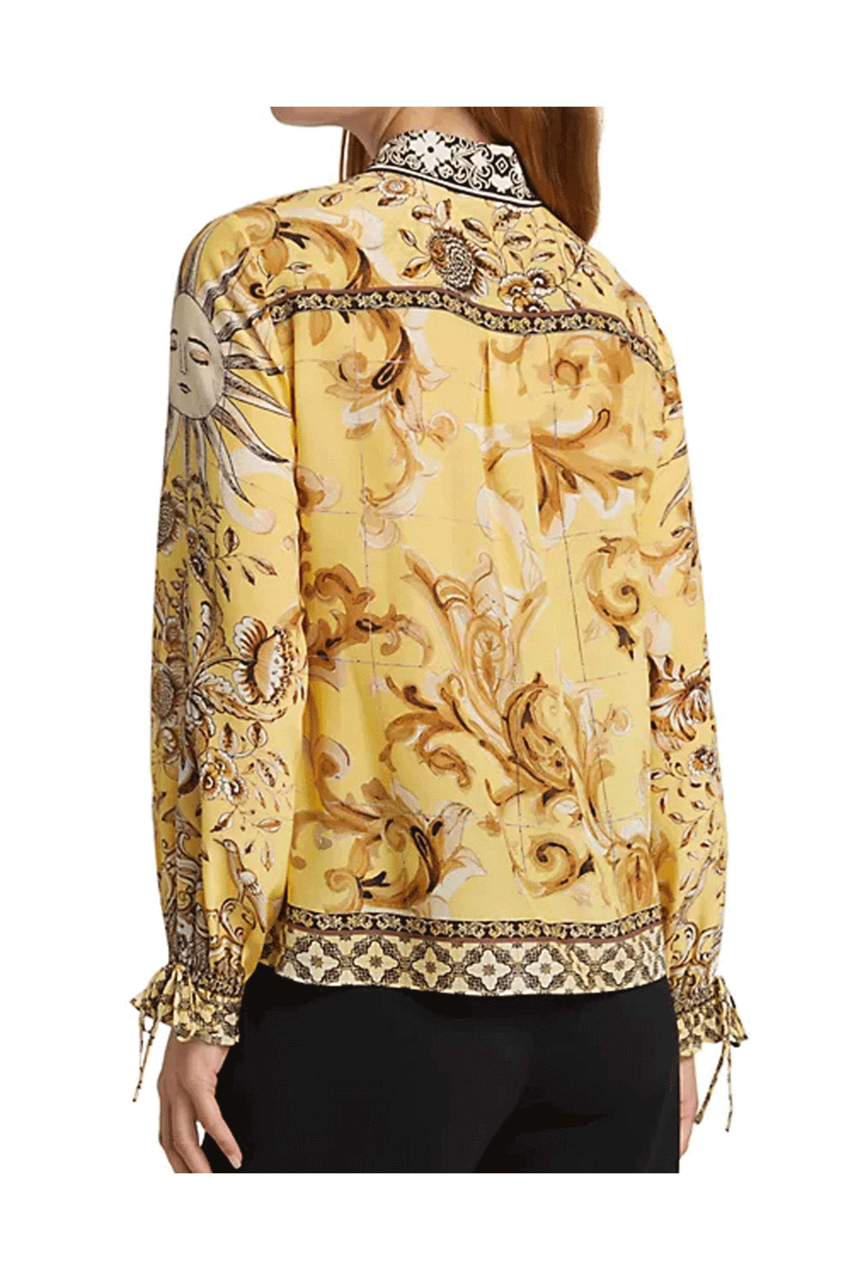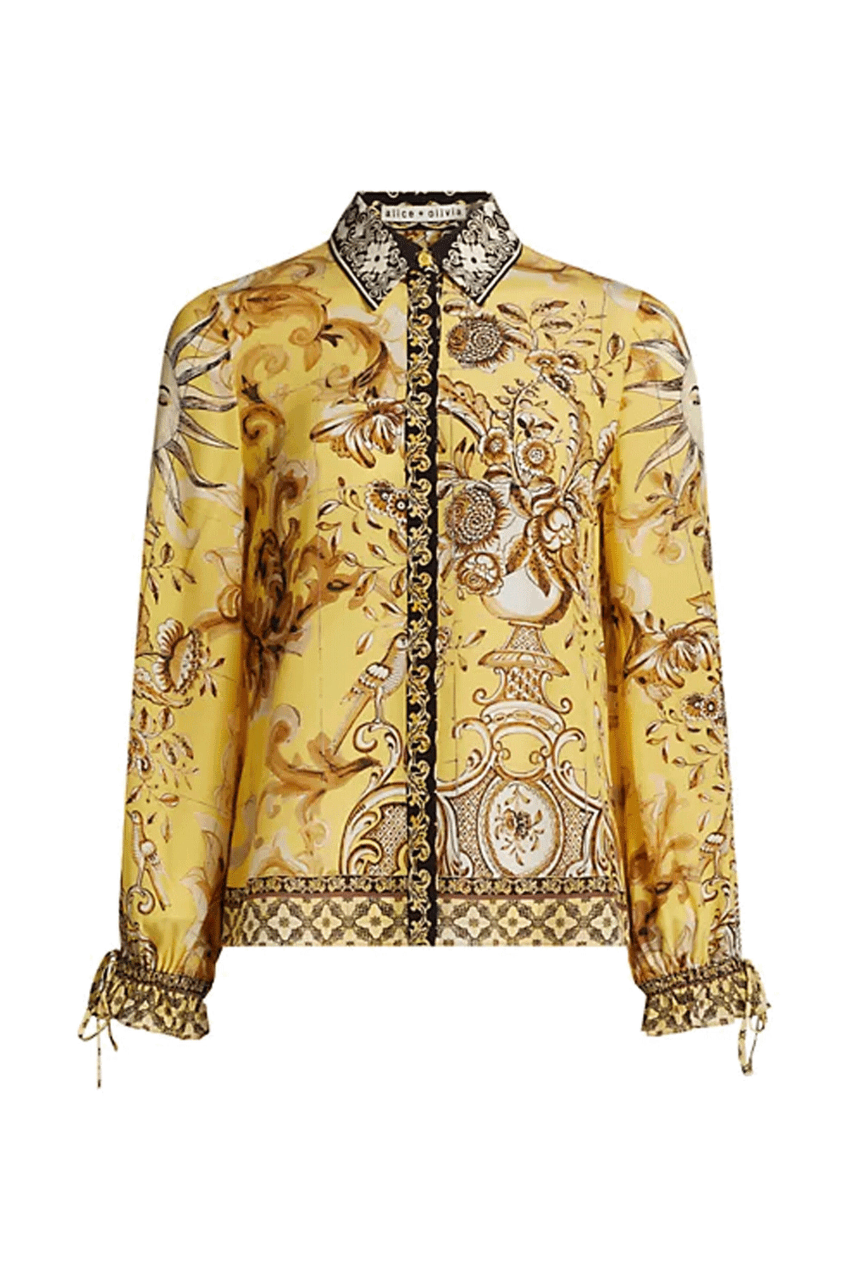 Alice + Olivia Balloon Sleeve Top in Lemon Meringue. Spread collar. Long sleeves, tie cuffs. Back box pleat. Concealed button-front closure. Imported. 100% silk. Lining: 100% silk. Dry clean.