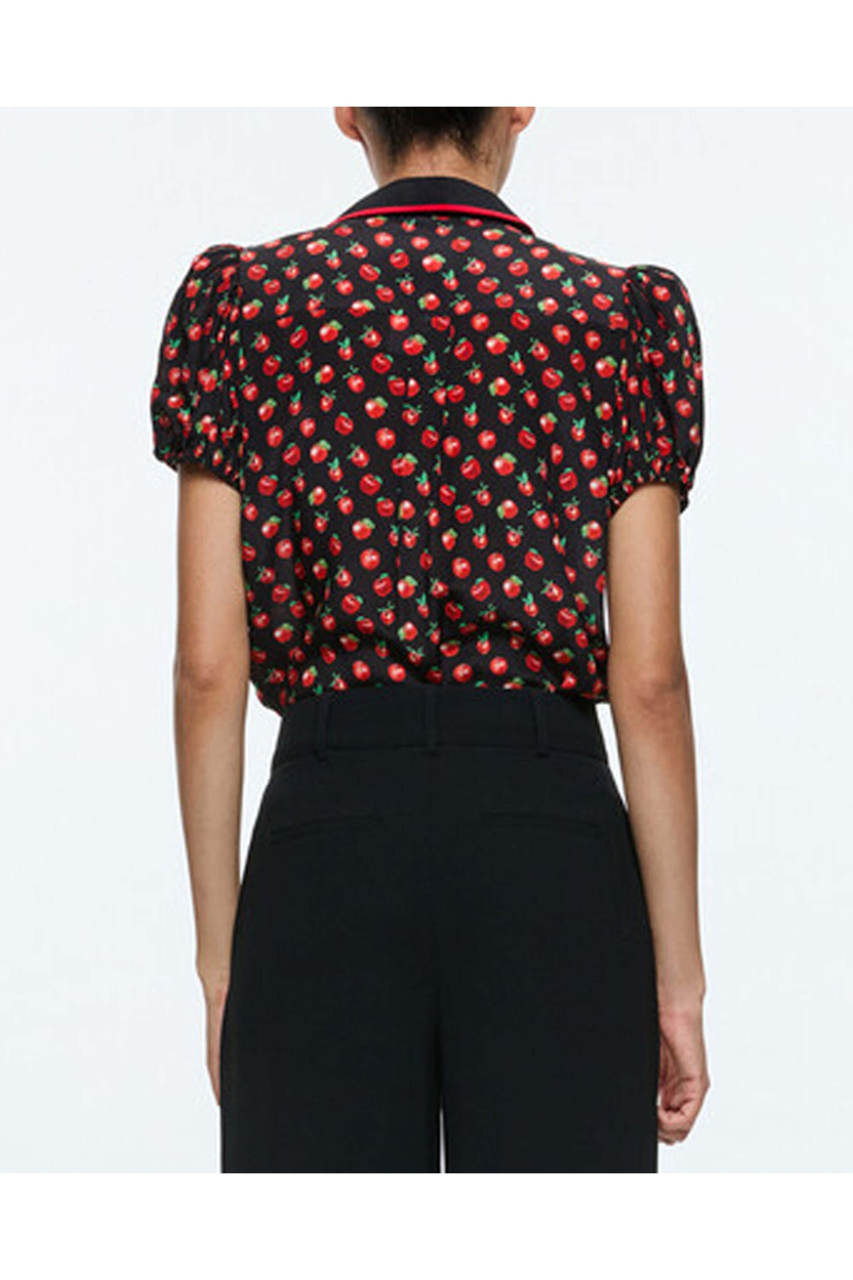 Alice + Olivia Pink Lady Apple Willa Blouse. Collar. Short puff sleeves. Concealed front button closure. Regular fit. 100% silk.