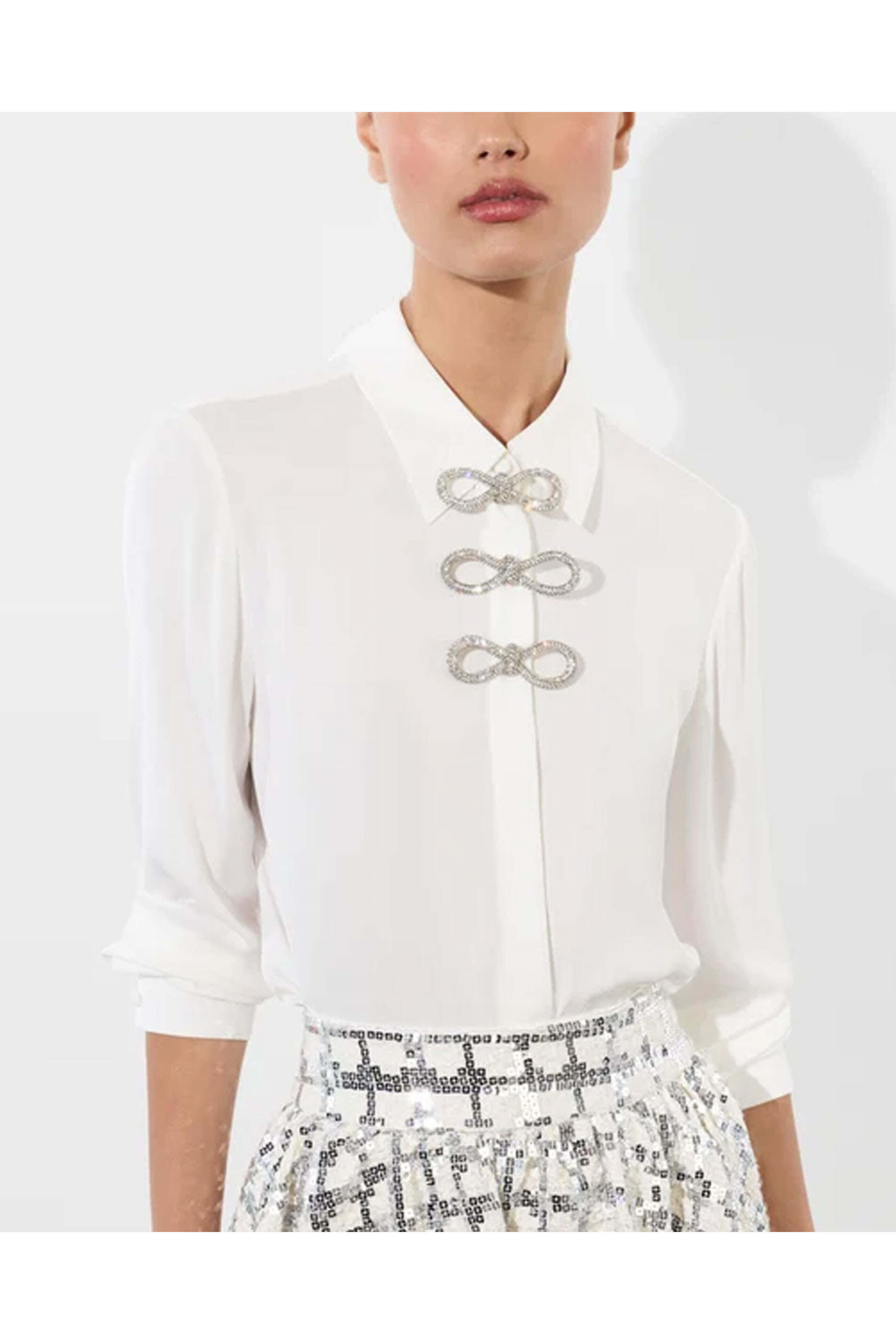 Alice + Olivia Off White Willa Top with Embellished Bow Detail . Blouse . Collared . Button down . Hidden placket . Embellished bow . Imported . 100% viscose . Dry clean only .
