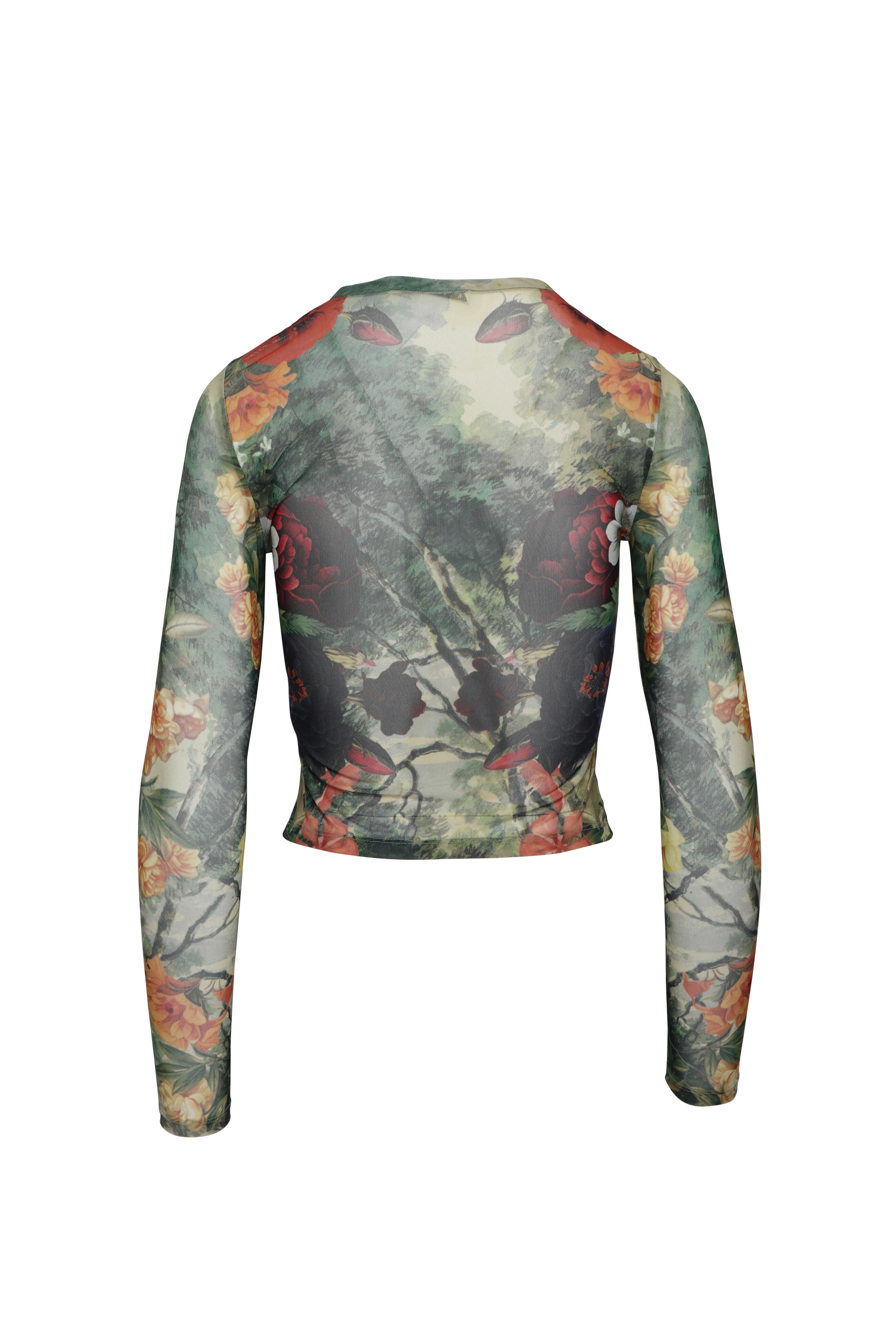 Round neck. Long sleeves. Slim silhouette. Straight silhouette. Mesh fabrication. Imported. Length 19.25” (Size XS). 90% polyester, 10% elastane. Dry clean.