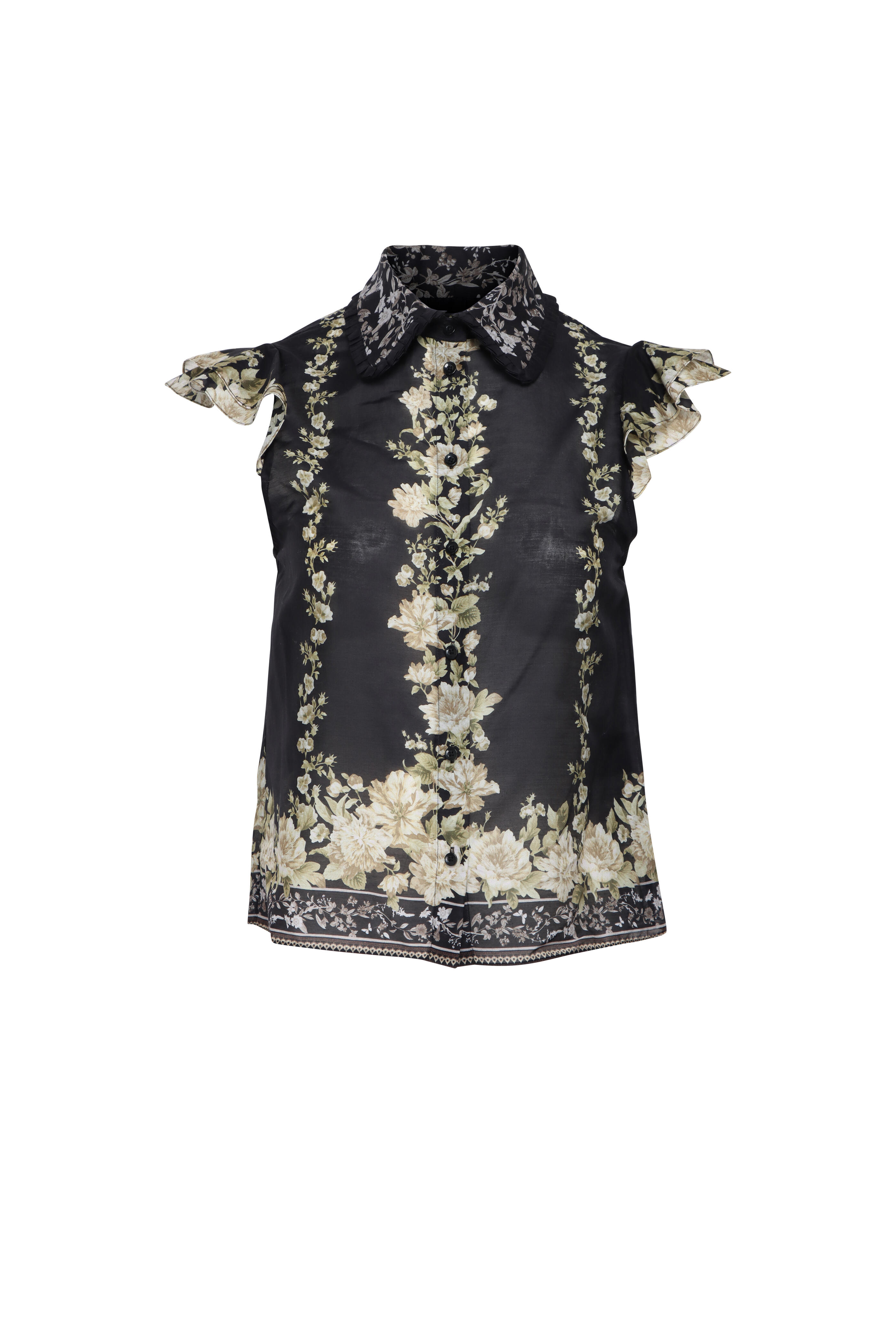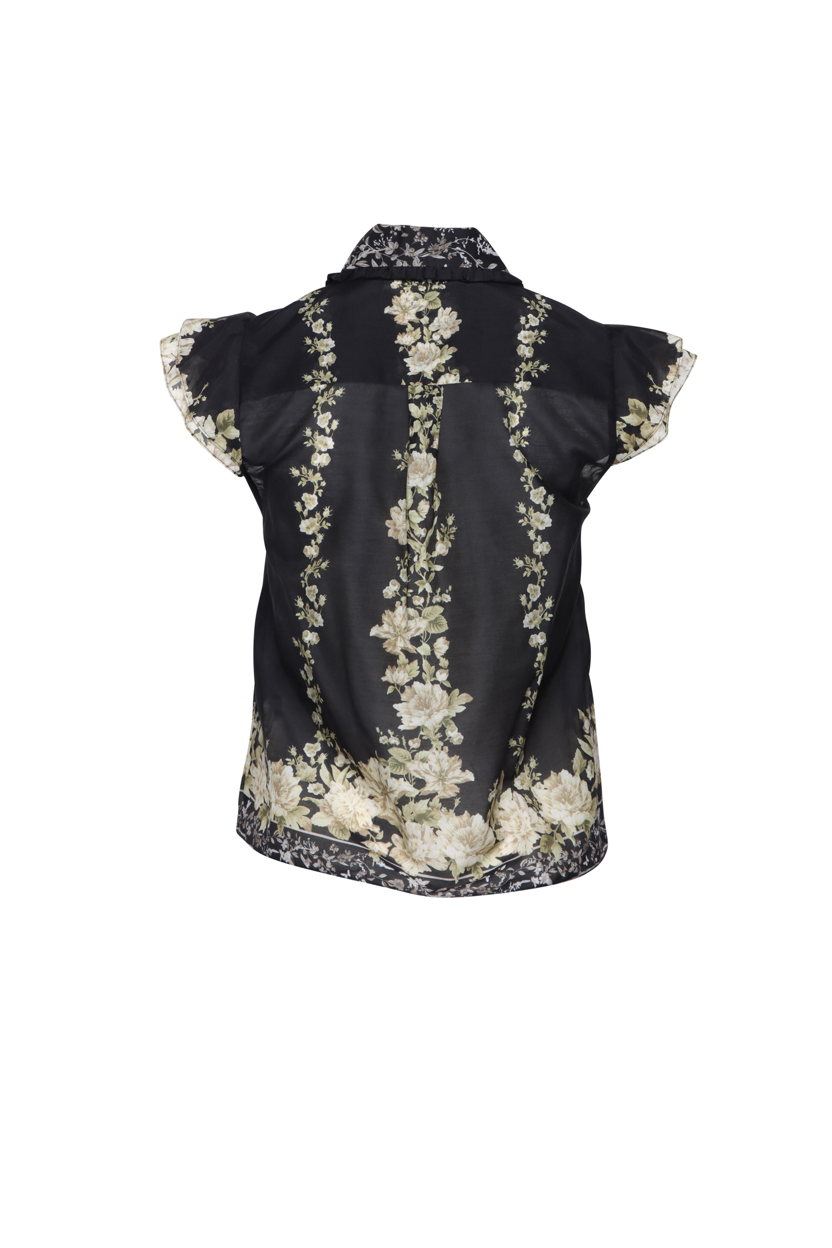 Collar. Short flutter sleeves. Front button closure. Relaxed fit. Organza fabrication. Imported. Length 23” (Size XS). 70% cotton, 30% silk. Dry clean.