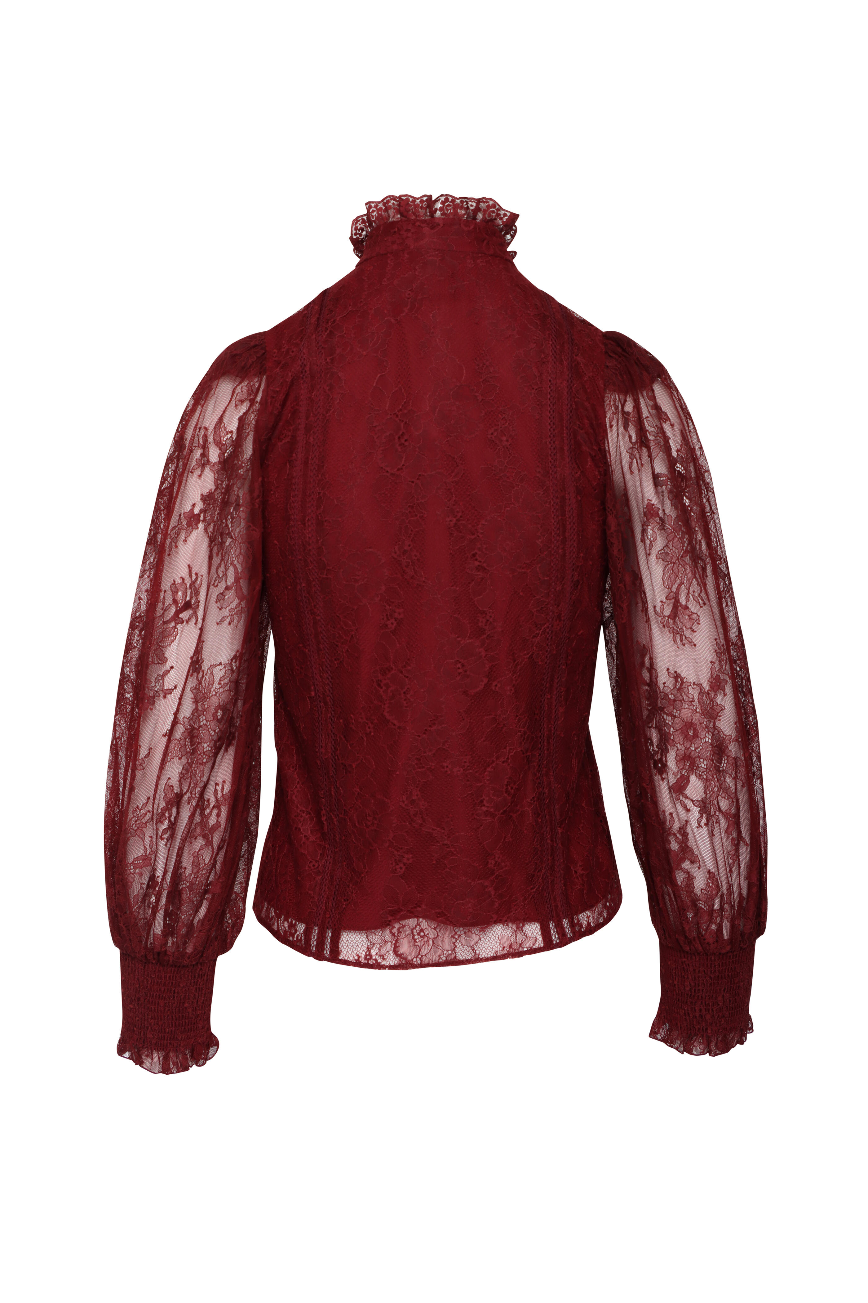 Mockneck. Long blouson sleeves; smocked cuffs. Button front closure; ruffle at placket. Lace fabrication. Imported. Length 23” (Size XS). 100% nylon; lined. Dry clean.