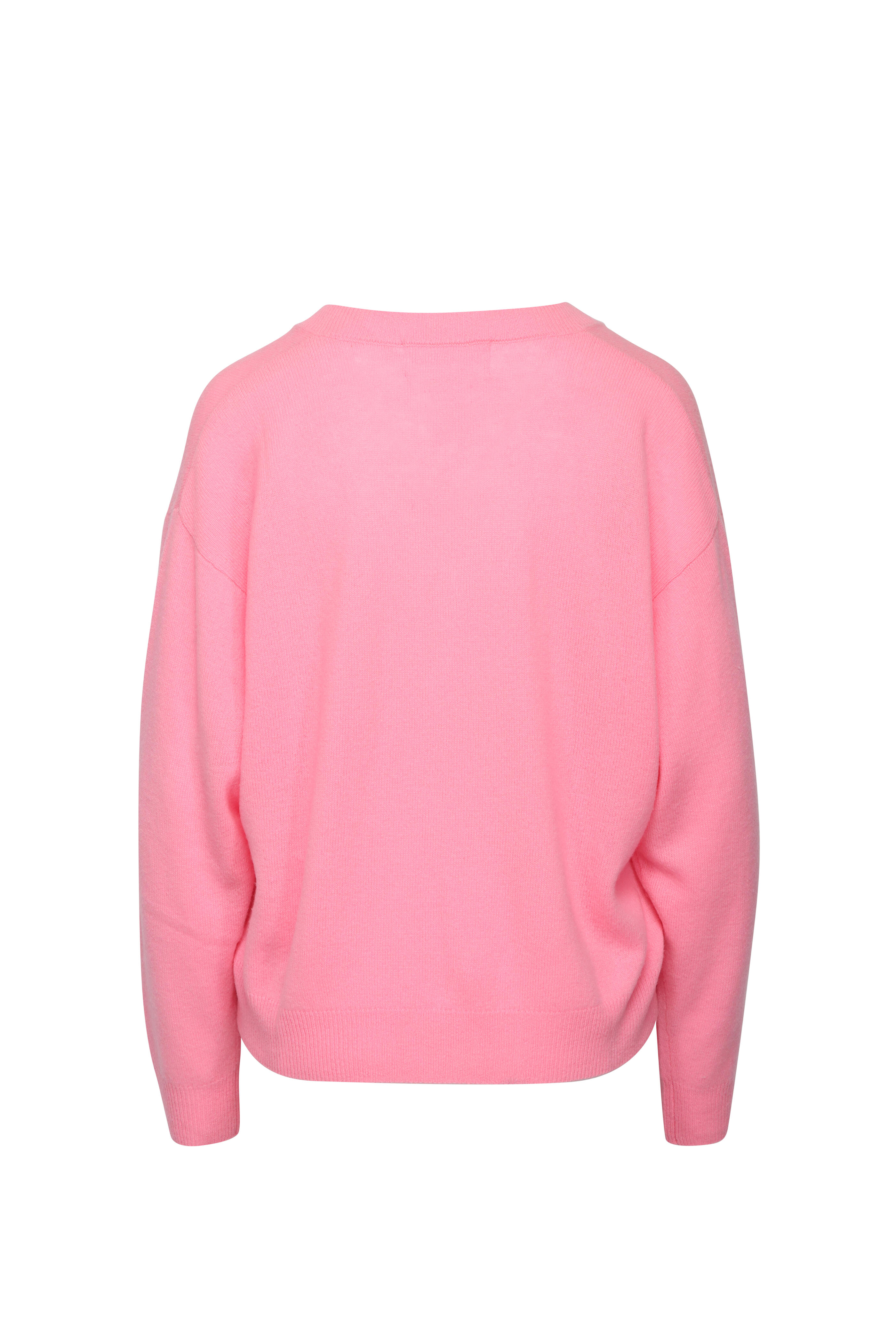 V neck. Drop shoulders. Long sleeves. Relaxed fit. Rib neck, cuffs, and hem. Imported. 100% cashmere. Machine washable.