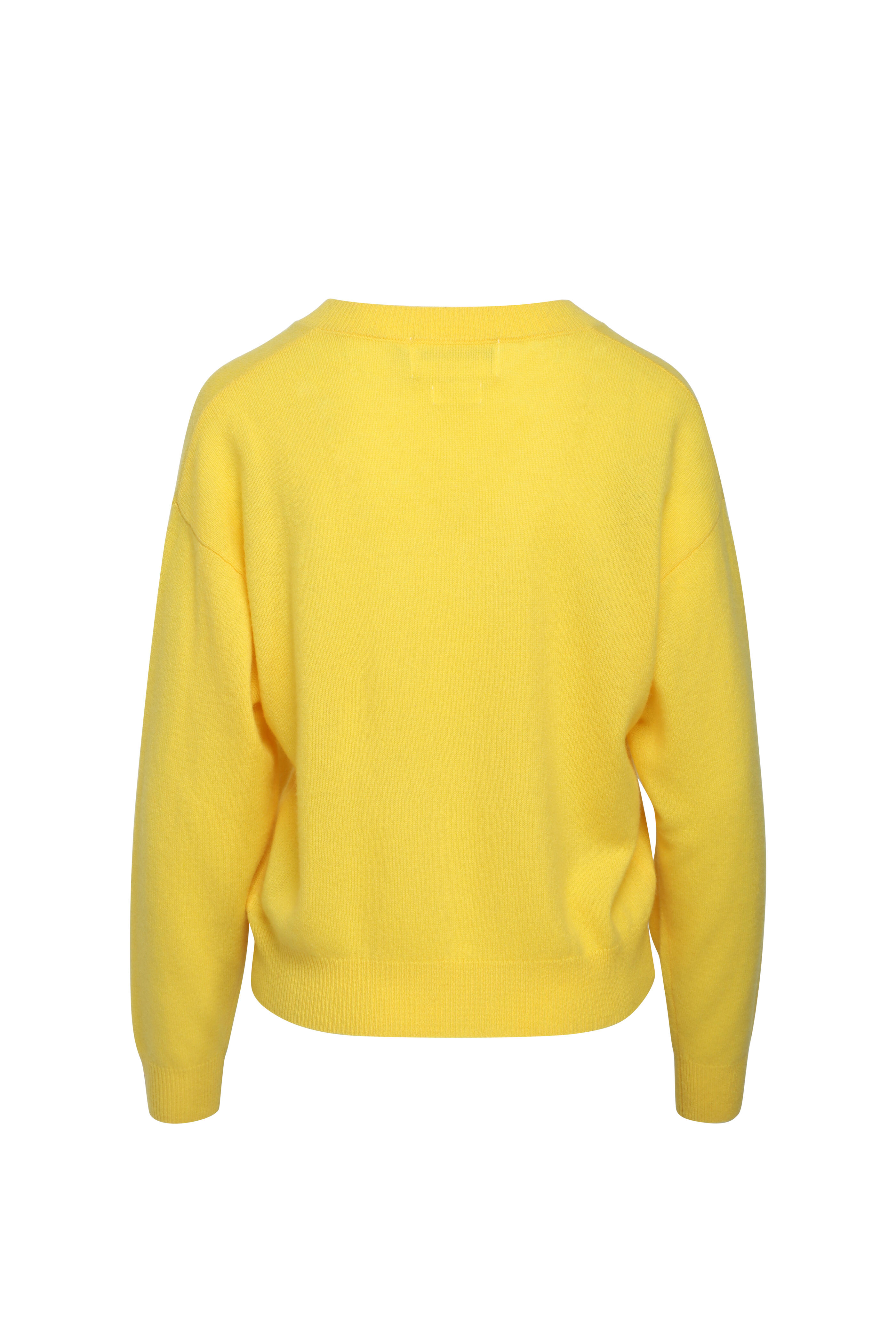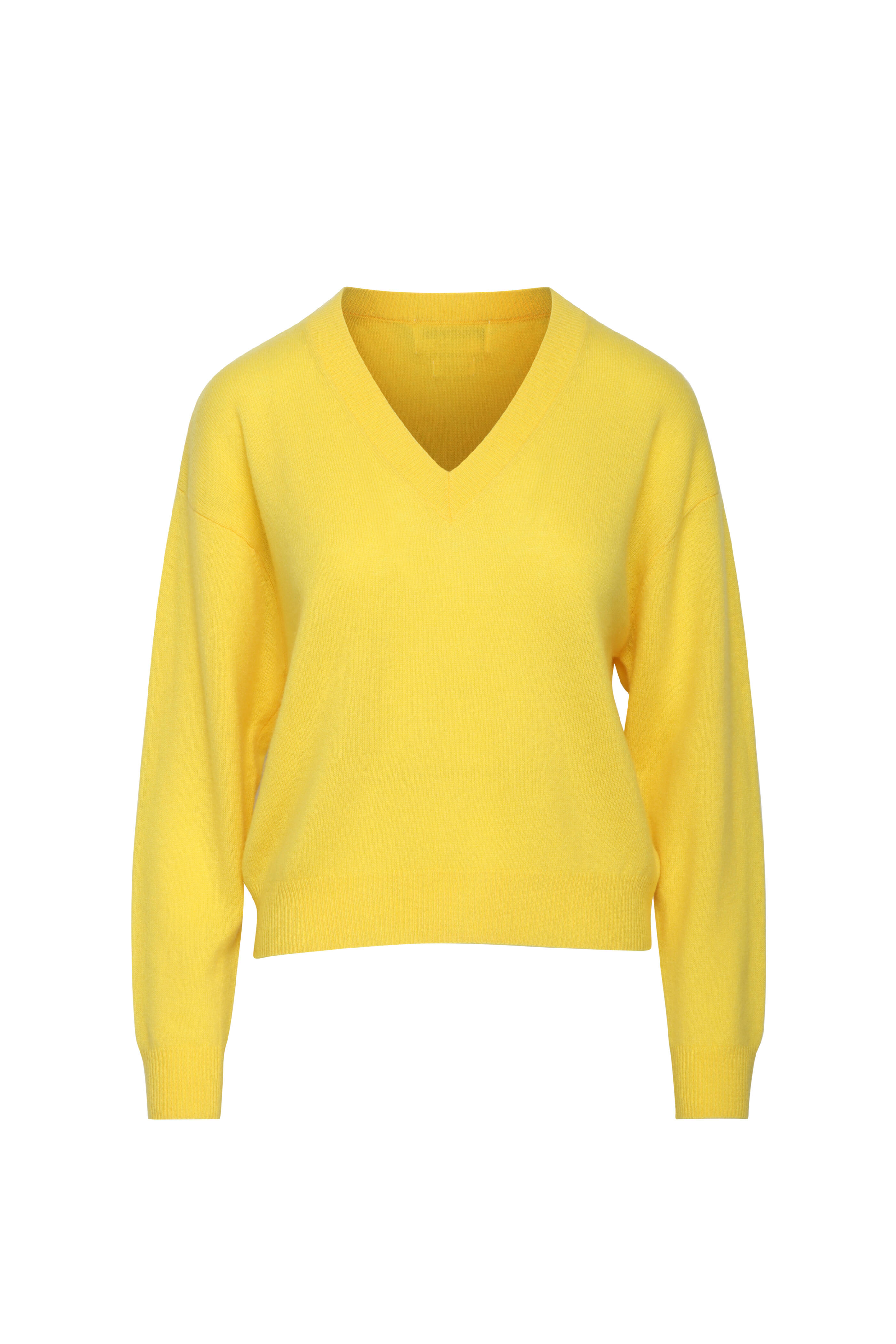 V neck. Drop shoulders. Long sleeves. Relaxed fit. Rib neck, cuffs, and hem. Imported. 100% cashmere. Machine washable.