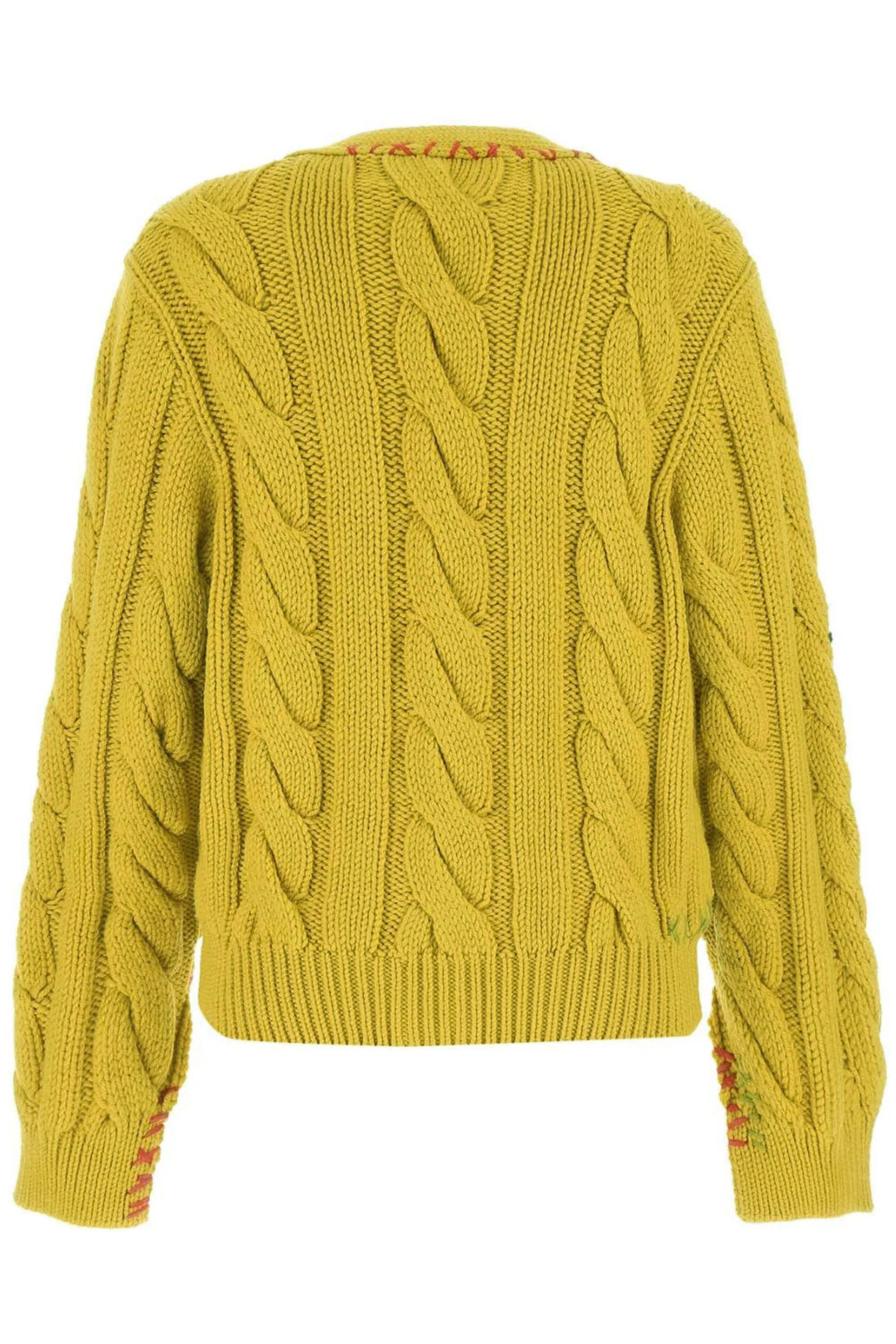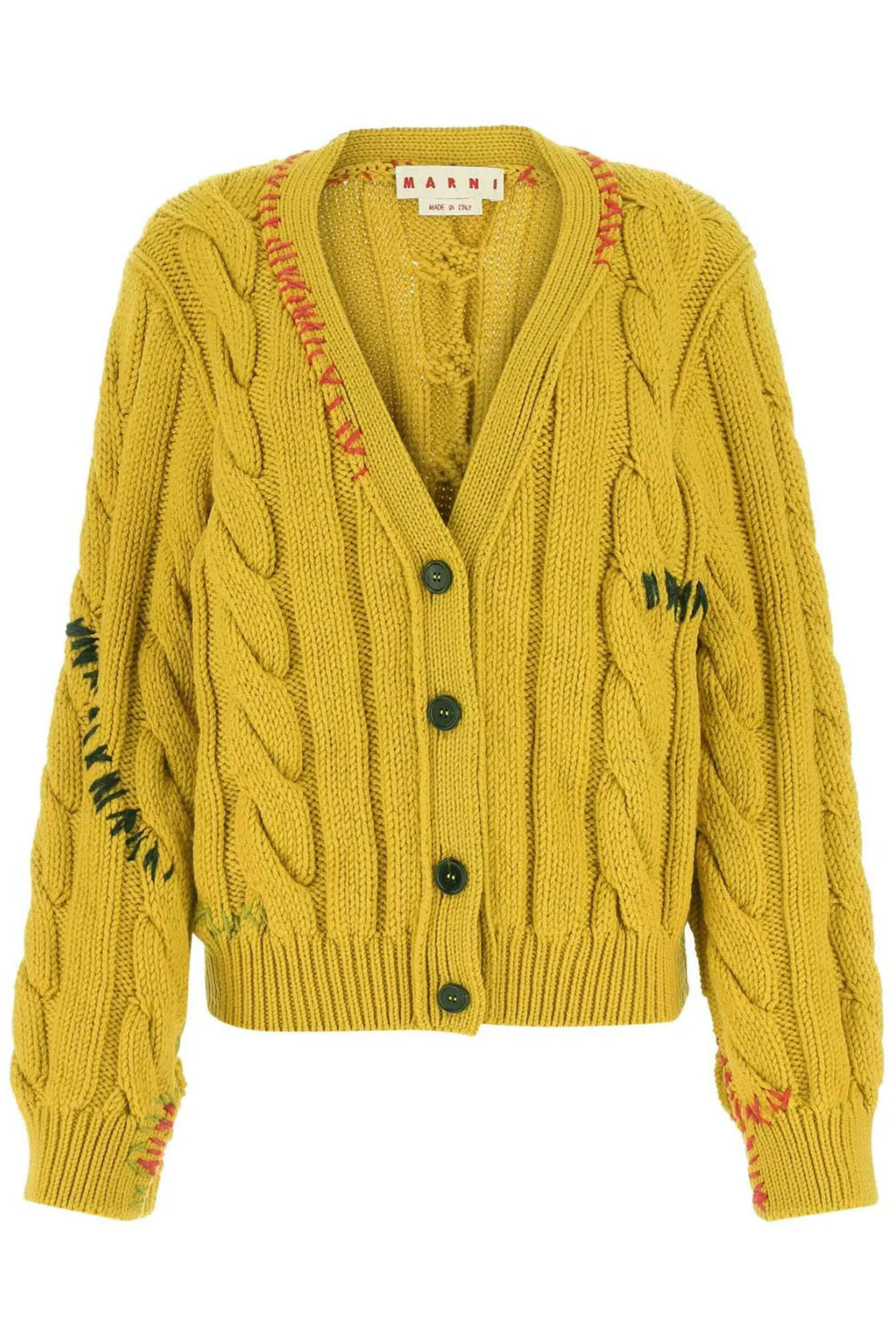 Marni Chartreuse Cable Knit Cardigan. V neck. Long sleeves. Button down front closure. Cable knit fabrication. Ribbed cuffs and hem. Relaxed fit. Embroidered detail throughout. Made in Italy. 100% virgin wool.