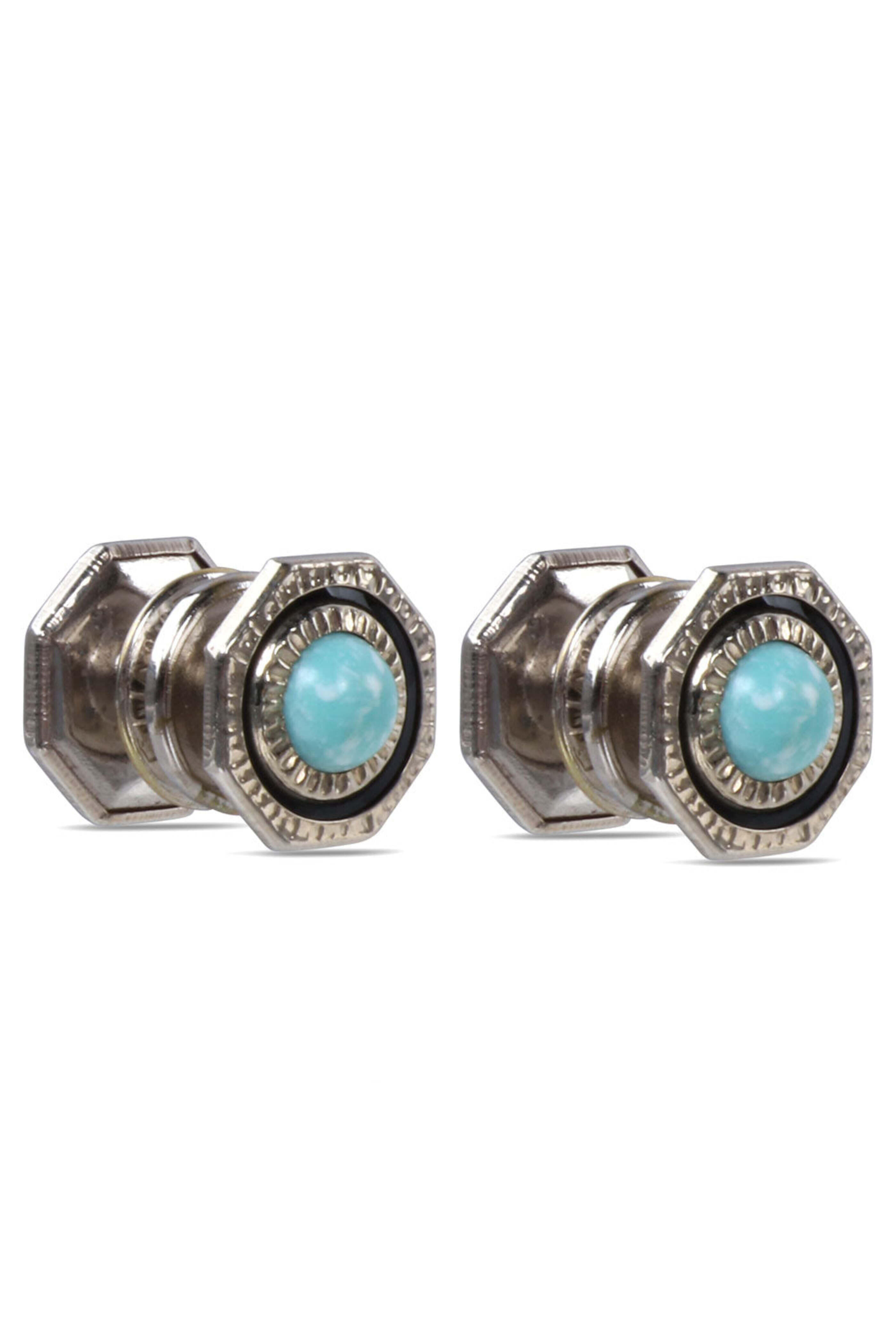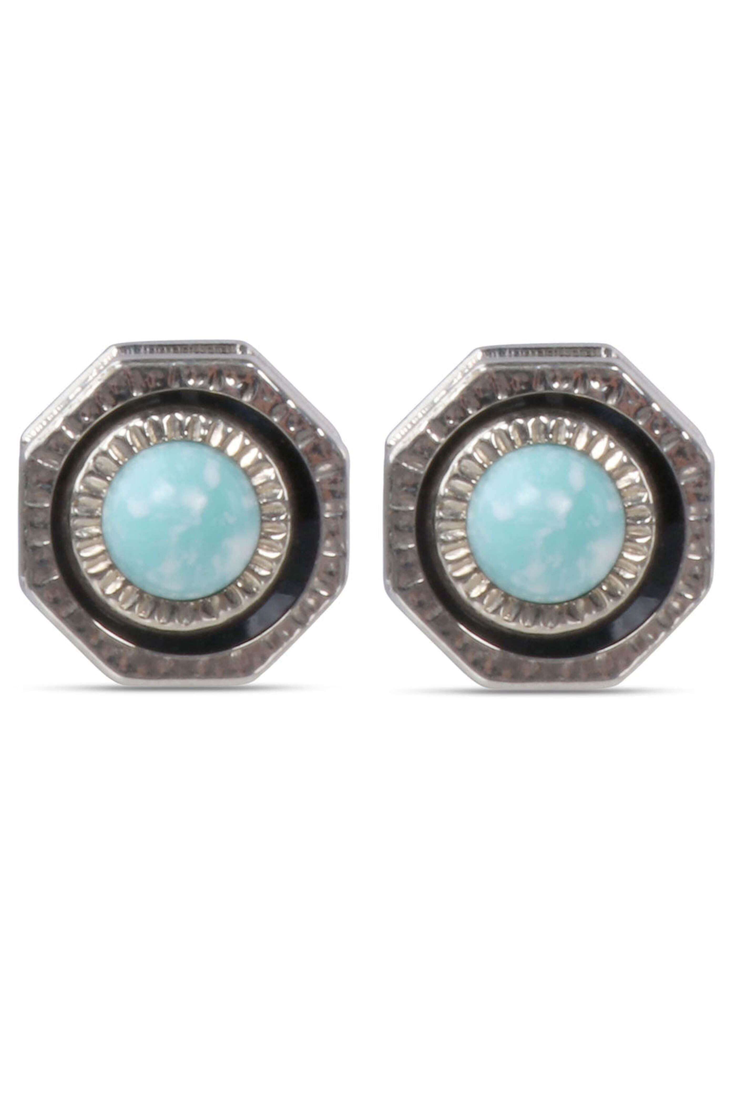 Turquoise. Cabochon. Black celluloid. Engraved. Double halo design. American C. 1920s. Snap Style.